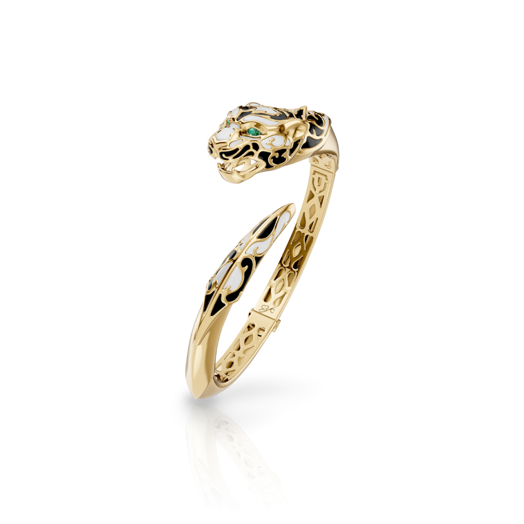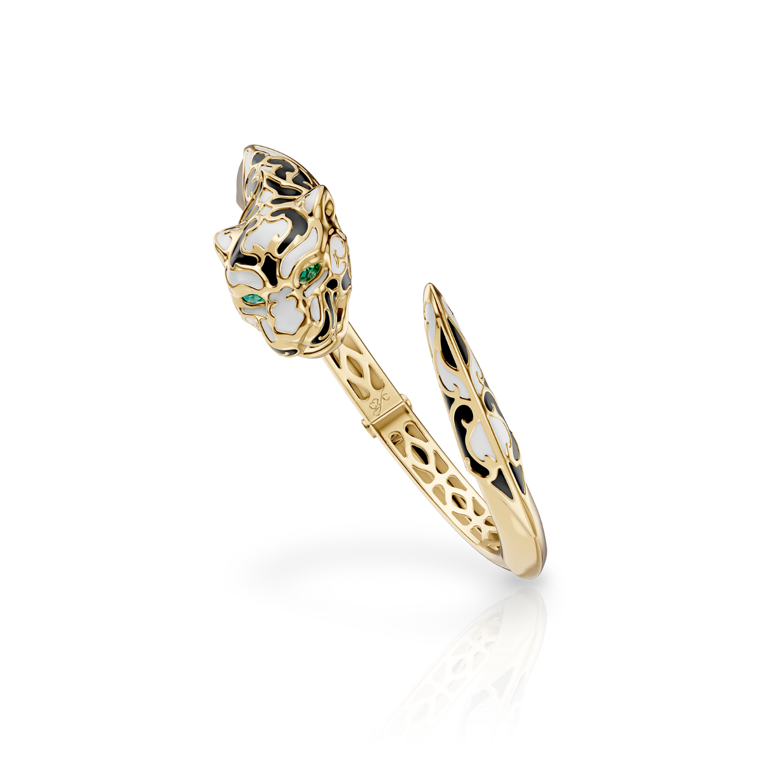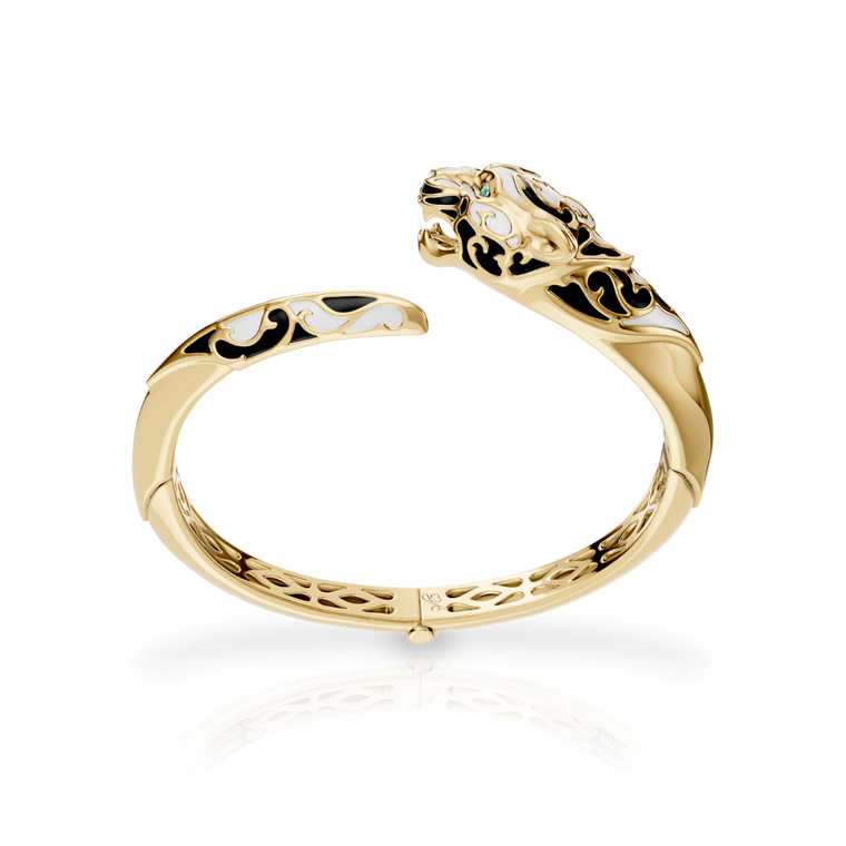 Discover the Bracelet ''Zodaria'' Color from the Origen Collection. Made from 18KT yellow gold, this exquisite bracelet features colorful enamel and sparkling emeralds. With an average weight of 31.44 grams, it adds a touch of luxury and elegance to any outfit.
