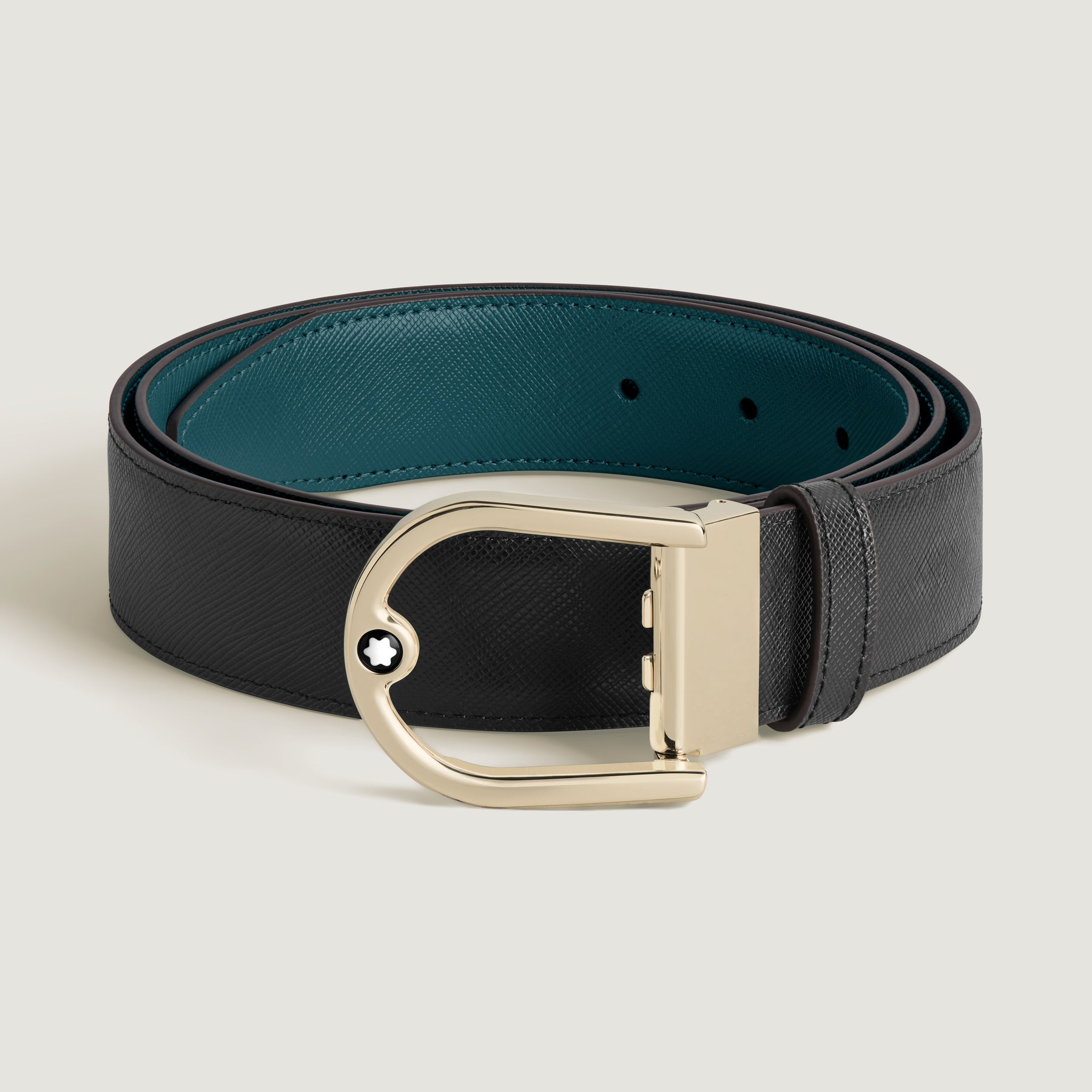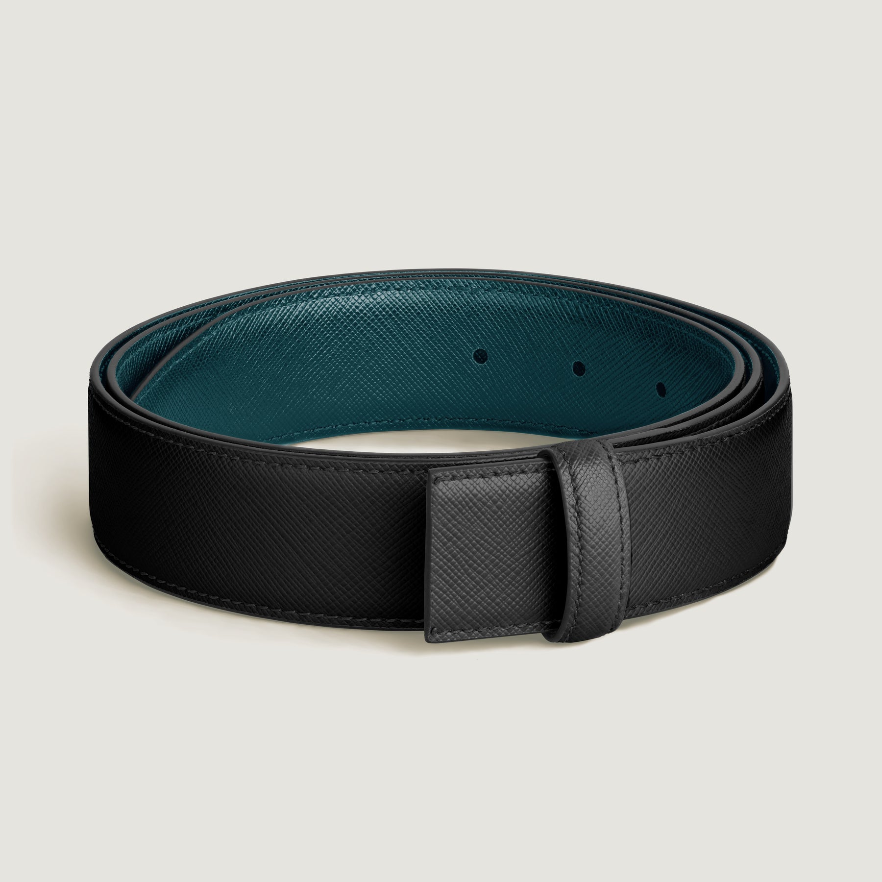 Regular price €170 Vat included. Shipping calculated at checkout.Sophisticated and bold, this 35mm strap s a versatile accessory both for business and casual wear. Crafted in Saffiano-printed leather, the reversible strap introduces one side in an elegant black and the one in a vibrant cyprus blue.