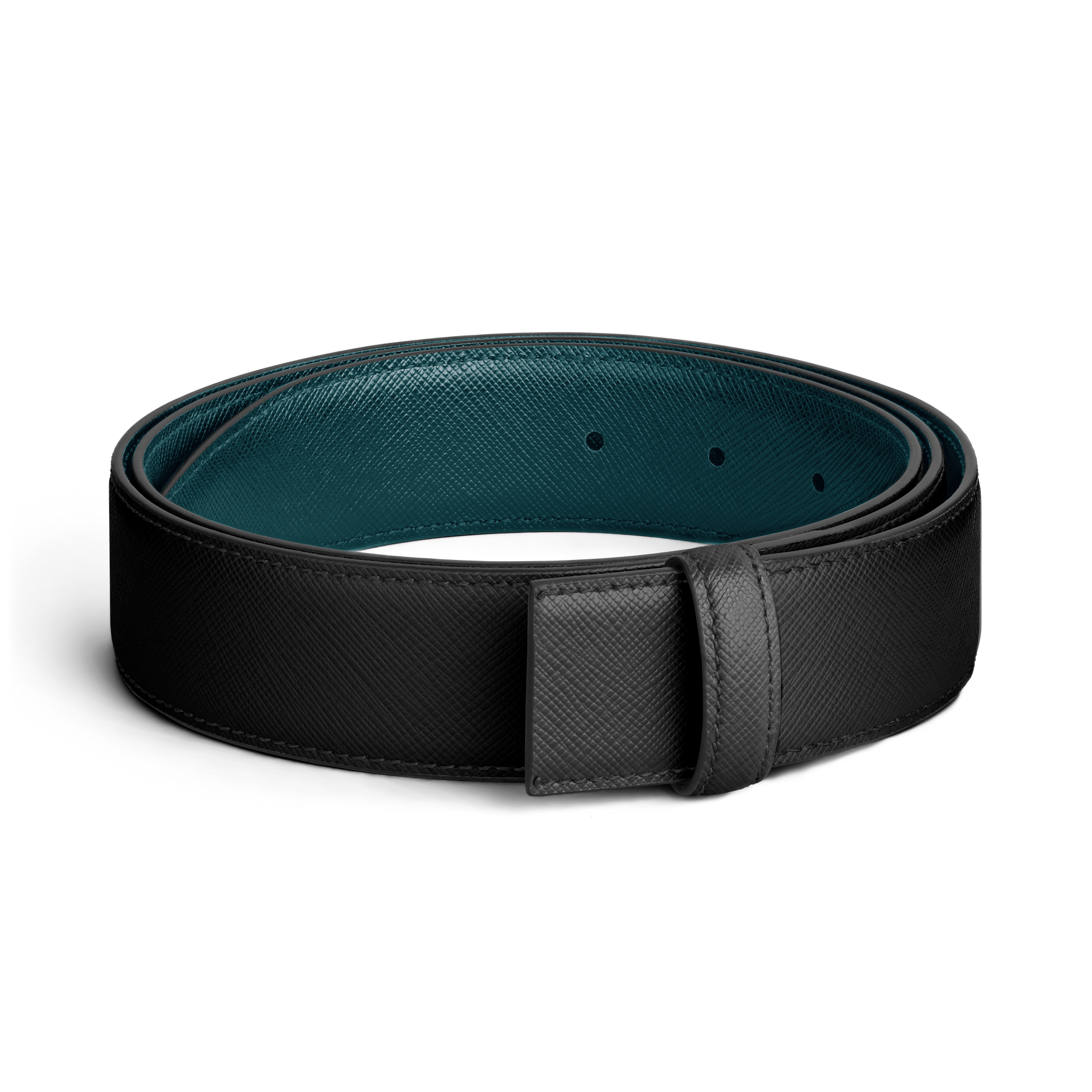 Sophisticated and bold, this 35mm strap s a versatile accessory both for business and casual wear. Crafted in Saffiano-printed leather, the reversible strap introduces one side in an elegant black and the one in a vibrant cyprus blue.