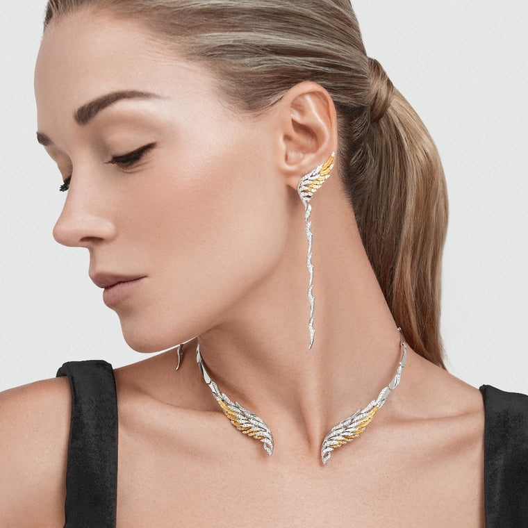 Experience the essence of nature with these exquisite earrings from the Vida collection. Crafted in 18KT yellow and white gold, they feature 198 dazzling diamonds with a total weight of 1.79 carats. With an average weight of 8.62 grams and a 45 cm chain, this piece embodies elegance, harmony and a tribute to the wild.