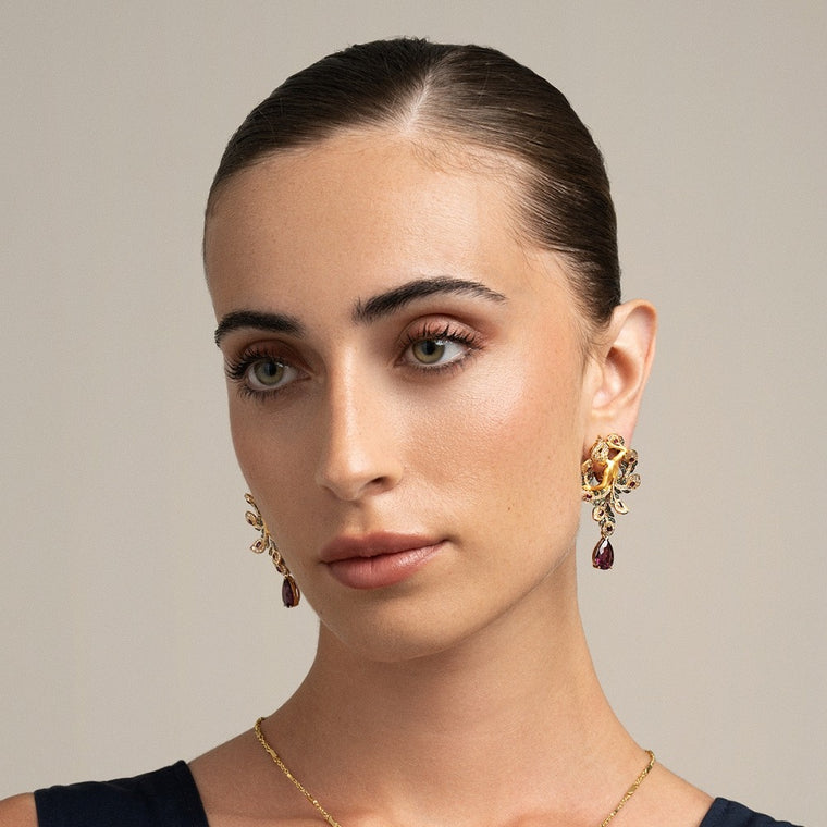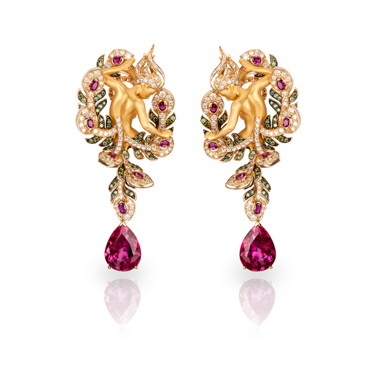 Exude sophistication with the Winged Beauty Small Earrings, crafted from 18KT yellow gold. Featuring white and green diamonds along with red rubies, these 27.65-gram earrings from the Versalles collection are perfect for any occasion.