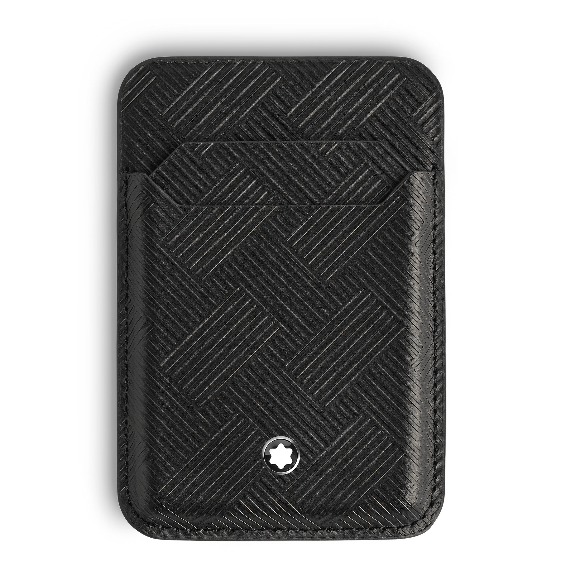 This Apple MagSafe-compatible smart leather wallet, crafted from black leather embossed with the iconic Extreme 3.0 motif, magnetically attaches to your phone or cover. Its compact rectangular design with rounded corners exudes modern sophistication. Key features include two dedicated credit card slots and the signature Montblanc emblem.