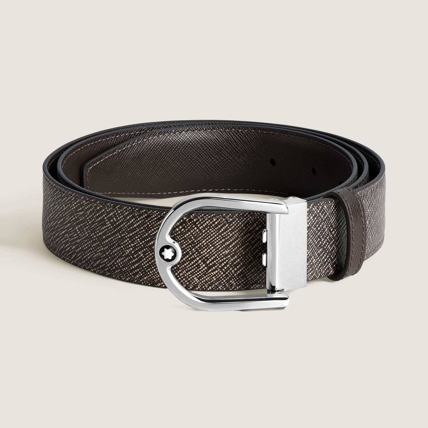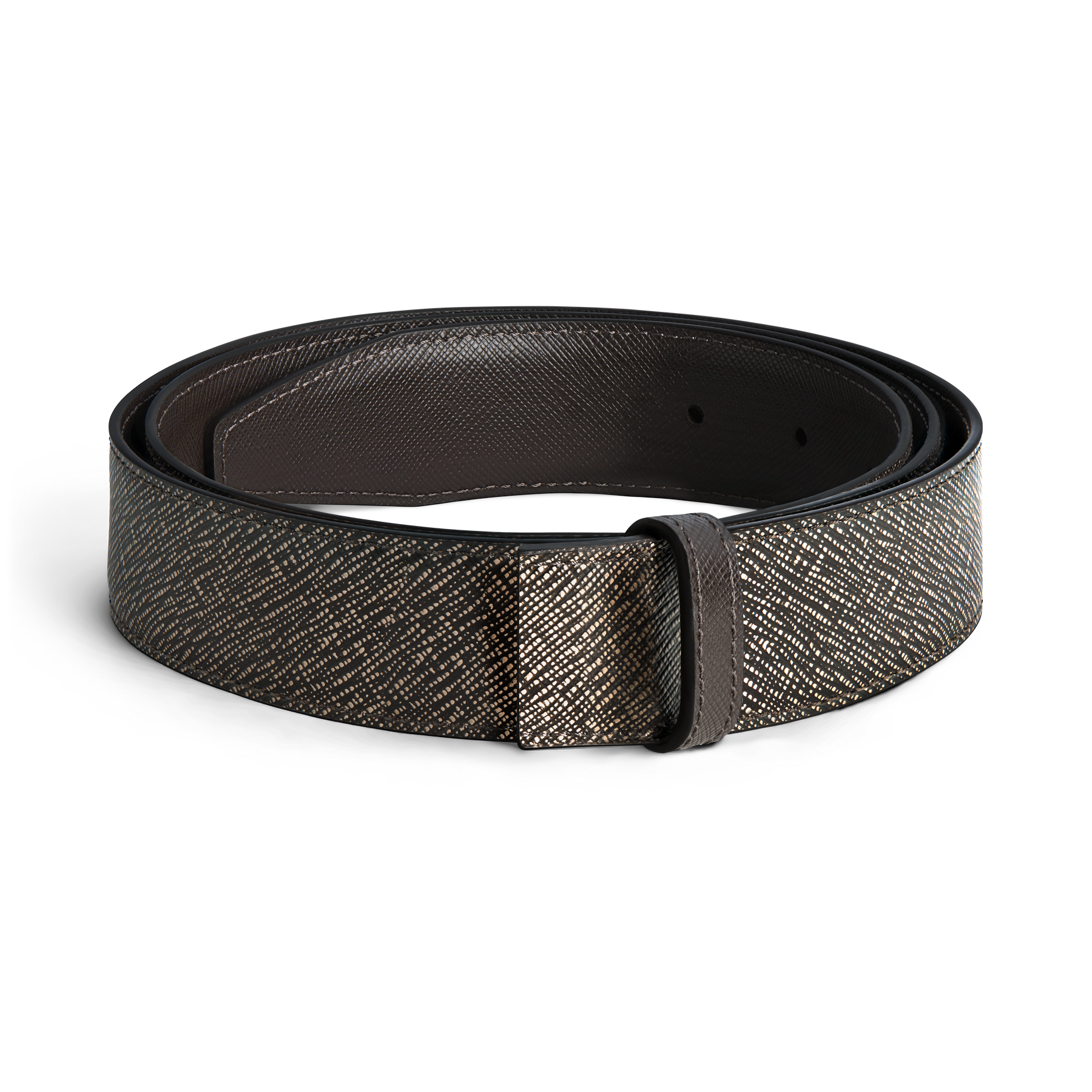 Sophisticated and contemporary, this 35mm strap is your go to accessory both for business and for nights out in the city. Crafted in Saffiano-printed leather, the reversible strap proposes an elegant look through the colours of gravel and testa moro.