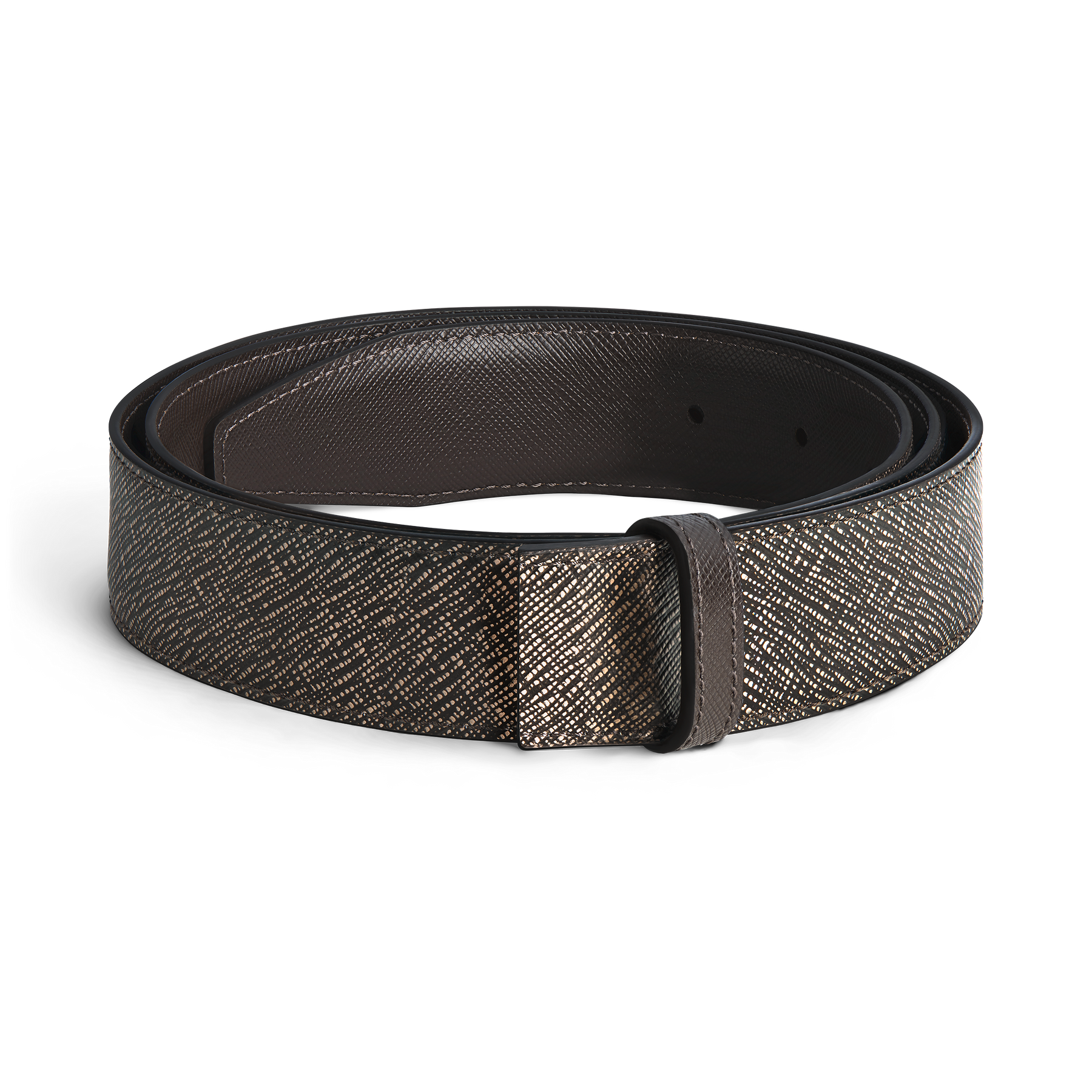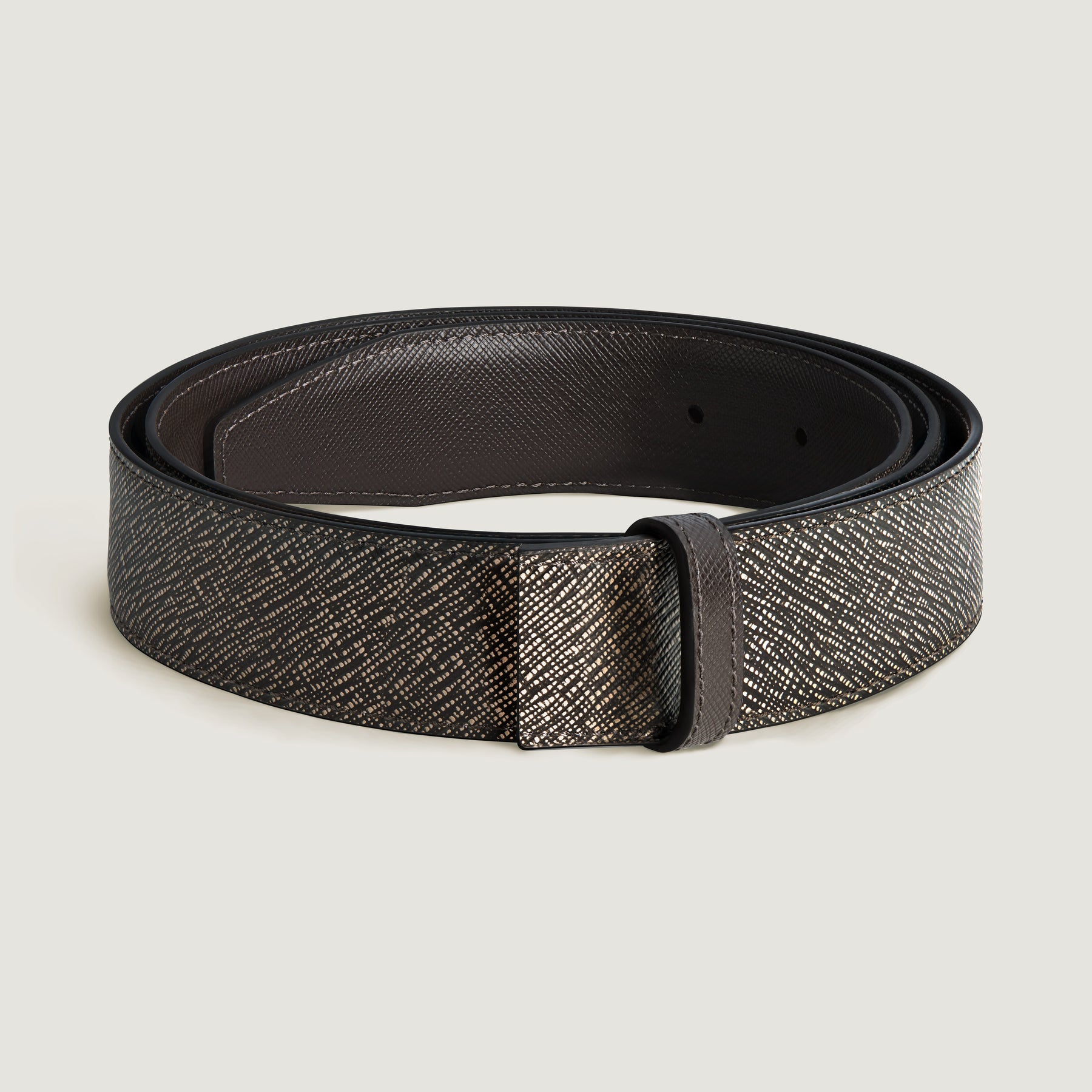 Regular price €170 Vat included. Shipping calculated at checkout.Sophisticated and contemporary, this 35mm strap is your go to accessory both for business and for nights out in the city. Crafted in Saffiano-printed leather, the reversible strap proposes an elegant look through the colours of gravel and testa moro.