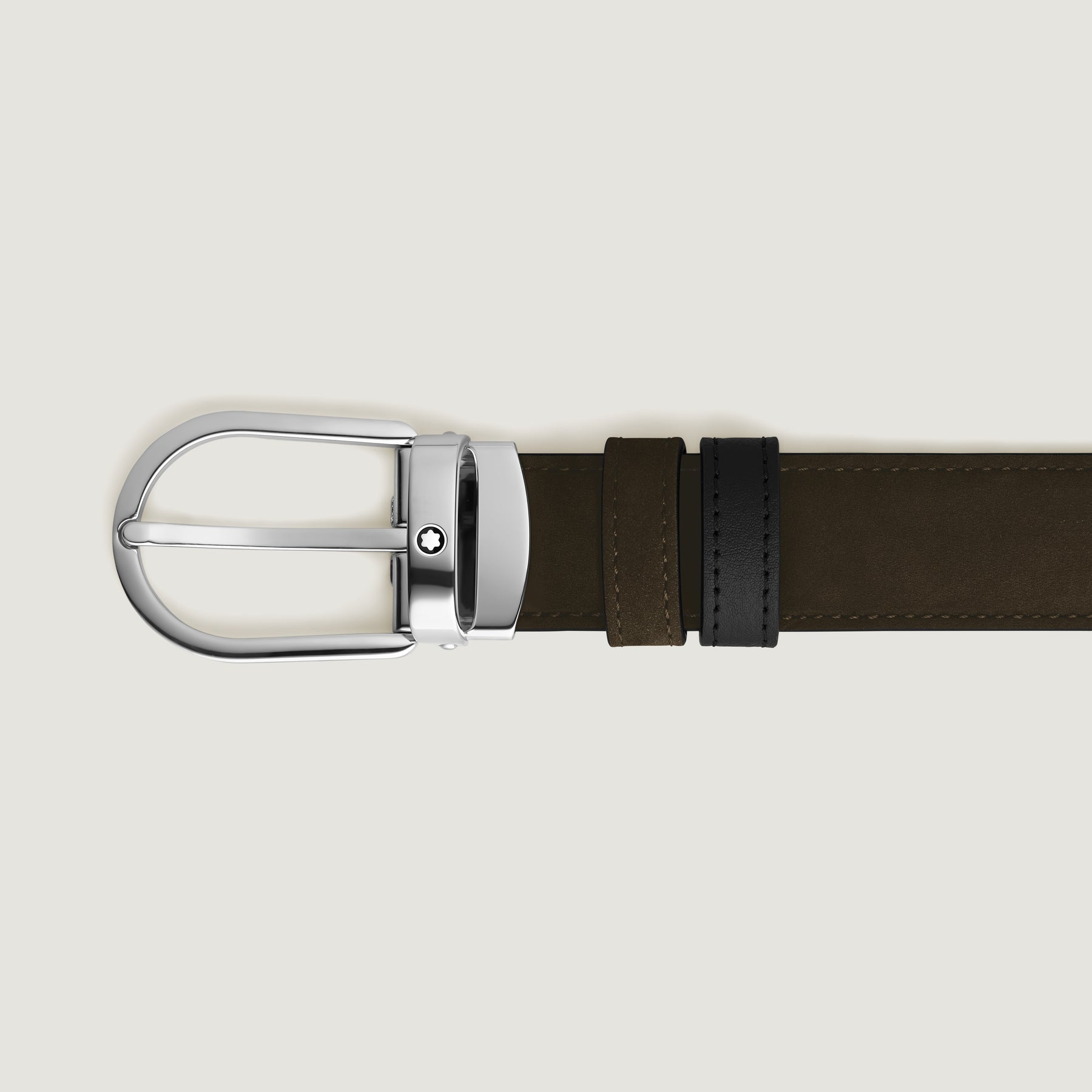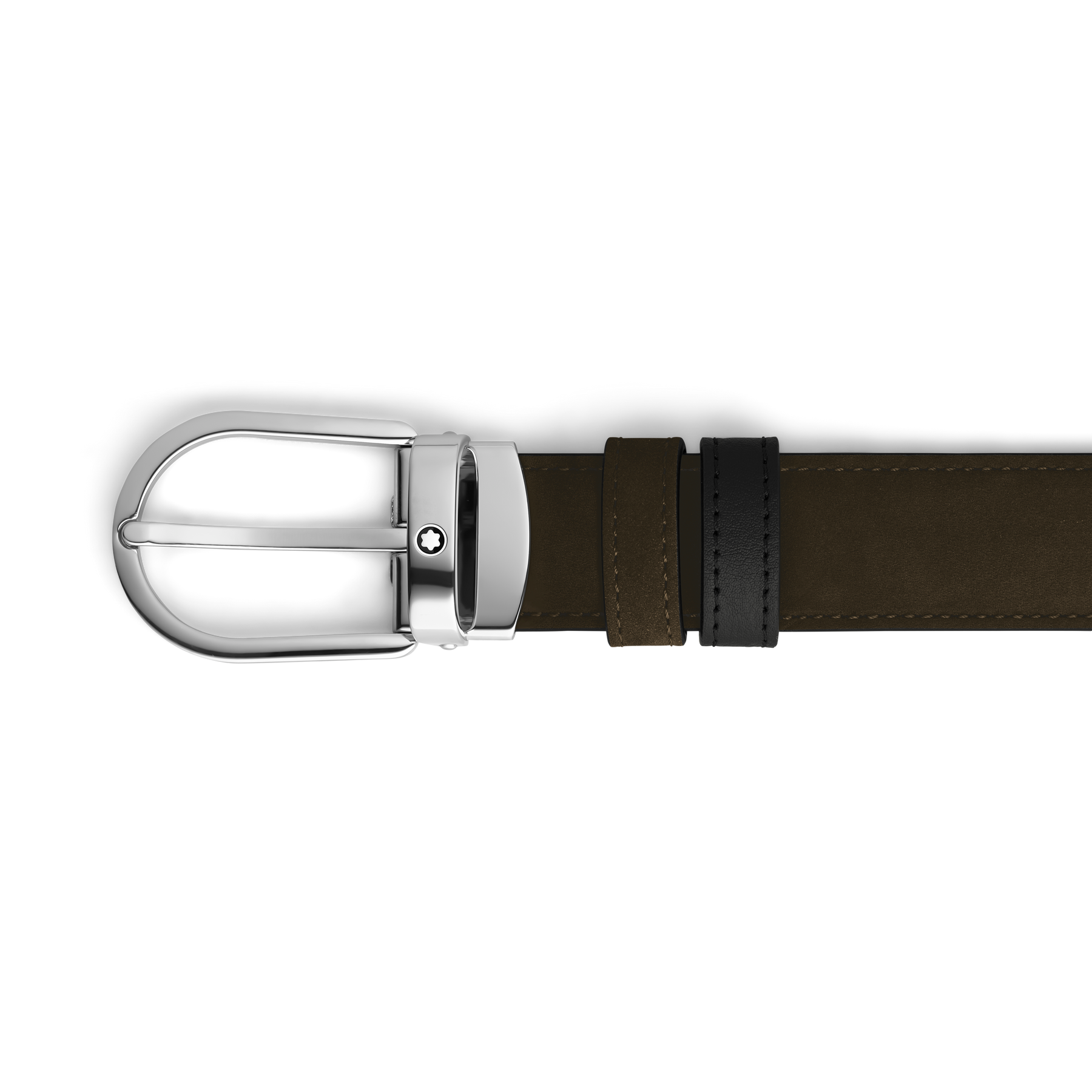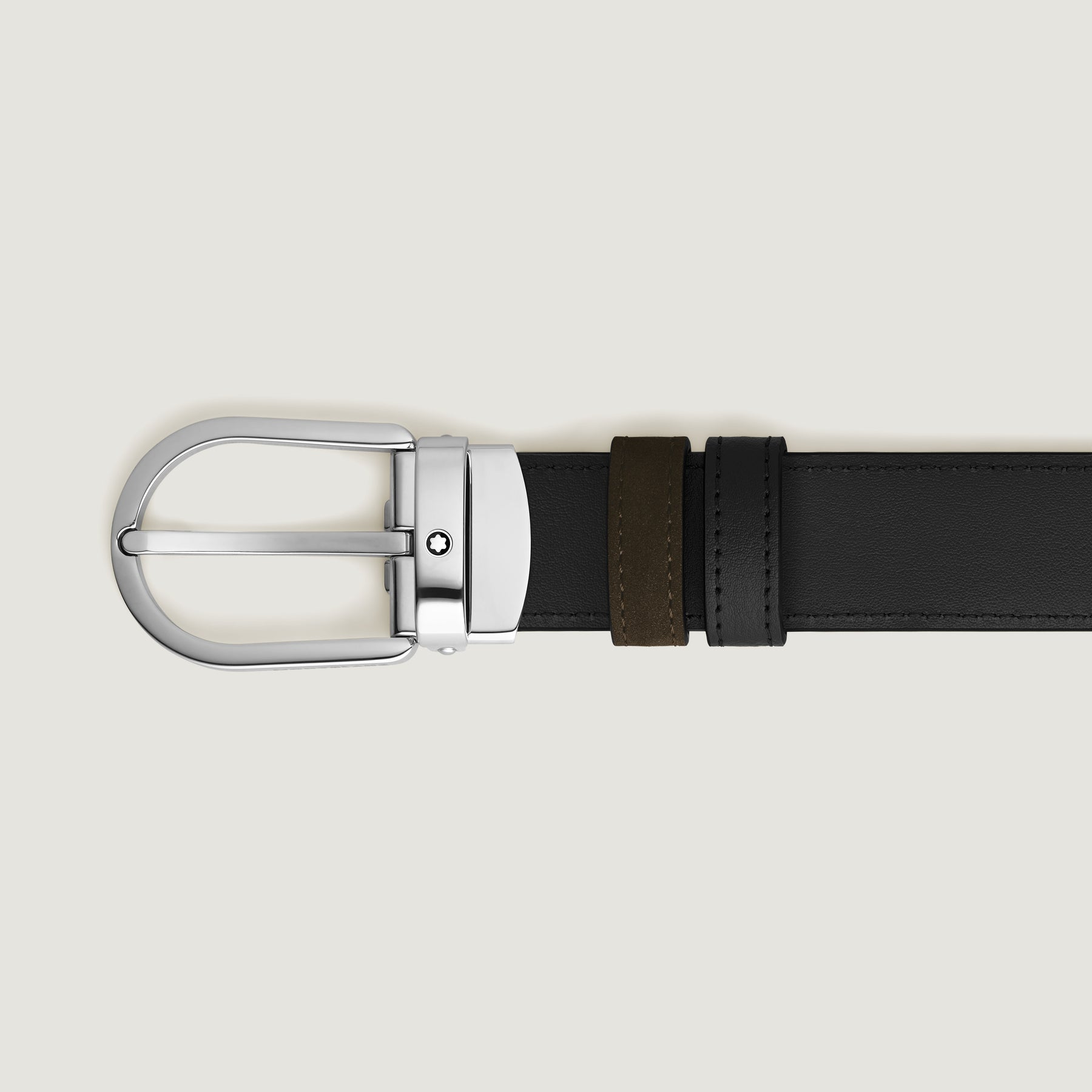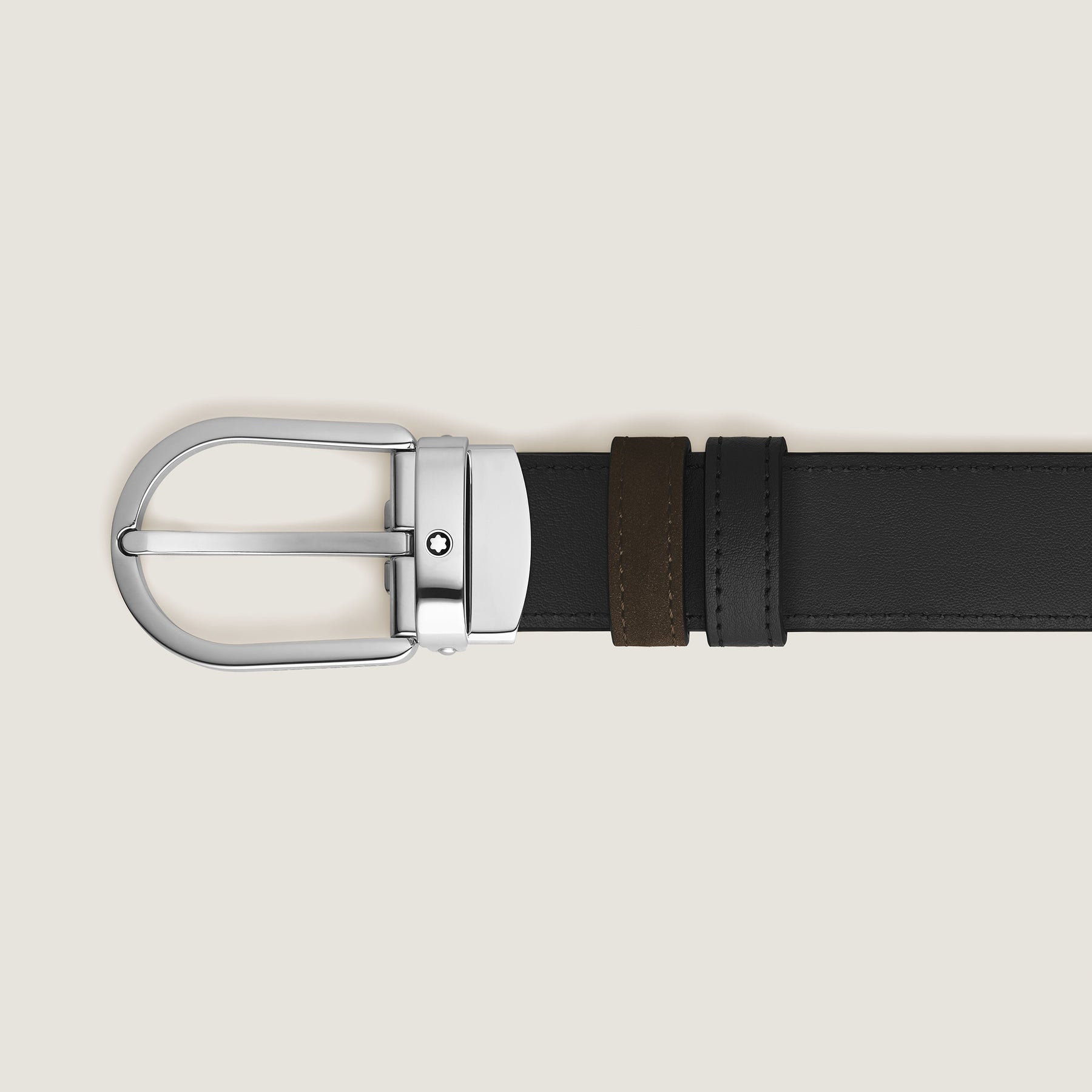 Regular price €350 Vat included. Shipping calculated at checkout.With soft to touch brown suede on one side and smooth black leather on the other, this reversible 30mm belt offers twice the style. The horseshoe buckle with a shiny palladium finish adds a timeless feel, completed by the Montblanc emblem.