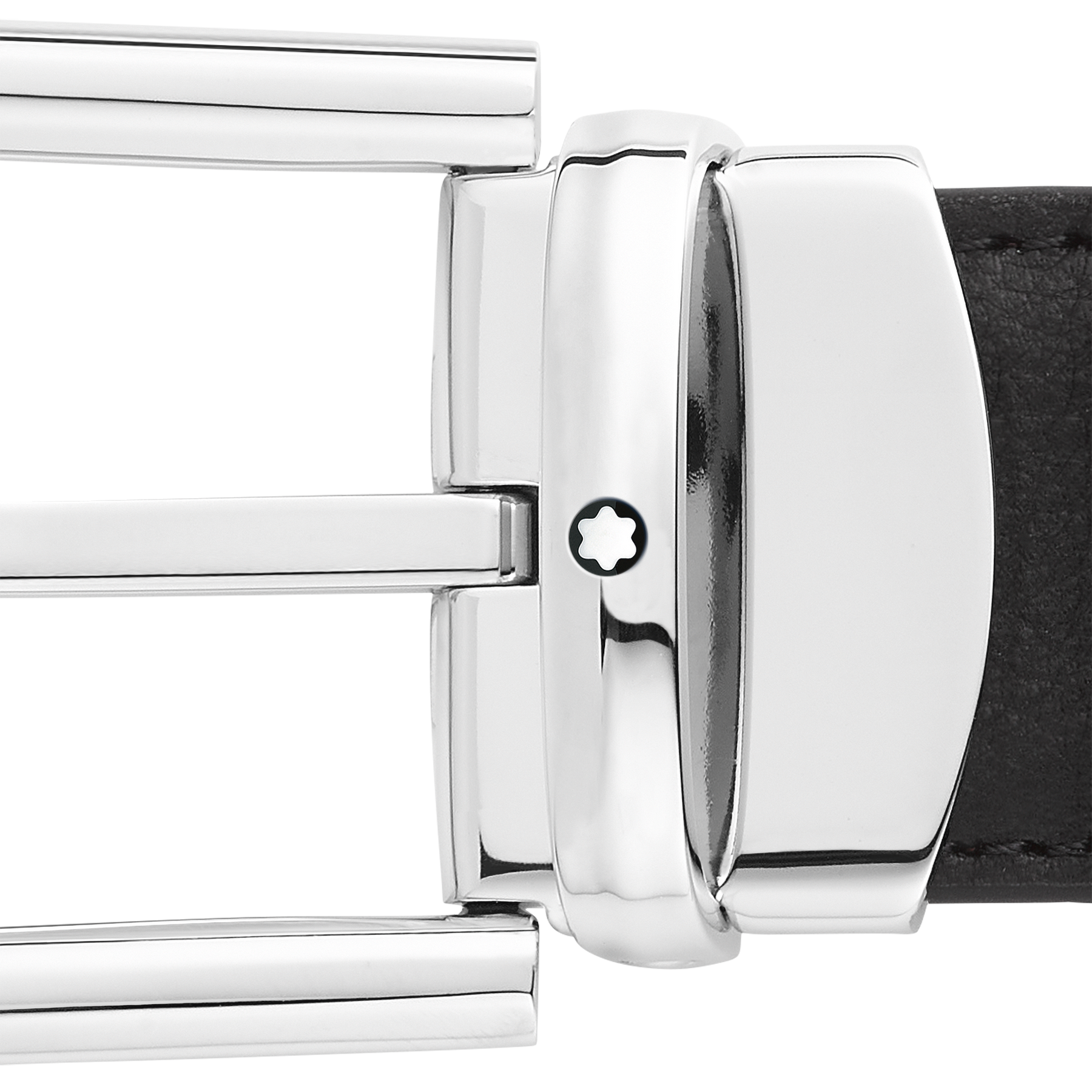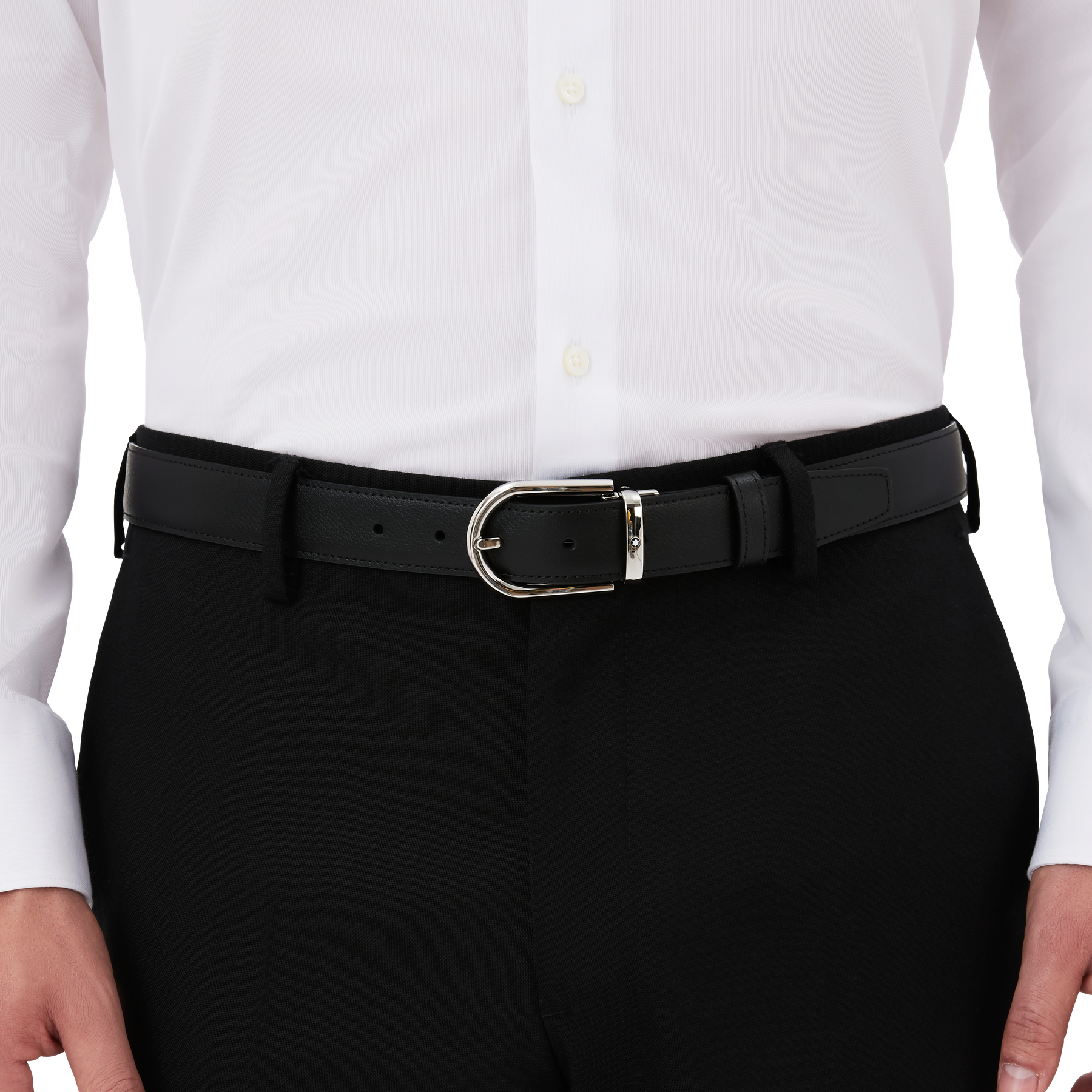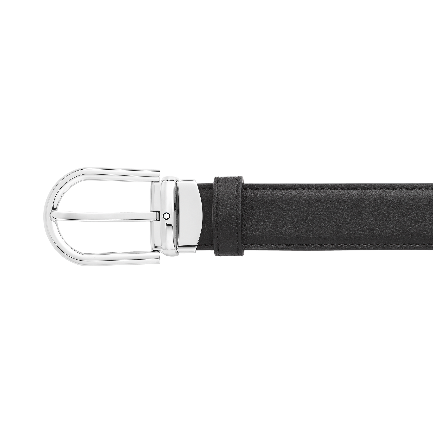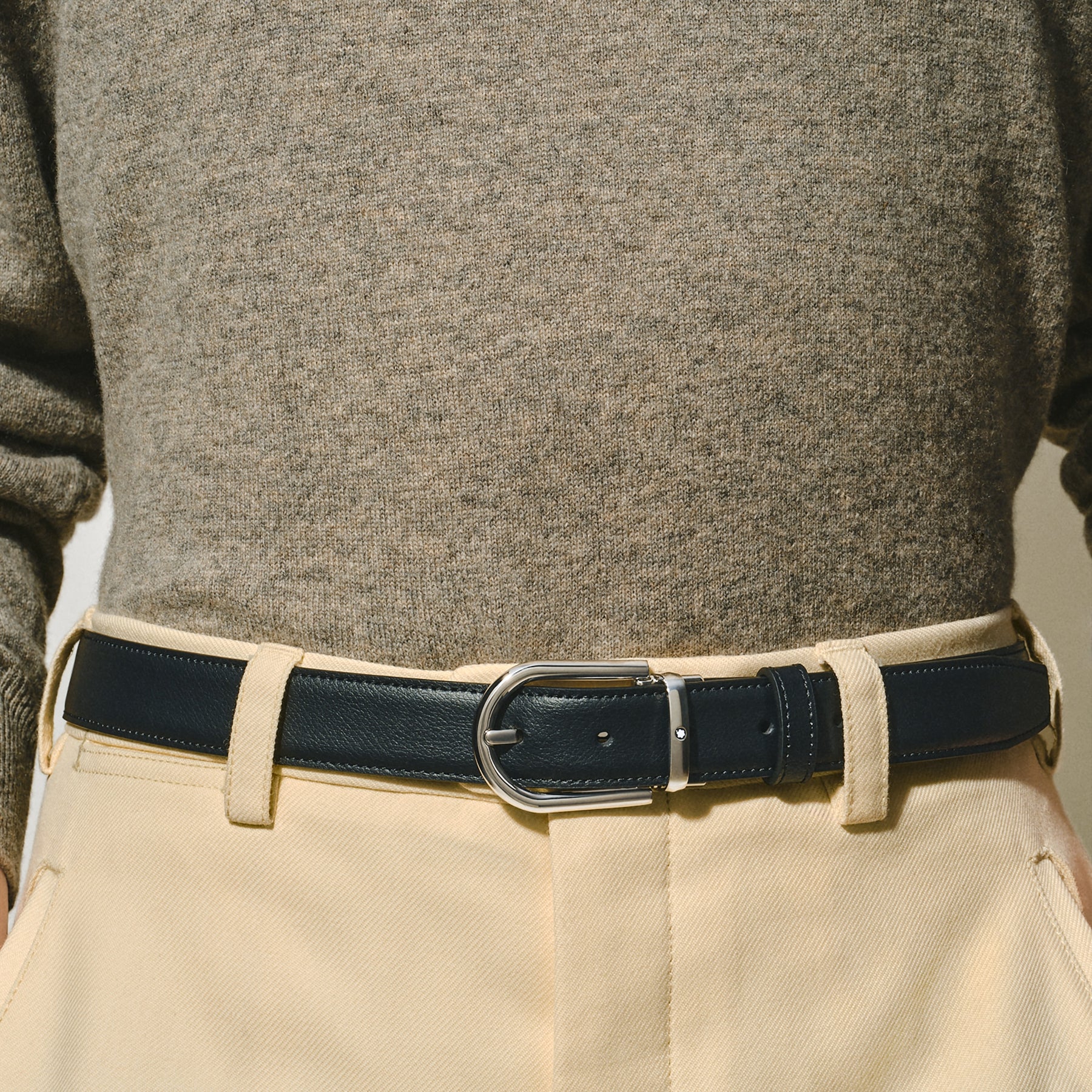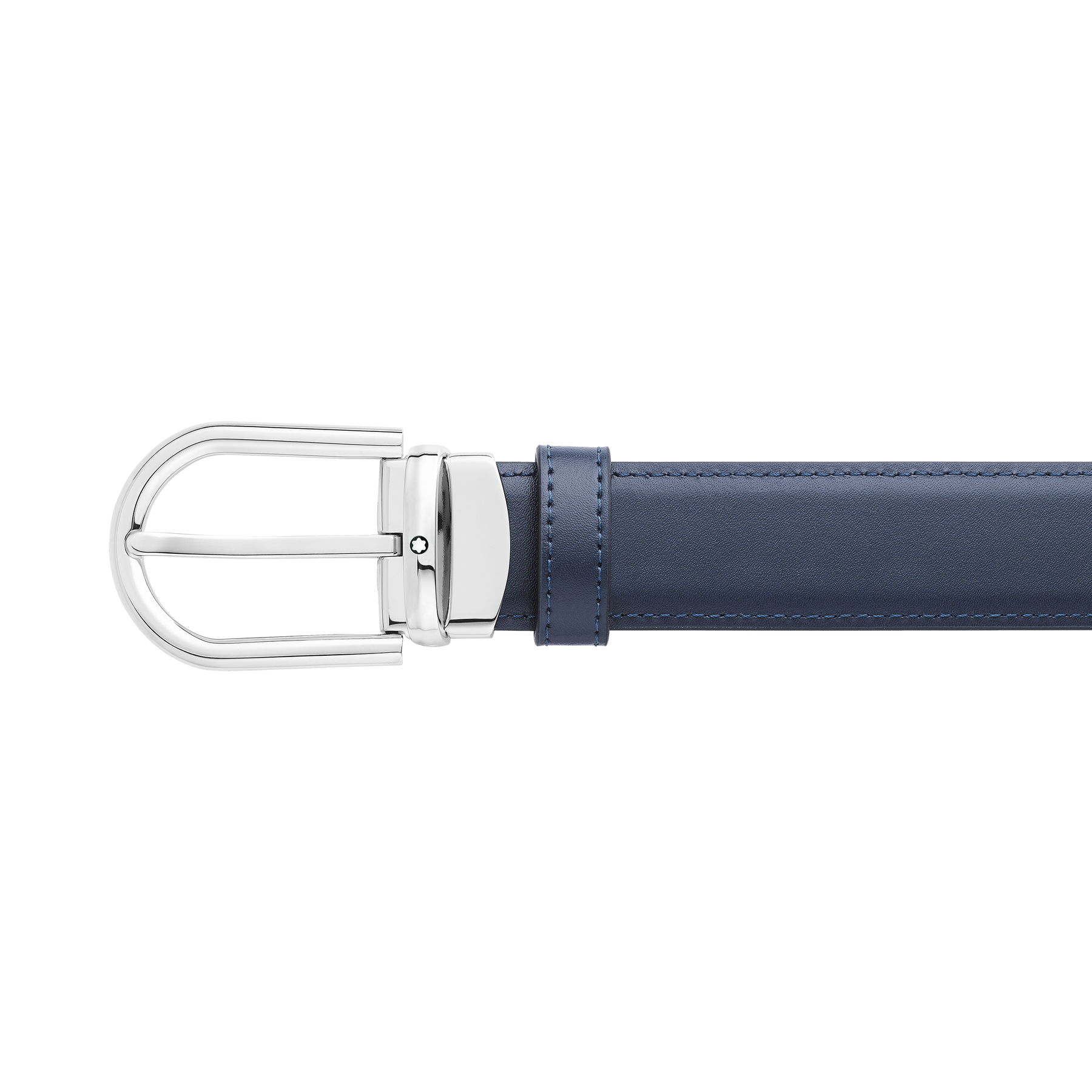 Horseshoe shiny palladium-finish pin buckle. Self-adjustable, 3 cm x 120 cm, reversible leather strap in plain blue colour on one side and grainy black on the other. Refined and understated, for any kind of look.
