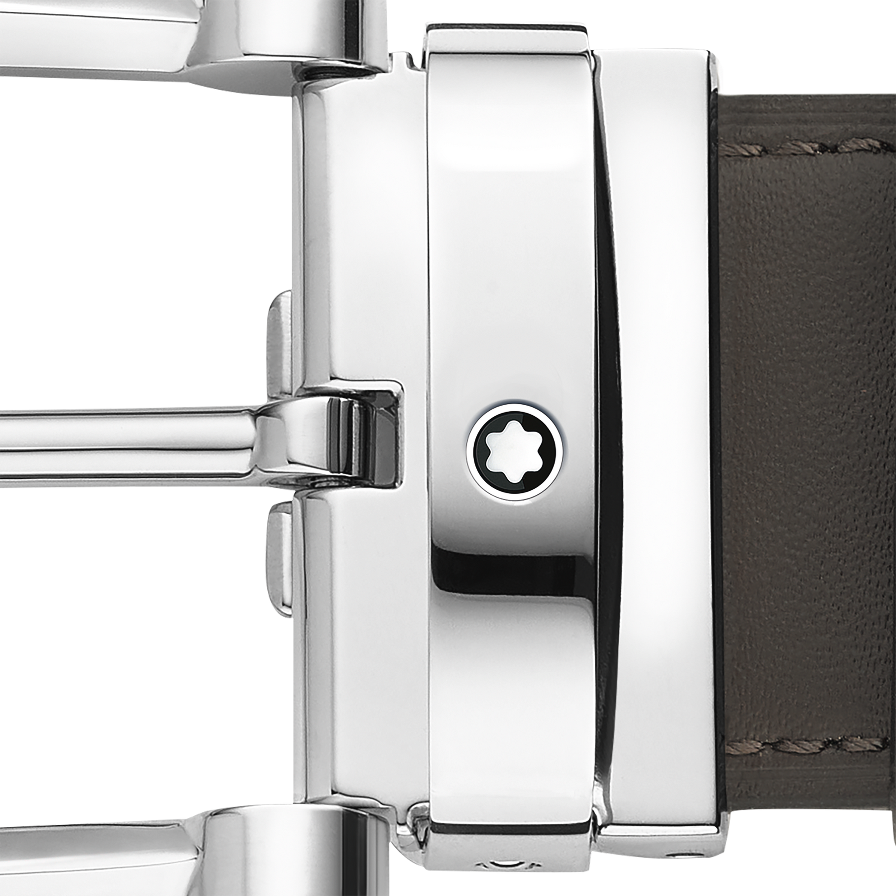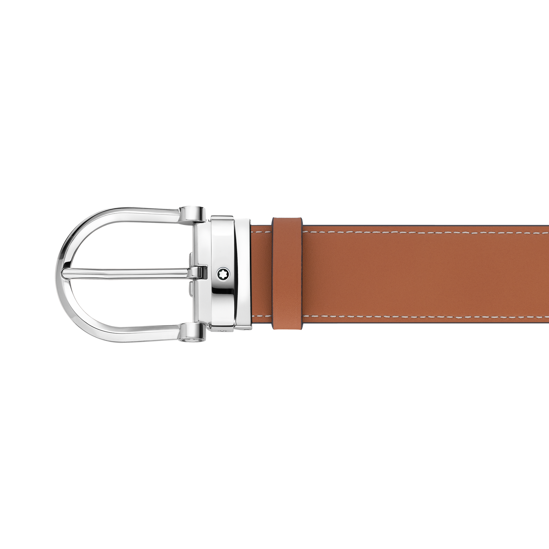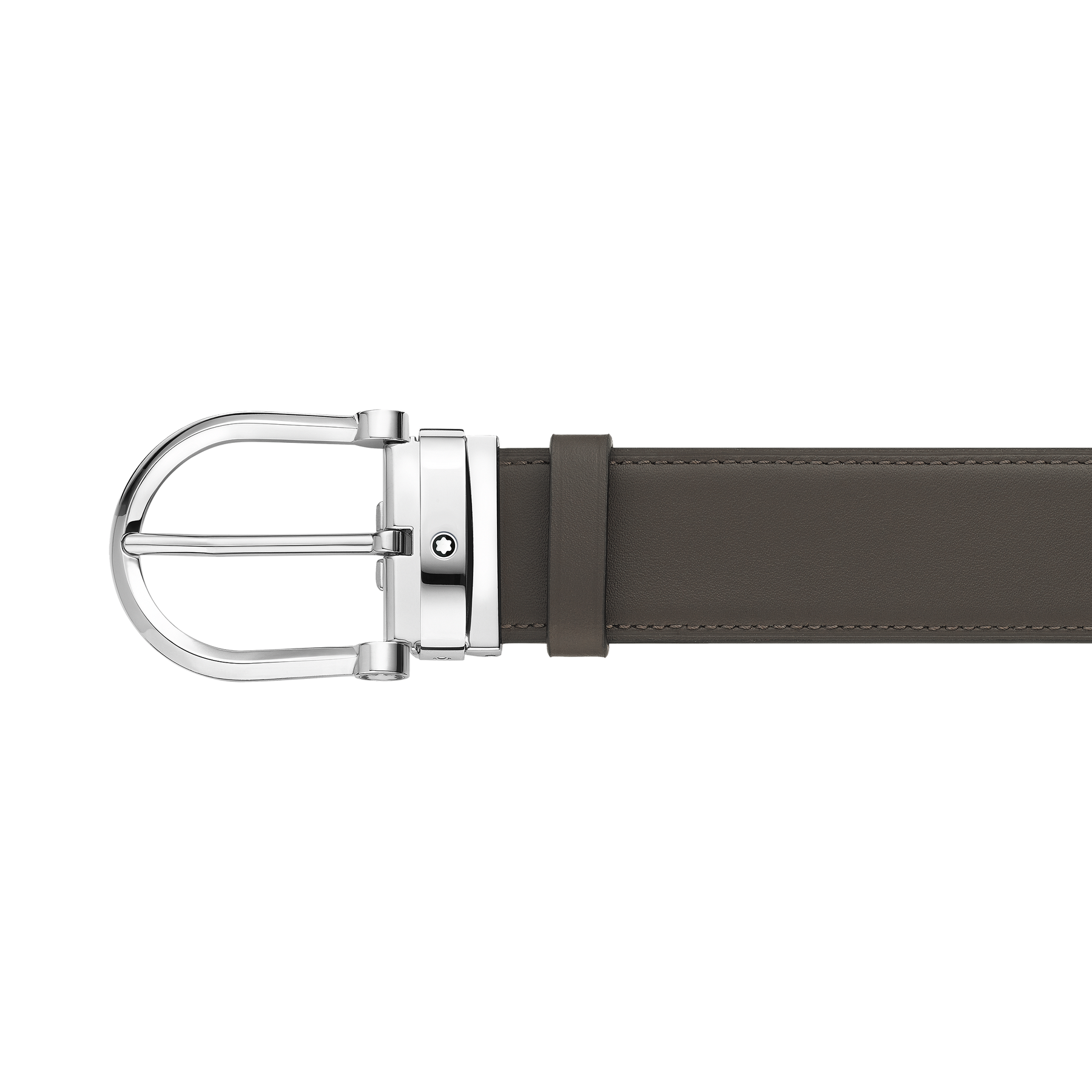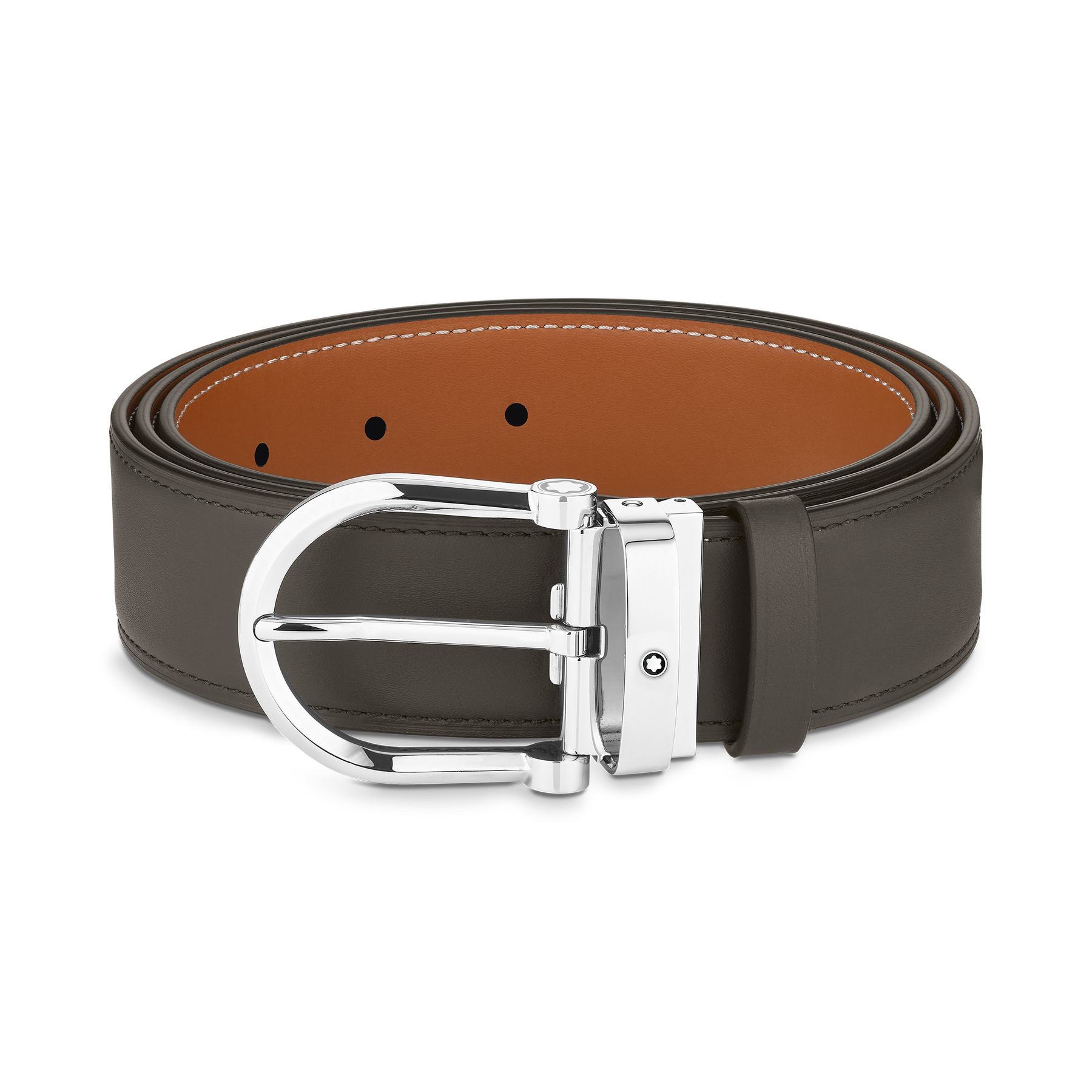 Horseshoe stainless steel pin buckle with decorative emblem on the sides. Self-adjustable, 3.5 cm x 120 cm, reversible strap in smoke-colored and tan-colored leather. An accessory that blends traditional elements with modern style.