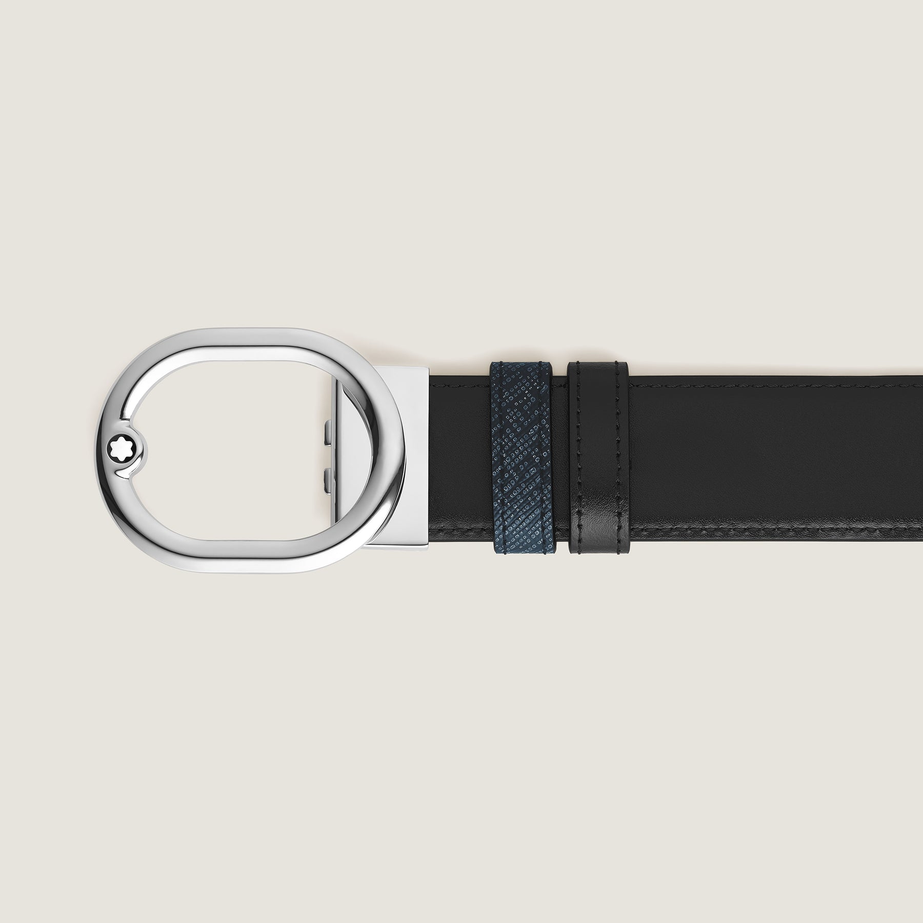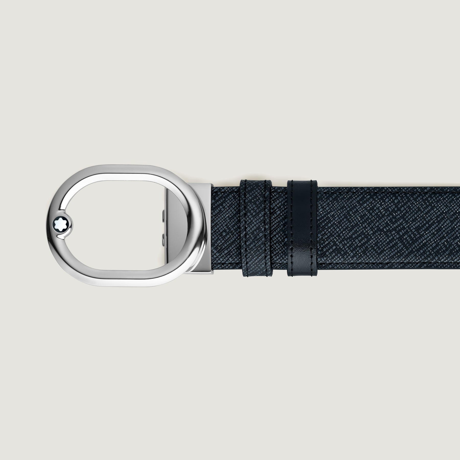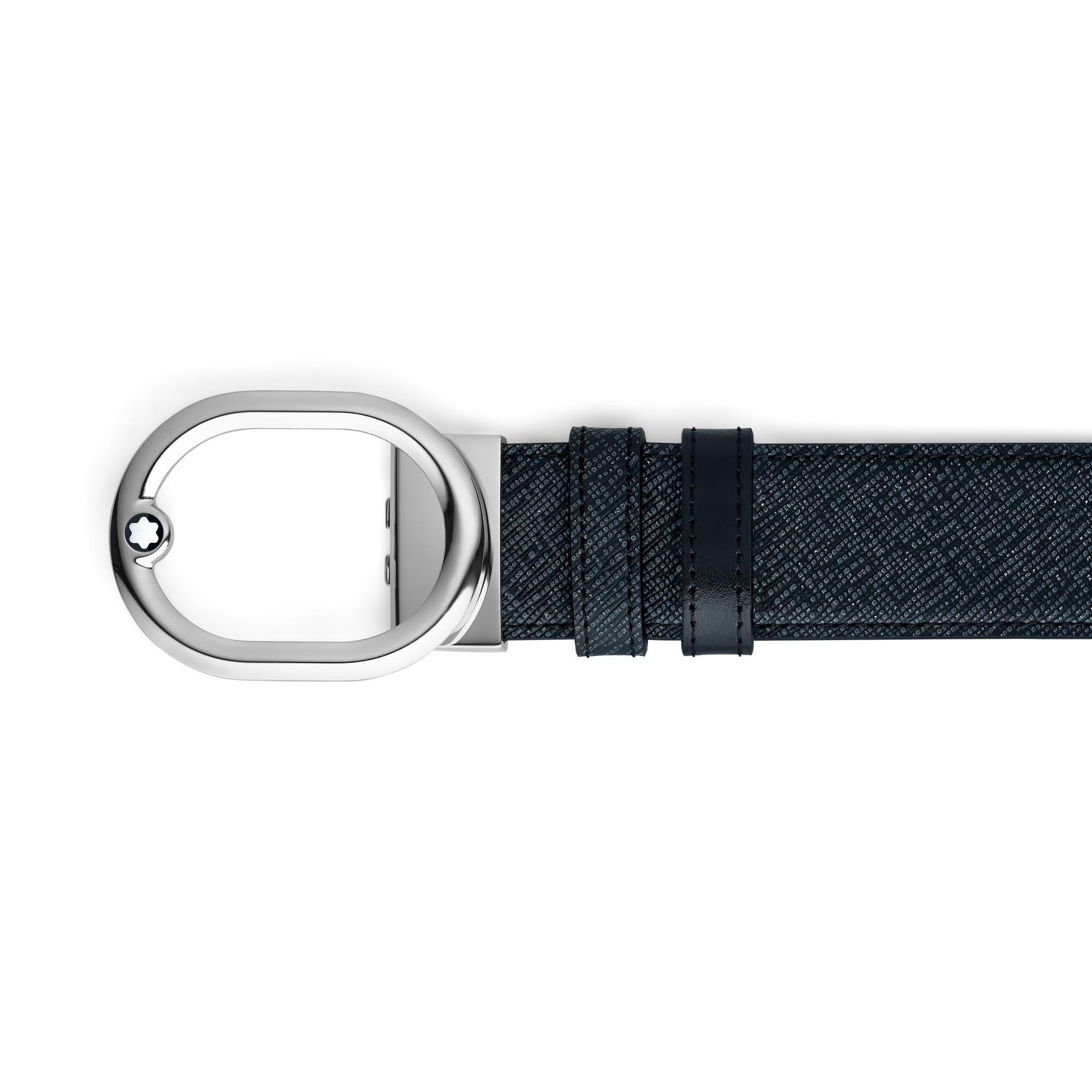 The L’Ovale reversible belt in 35mm combines the elegance of a palladium-finished oval buckle with the versatility of two distinct leather straps. The buckle, a departure from traditional square designs, adds a touch of freshness to your style. The belt strap offers two options: one side features tweed blue Sartorial printed calfskin leather for a warm, textured look, while the reverse features black Meisterstück leather, providing a classic and sophisticated option for any occasion.