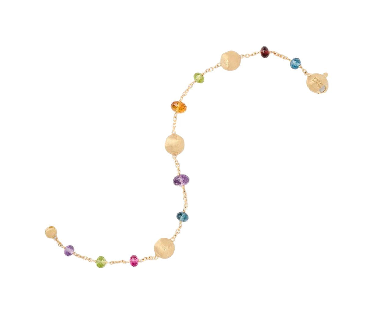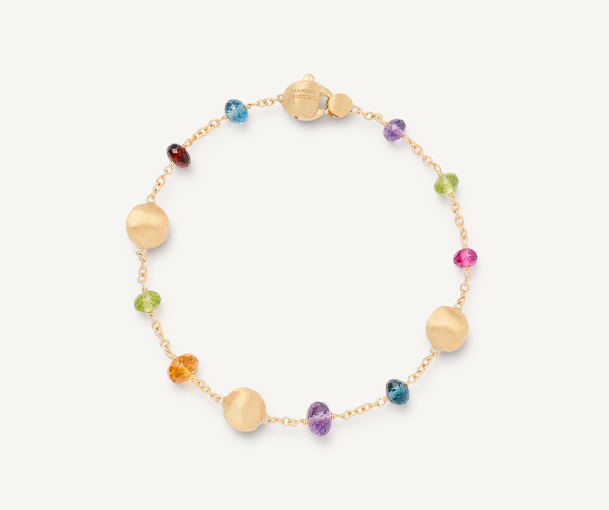A magnificent mix of coloured gemstones and irregular 18kt yellow gold beads, finely hand-engraved with an ancient Florentine technique. Fun and lively, this bracelet is perfect to complete the look and adds a touch of colour to any outfit.