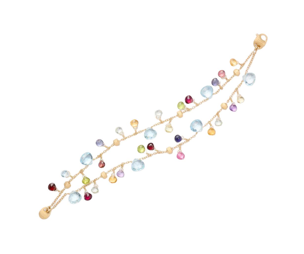 Regular price €3.400 Vat included. Shipping calculated at checkout.This beautiful multi-strand bracelet stands out for its vibrant colour combinations, with multicoloured heart-cut gemstones featuring alongside elegantly pure sky topazes. The 18kt yellow gold nuggets are finely hand-engraved using an ancient Florentine technique.