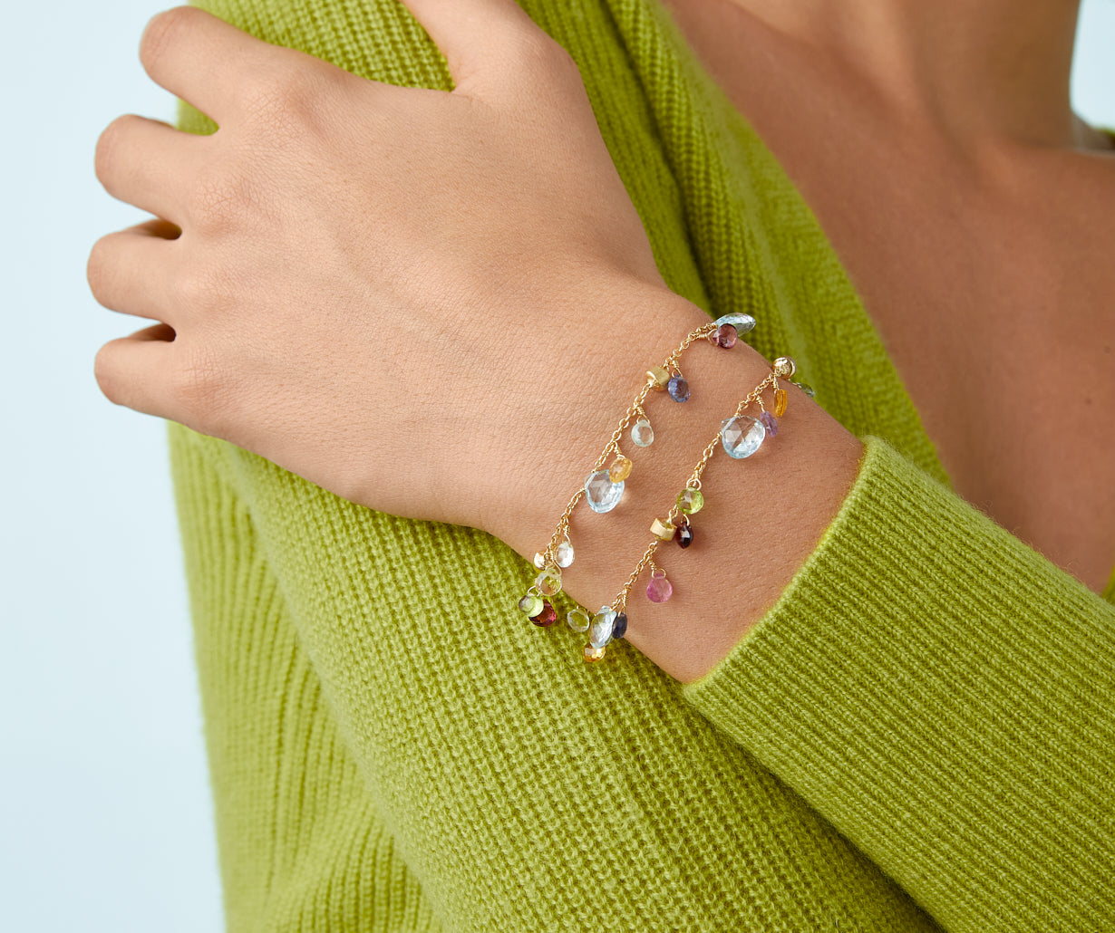 This beautiful multi-strand bracelet stands out for its vibrant colour combinations, with multicoloured heart-cut gemstones featuring alongside elegantly pure sky topazes. The 18kt yellow gold nuggets are finely hand-engraved using an ancient Florentine technique.