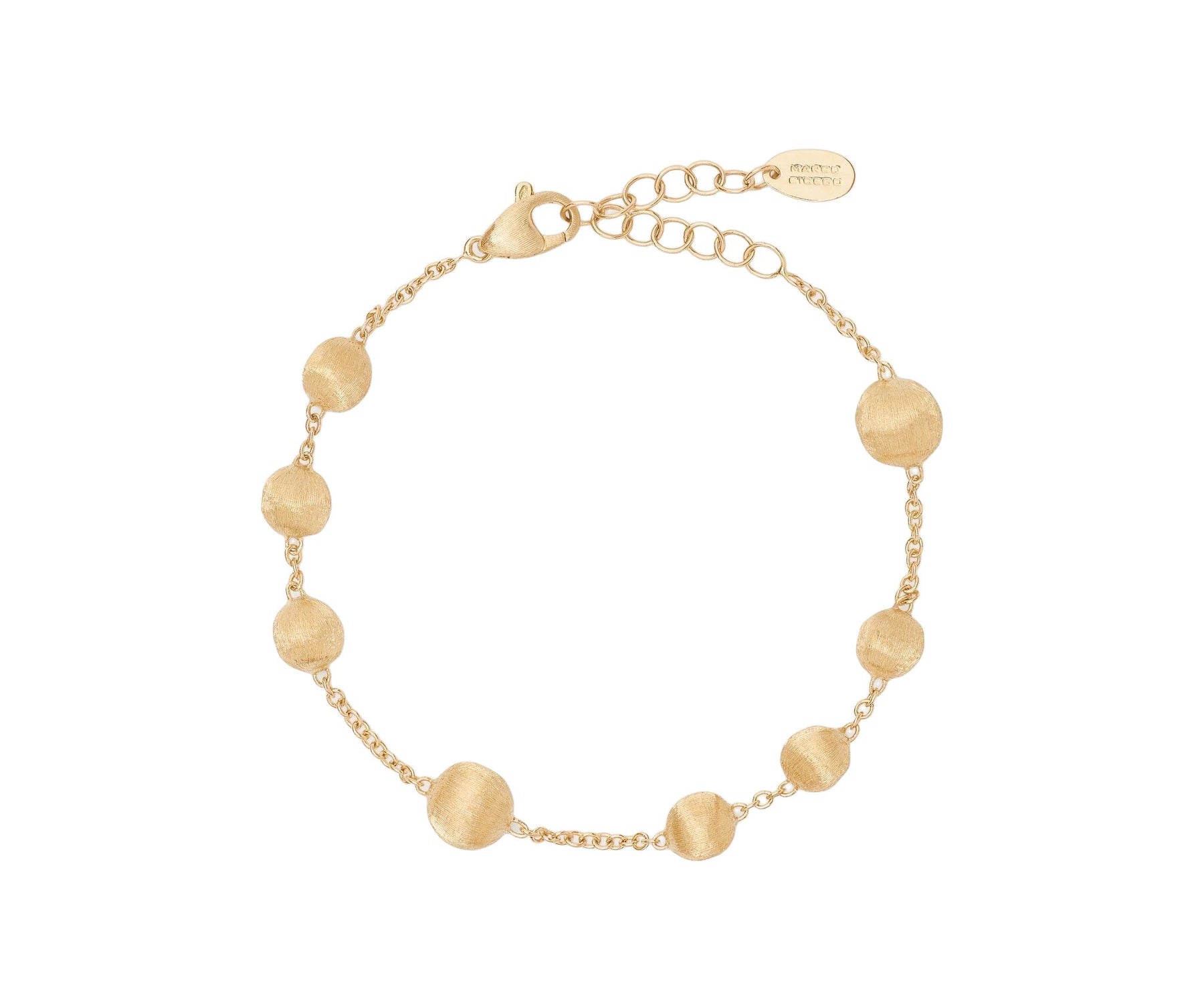 A delicate chain is used to connect uniquely positioned, hand-engraved, and naturally shaped golden beads, all in 18K yellow gold. The ancient Florentine technique gives the gold a fine, brushed texture. A sophisticated bracelet and the perfect touch for your everyday look.