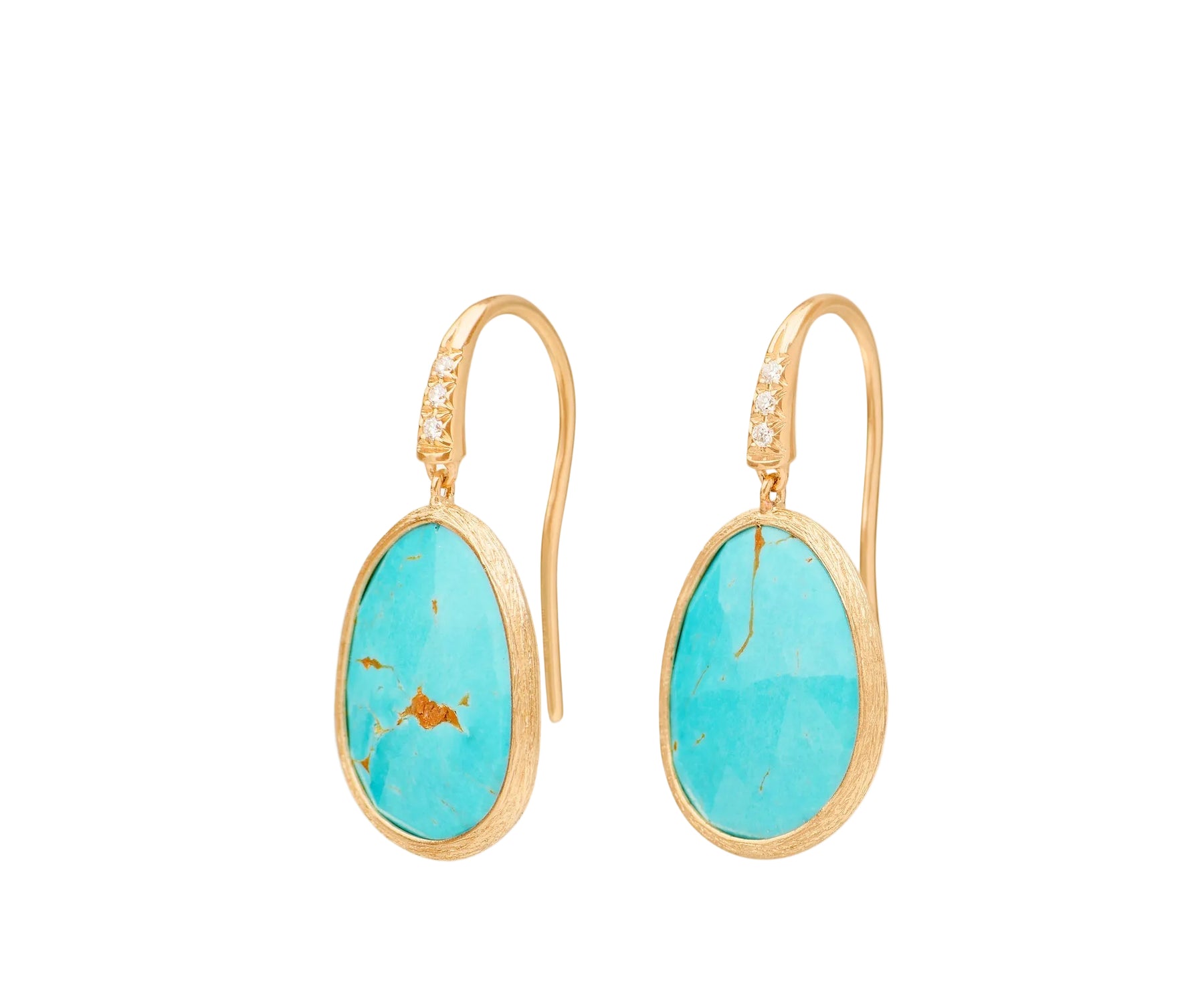 Adorned with a delicate diamond pavé hook, this pendant earring featuring turquoise is perfect for any occasion. The 18K yellow gold bezel is expertly hand-engraved using the ancient Florentine technique.