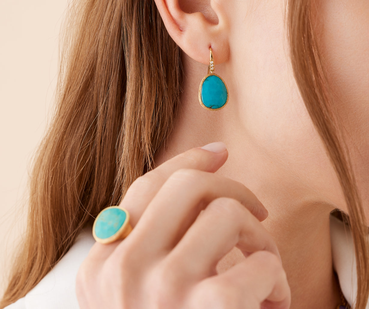Regular price €1.520 Vat included. Shipping calculated at checkout.Adorned with a delicate diamond pavé hook, this pendant earring featuring turquoise is perfect for any occasion. The 18K yellow gold bezel is expertly hand-engraved using the ancient Florentine technique.