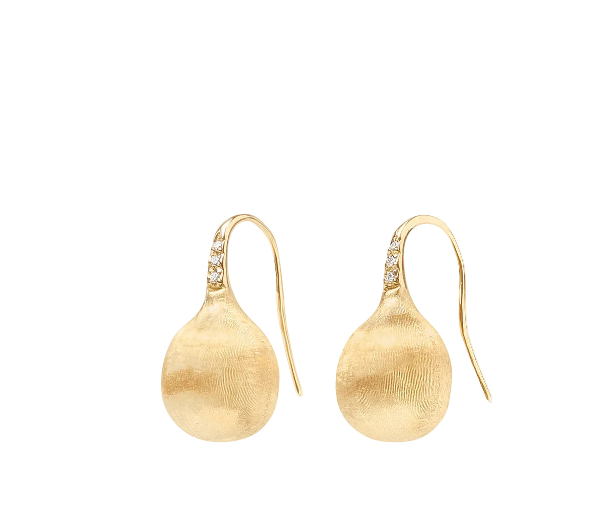 Regular price €2.600 Vat included. Shipping calculated at checkout.A stylish teardrop design for these 18K yellow gold earrings, finely hand-engraved with an ancient Florentine technique. Each earring has been set with three alluring diamonds near the top. The French wire backings allow for easy and comfortable wear.