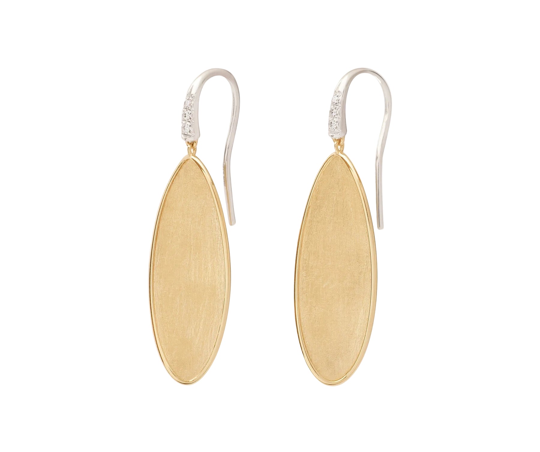 The iconic leaf motif reimagined with a refined twist. These irregularly shaped pendant earrings are finely hand-engraved using the ancient Florentine technique. The 18kt yellow gold leaves, gently twisted to create a fluid and sculptural silhouette, are embellished by a delicate diamond pavé hook