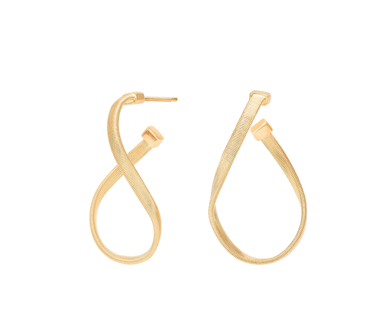 Subtle, elegant and full of finesse, these 18kt yellow gold hoop earrings feature a striking twisted coil into an irregular infinity shaped hoop. Light and refined, they are a timeless classic, perfect for adding a touch of light to any outfit.