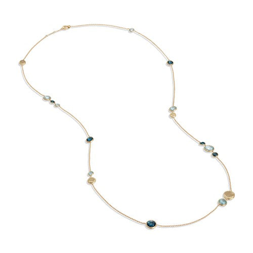 Regular price €5.050 Vat included. Shipping calculated at checkout.This long necklace features a selection of topazes in various shades of blue on an exceptionally fine chain, interspersed with 18kt yellow gold disks finely hand-engraved with an ancient Florentine technique.