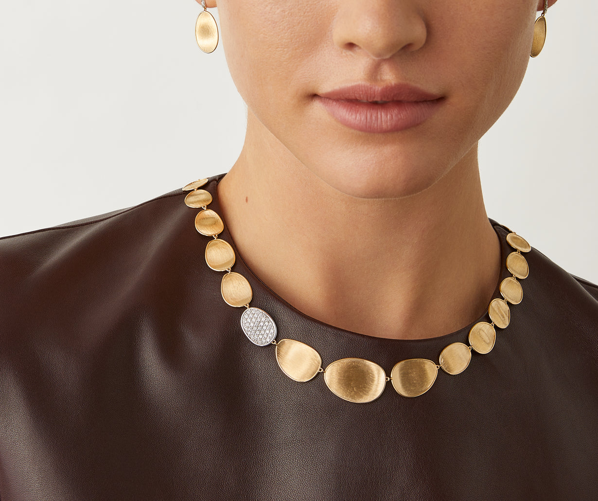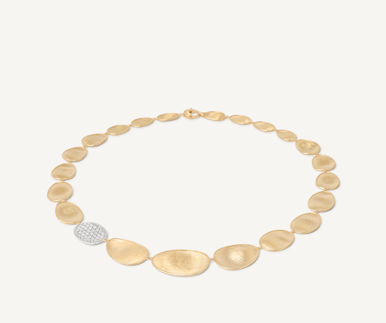 This elegant necklace features a sophisticated fading sequence of 18kt yellow gold leaves, finely hand-engraved using an ancient Florentine technique and embellished by a side leaf enriched with a pavé of brilliant-cut diamonds. Fascinating and extremely classy.