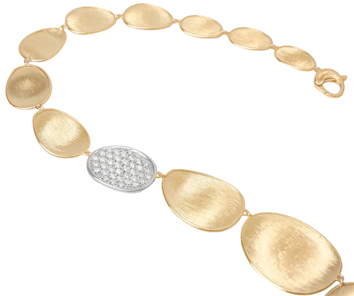 Regular price €10.700 Vat included. Shipping calculated at checkout.This elegant necklace features a sophisticated fading sequence of 18kt yellow gold leaves, finely hand-engraved using an ancient Florentine technique and embellished by a side leaf enriched with a pavé of brilliant-cut diamonds. Fascinating and extremely classy.