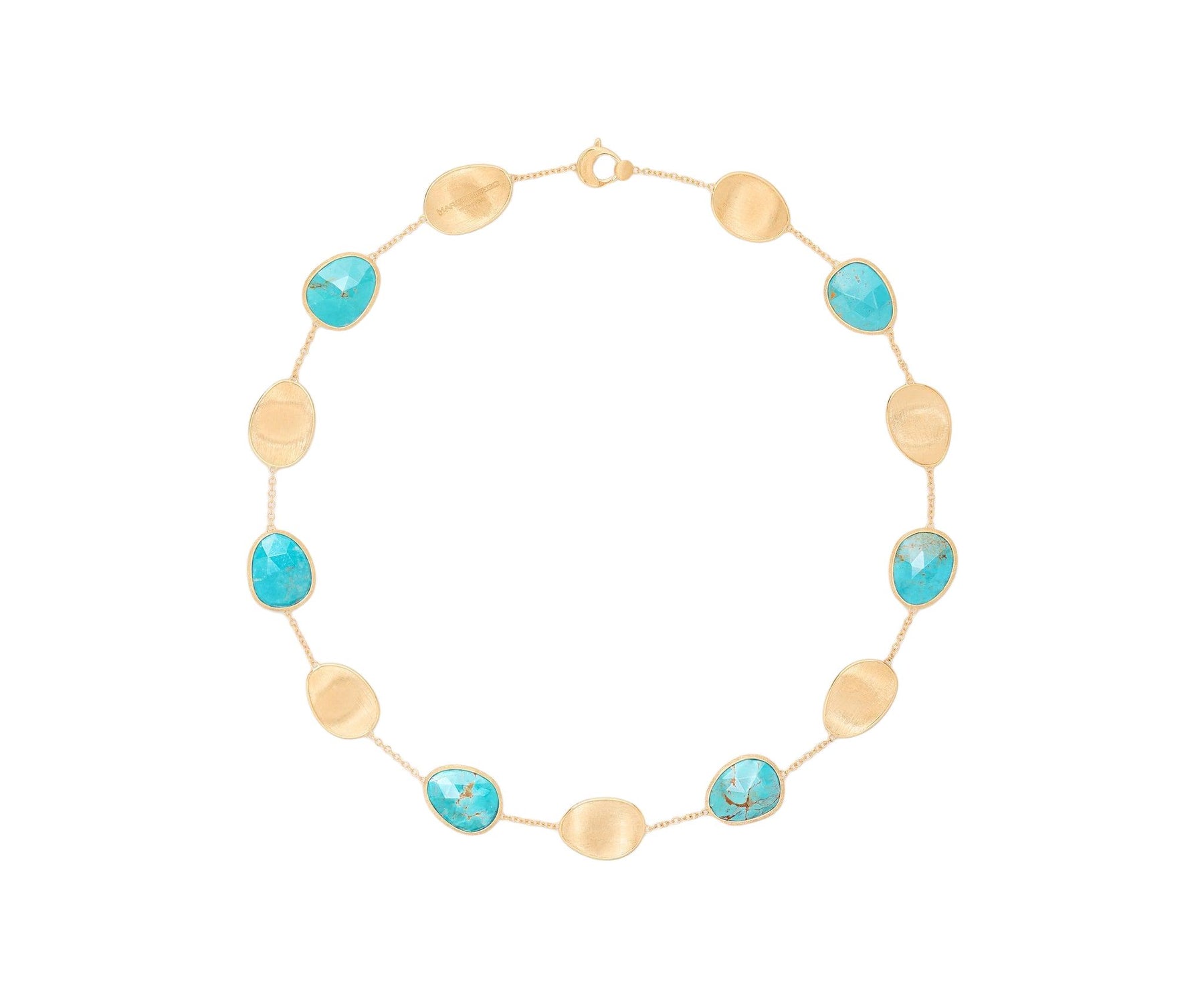 Elegant and striking, this necklace features a refined sequence of light 18K yellow gold leaves and turquoise. The gold leaves are meticulously hand-engraved using the ancient Florentine technique, interspersed with a delicate chain. The perfect piece to complete any look with a vibrant touch of color.