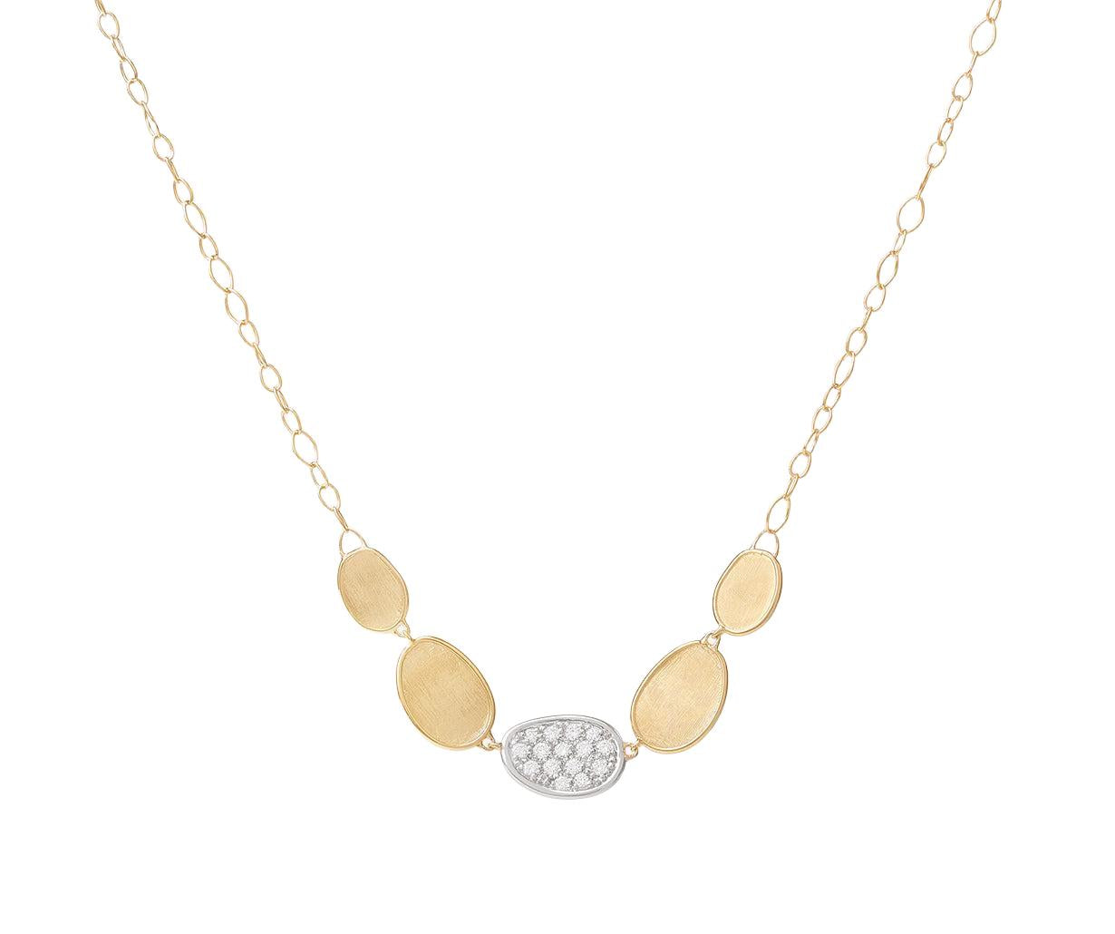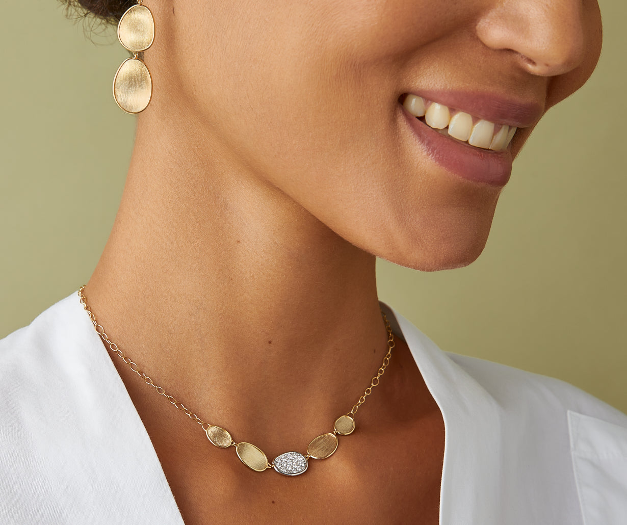 A brilliant cut diamond pavé leaf shines at the center of this elegant necklace with graduated, irregular shapes. The elements in 18kt yellow gold are engraved by hand with an ancient Florentine technique, providing a discreet, very finely textured surface with a strikingly silky feel. surface.