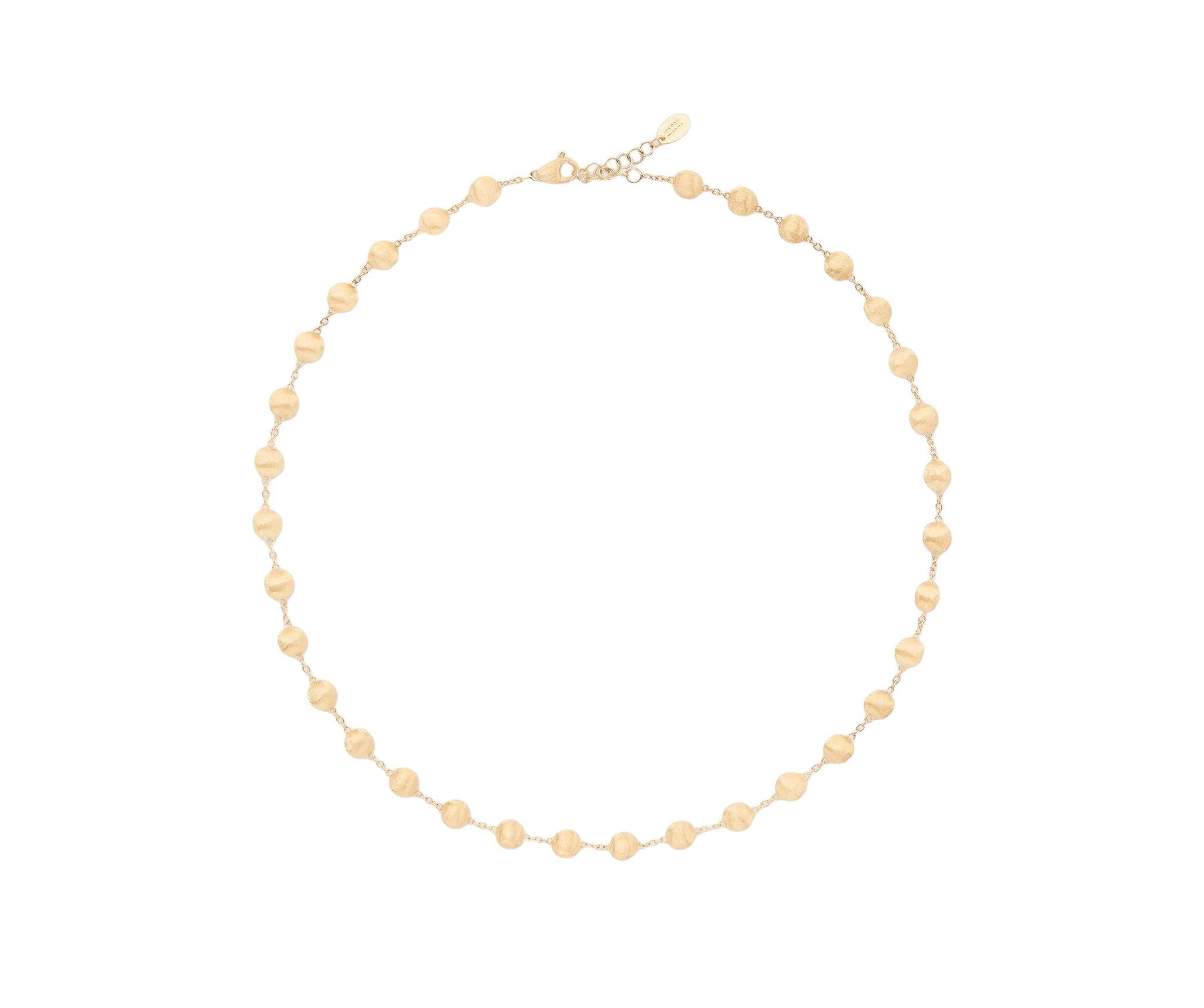 This stunning necklace stands out for its delicate sequence of 18K yellow gold beads. The irregular surface is finely hand-engraved using the ancient Florentine technique, giving the gold a fine, brushed texture. Wear this necklace on its own or layer with chains of various lengths for an elevated look.