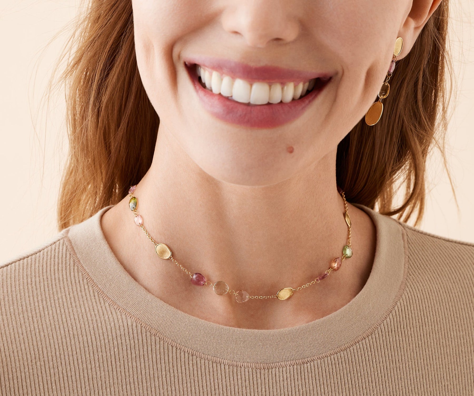 An elegant 18K yellow gold necklace, adorned with gold leaves delicately hand-engraved using the ancient Florentine technique, alternating with vibrant tourmalines. This necklace features an adjustable chain, offering a customizable fit for every neckline.
