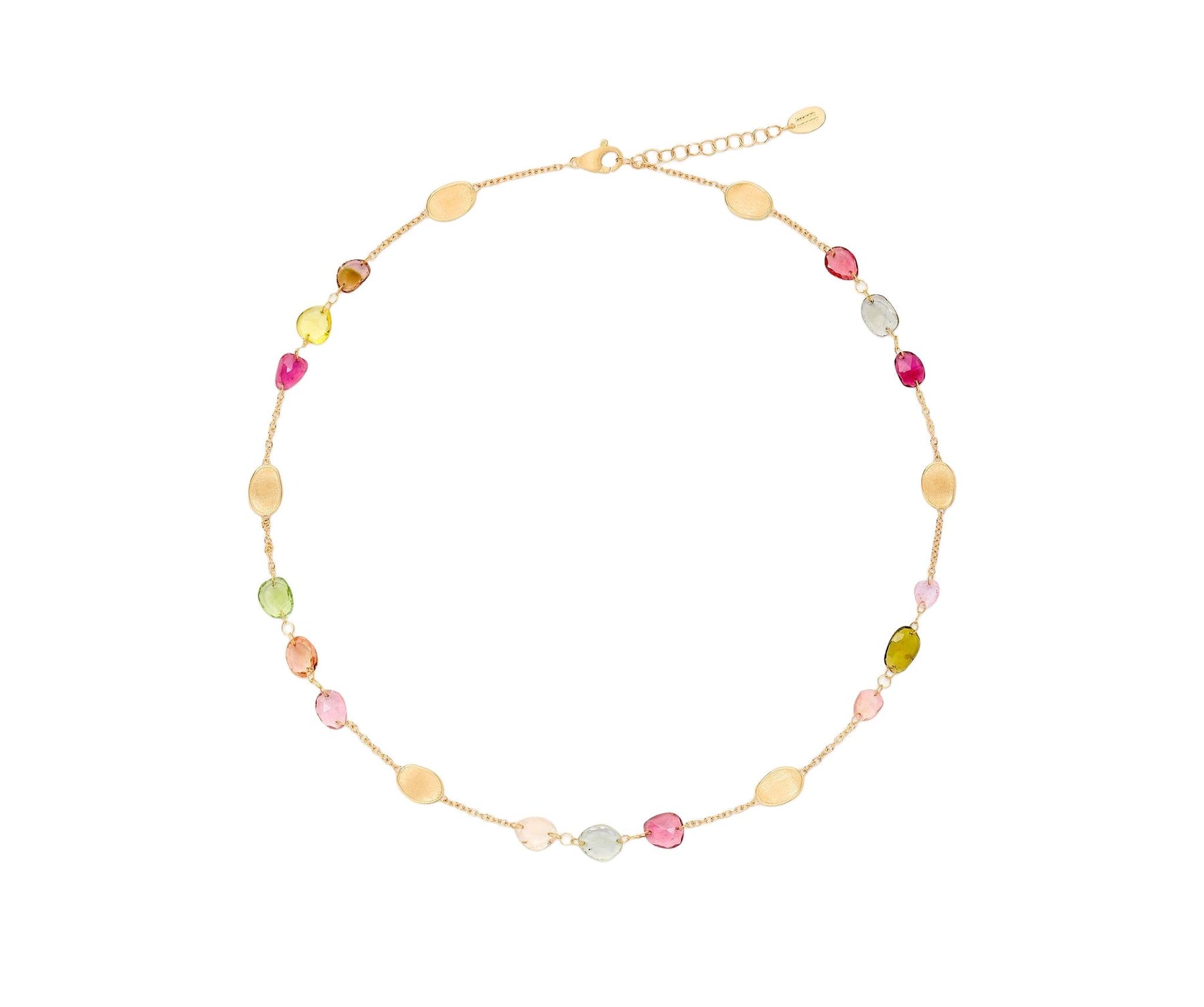 Regular price €3.650 Vat included. Shipping calculated at checkout.An elegant 18K yellow gold necklace, adorned with gold leaves delicately hand-engraved using the ancient Florentine technique, alternating with vibrant tourmalines. This necklace features an adjustable chain, offering a customizable fit for every neckline.