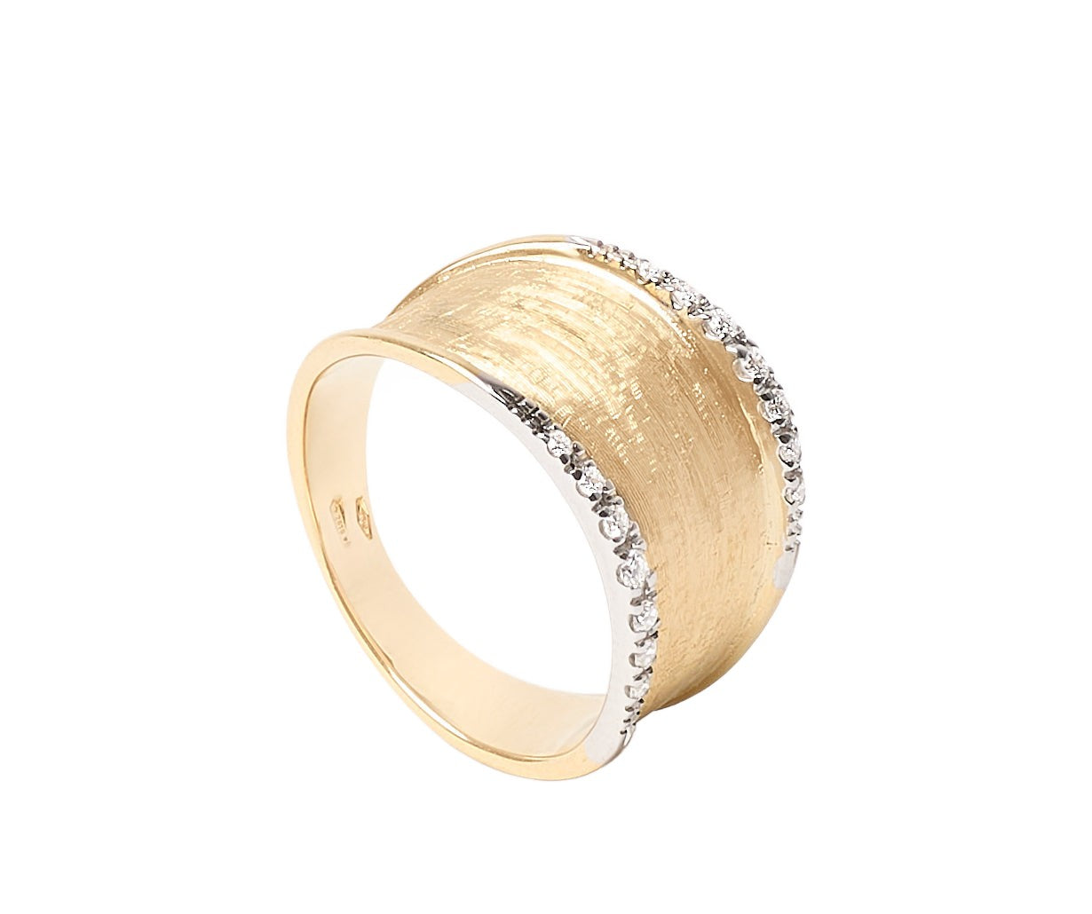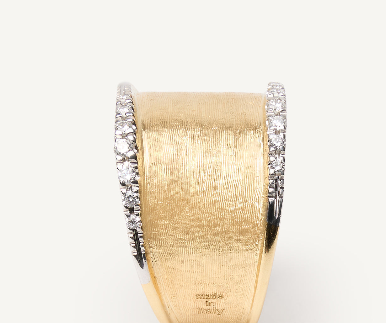 Regular price €3.350 Vat included. Shipping calculated at checkout.Featuring an irregular surface and linear design, this 18kt yellow gold diamond band ring has been finely hand-engraved using an ancient Florentine technique and is embellished by elegant side profiles featuring a brilliant-cut diamond pavé.