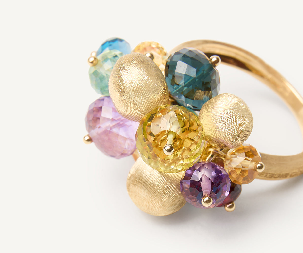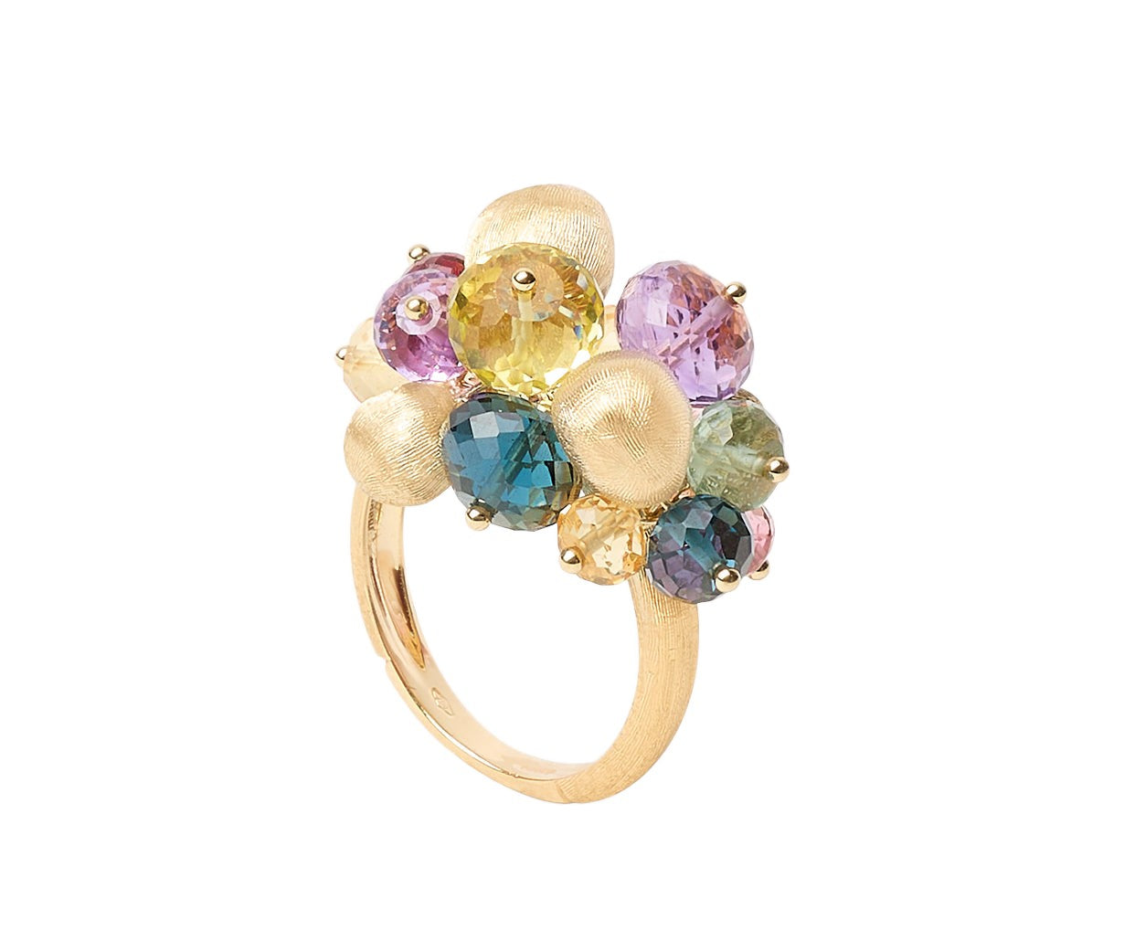 Playful and colourful, this cocktail ring is perfect for adding spark and light to any outfit. A mix of natural gemstones, carefully selected for their intensity and purity, embellishes the 18kt yellow gold shank, finely hand-engraved using an ancient Florentine technique.
