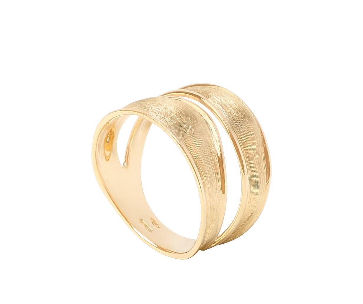 A ring with beautiful irregular outlines and a linear design. Two 18kt yellow gold bands entwine around the finger, making this an absolute delight to wear. The surface is finely hand-engraved using an ancient Florentine technique, granting extraordinary lustre and a silky surface.