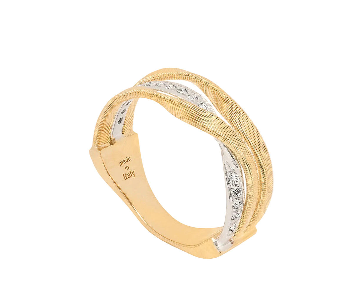 The refined design of this 18kt yellow gold ring makes it a precious accessory to wear every day. Two strands of twisted coil alternate with a brilliant-cut diamond pavé band, creating a mesmerizing combination of textures and colors.