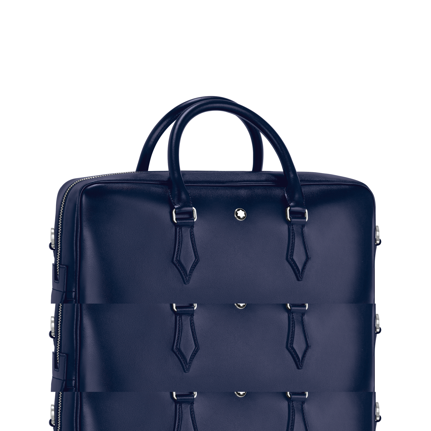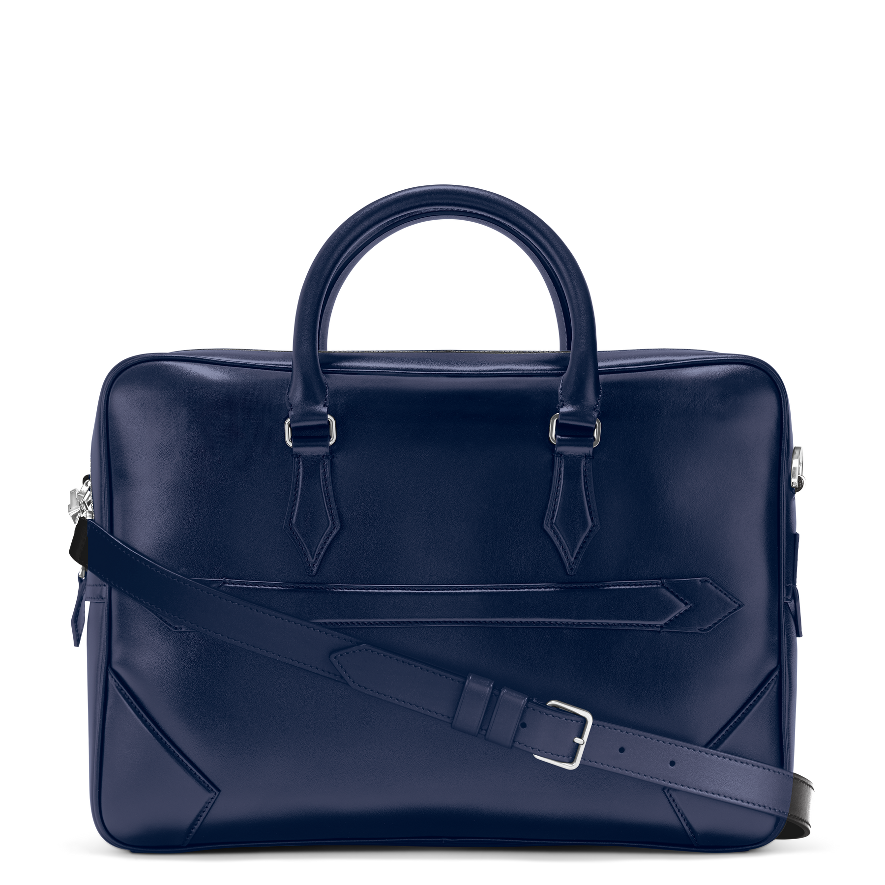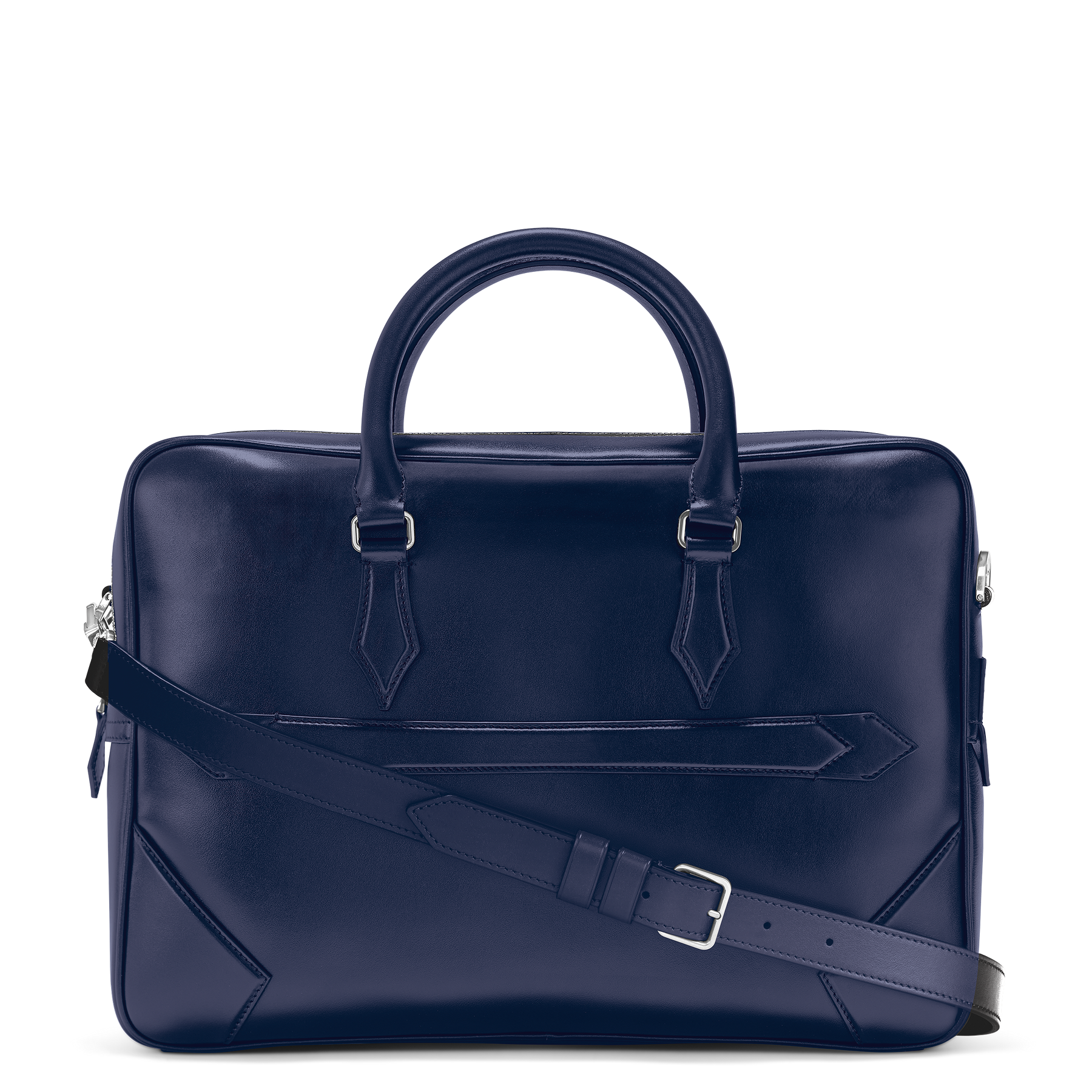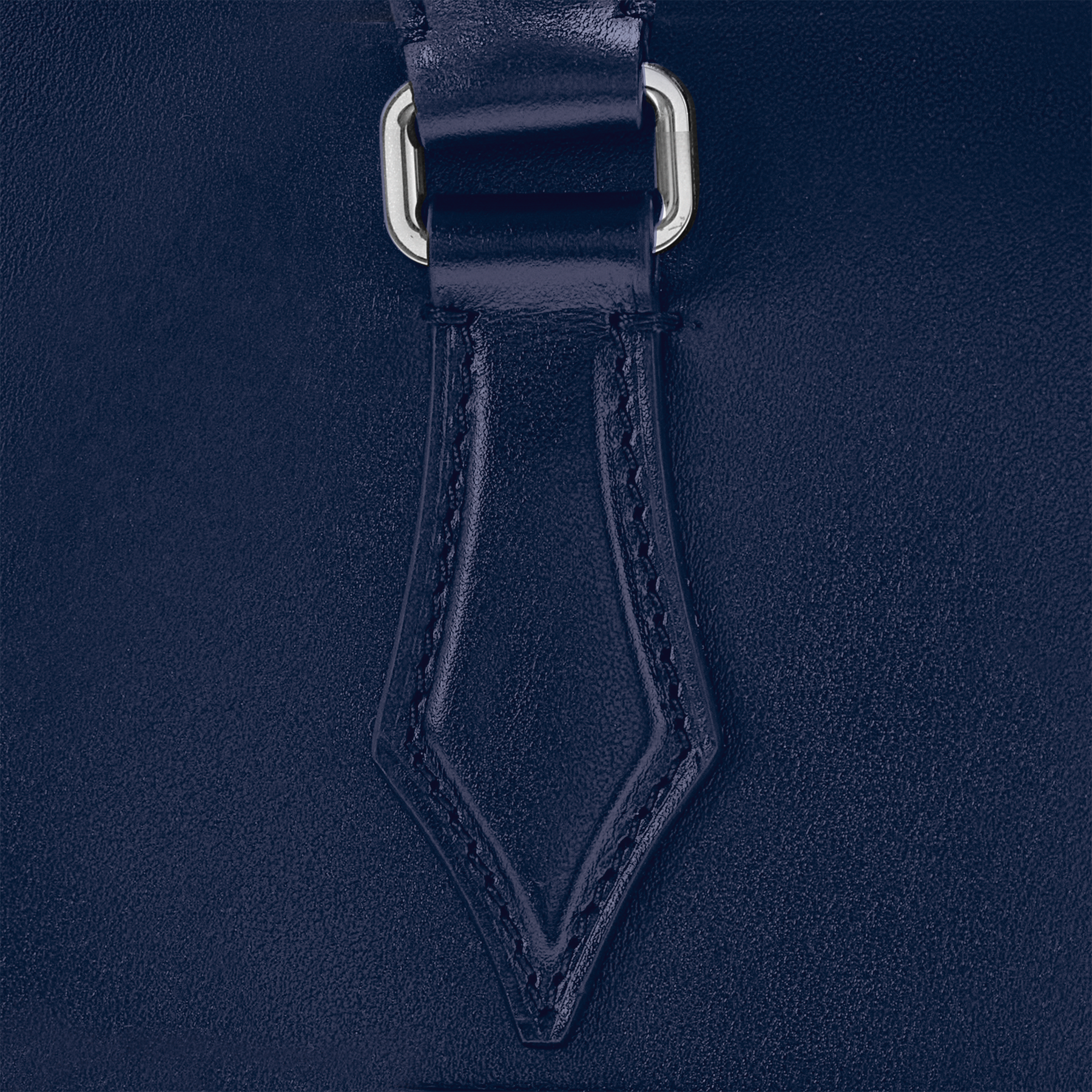 Inspired by the culture of writing, the Meisterstück Document Case is an elegant companion for business trips. Crafted from a new deep shine ink blue leather, all its details speak the language of the nib: stitching, zipper pullers and handles that recall the shape of the nib, perfectly illustrating the essence of Montblanc. A larger version of the logo adorns the bag. The leather top handles, the removable leather shoulder strap and the satellite system offer multiple carrying options, while inside pockets ensure practicality.