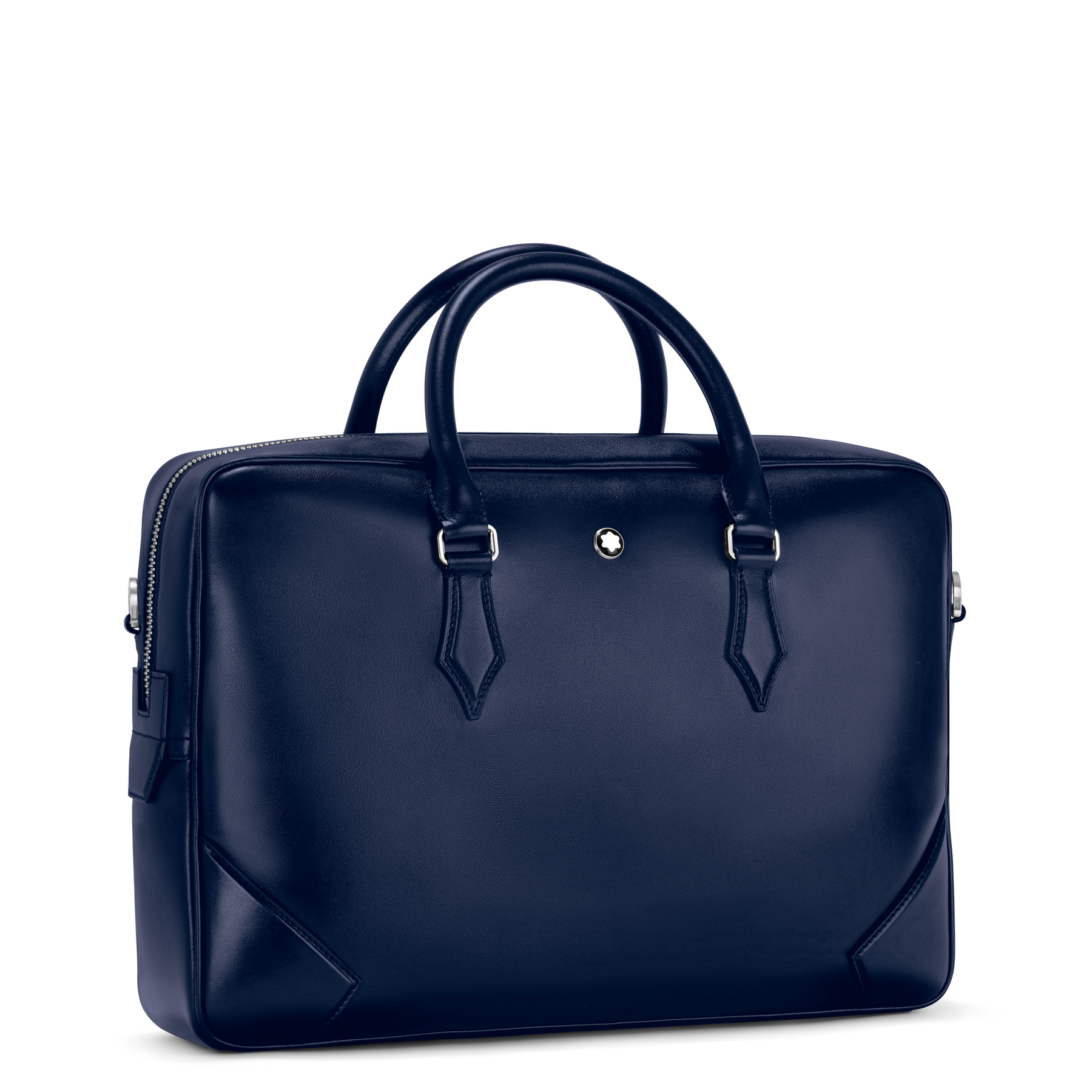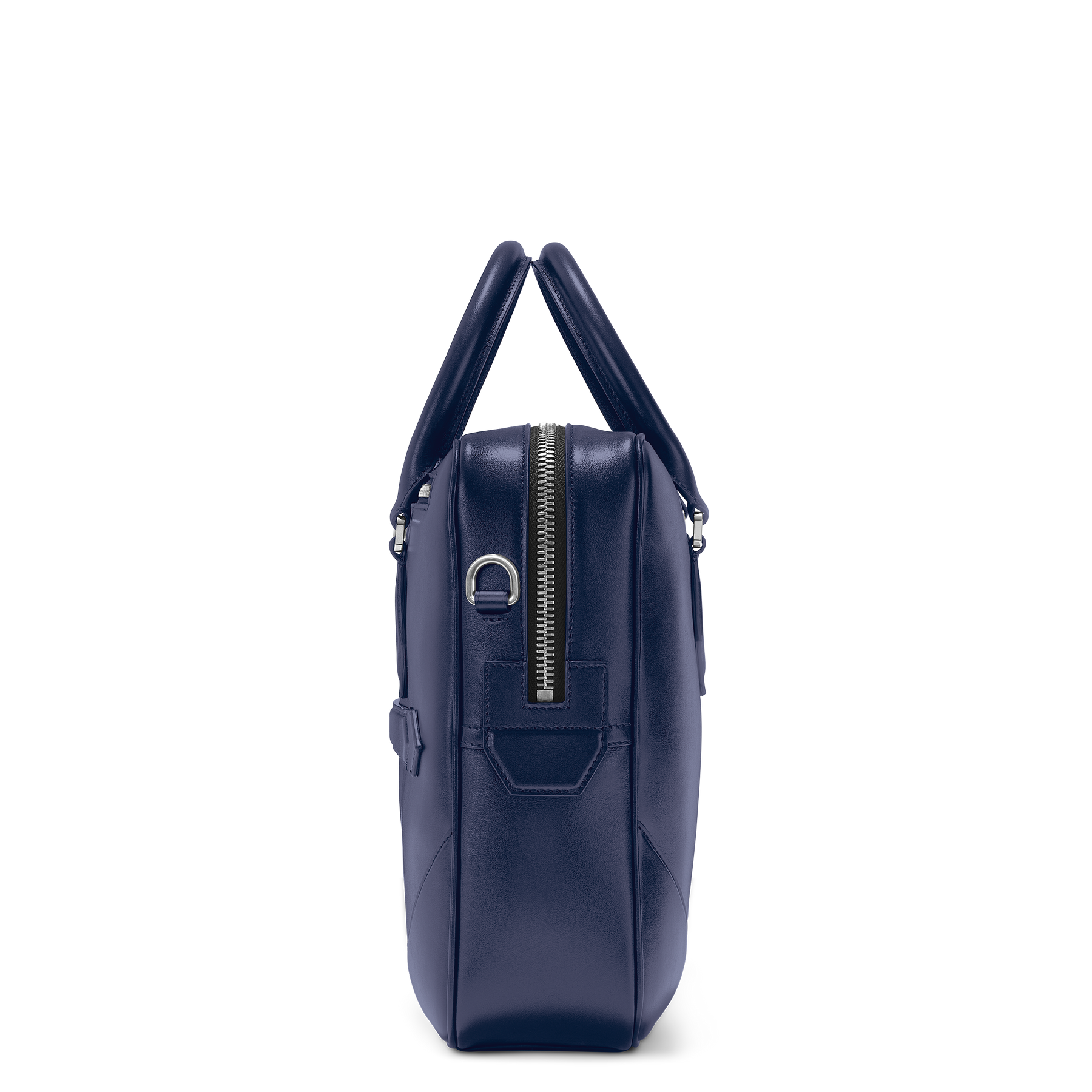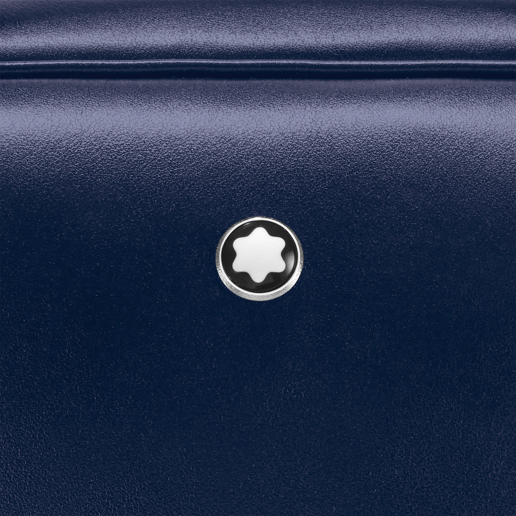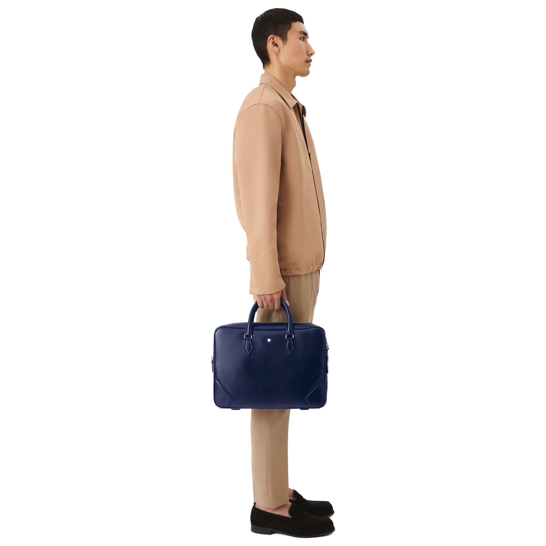 Inspired by the culture of writing, the Meisterstück Document Case is an elegant companion for business trips. Crafted from a new deep shine ink blue leather, all its details speak the language of the nib: stitching, zipper pullers and handles that recall the shape of the nib, perfectly illustrating the essence of Montblanc. A larger version of the logo adorns the bag. The leather top handles, the removable leather shoulder strap and the satellite system offer multiple carrying options, while inside pockets ensure practicality.