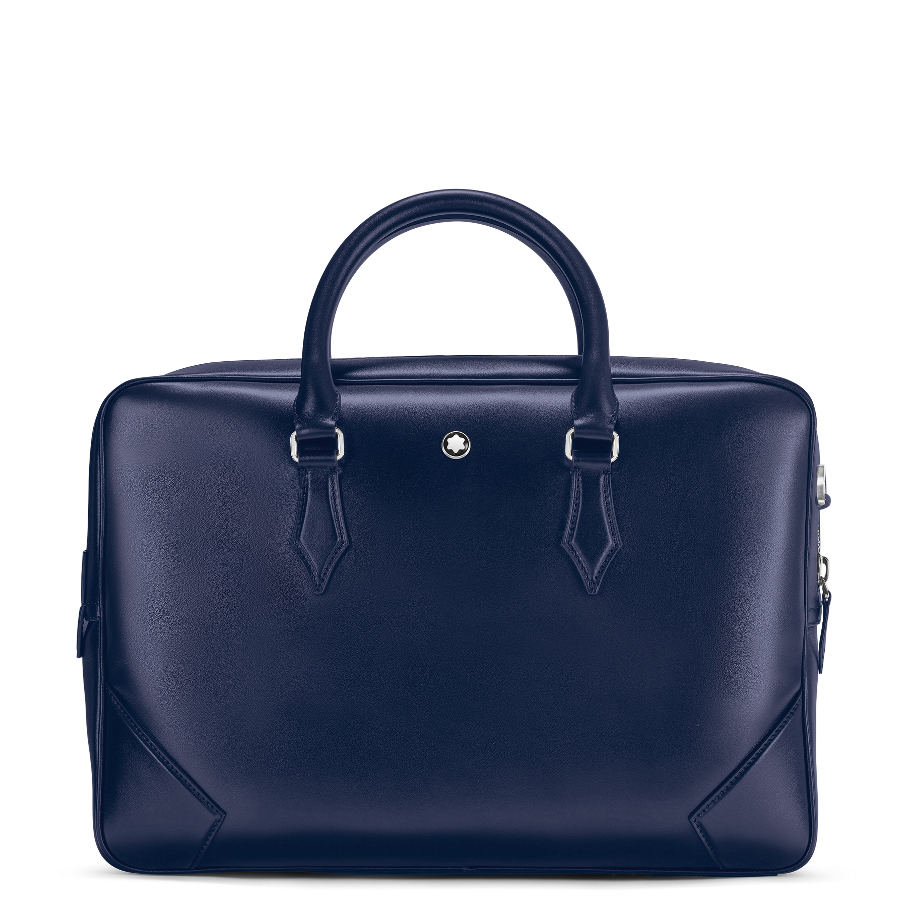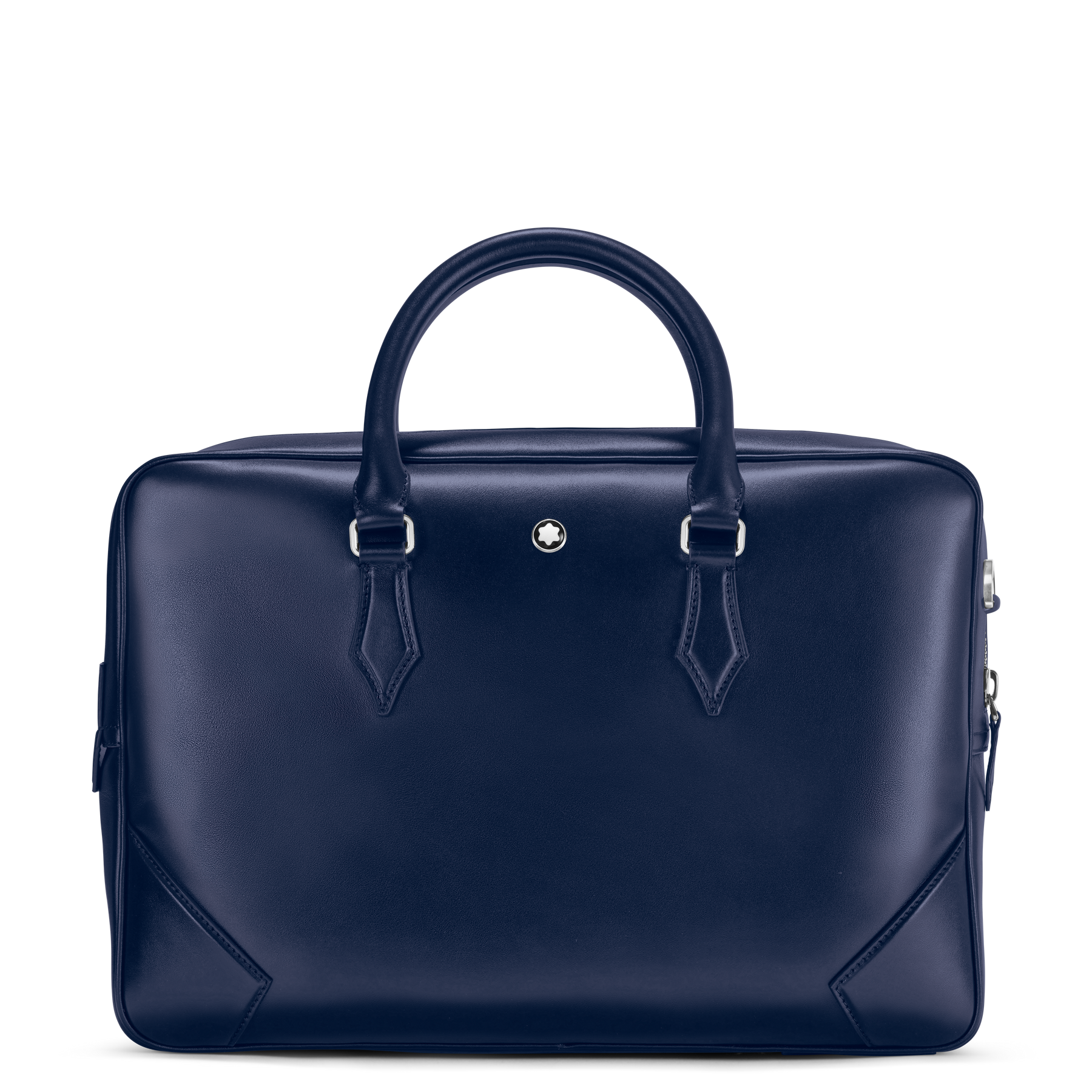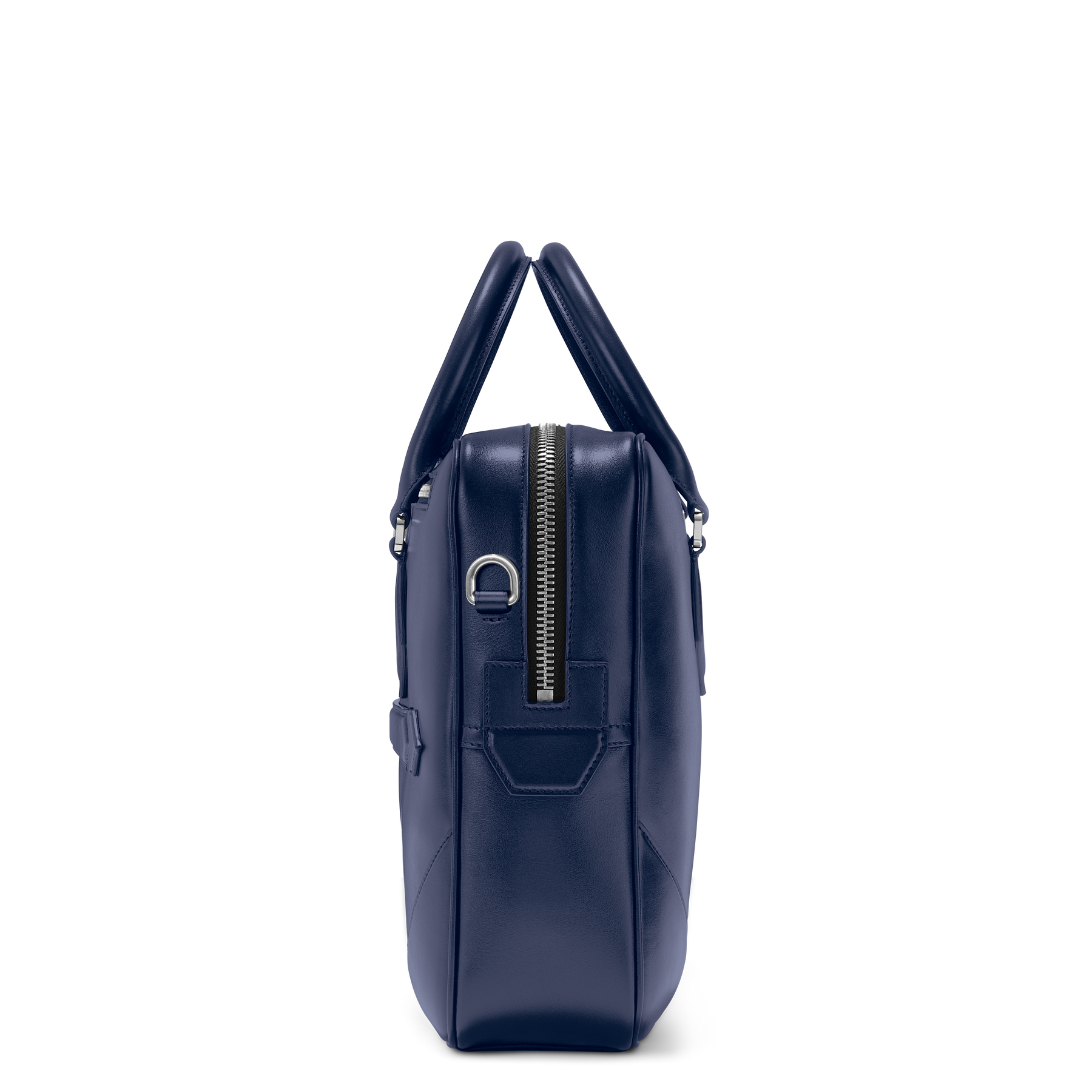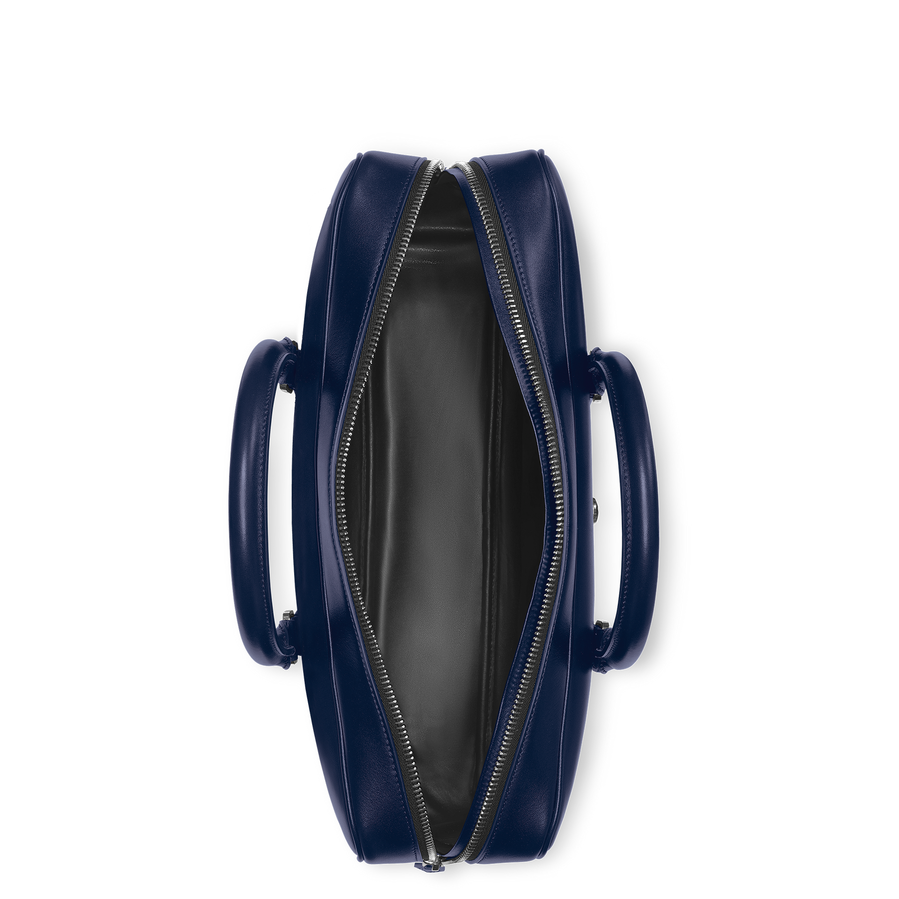 Inspired by the culture of writing, the Meisterstück Document Case is an elegant companion for business trips. Crafted from a new deep shine ink blue leather, all its details speak the language of the nib: stitching, zipper pullers and handles that recall the shape of the nib, perfectly illustrating the essence of Montblanc. A larger version of the logo adorns the bag. The leather top handles, the removable leather shoulder strap and the satellite system offer multiple carrying options, while inside pockets ensure practicality.