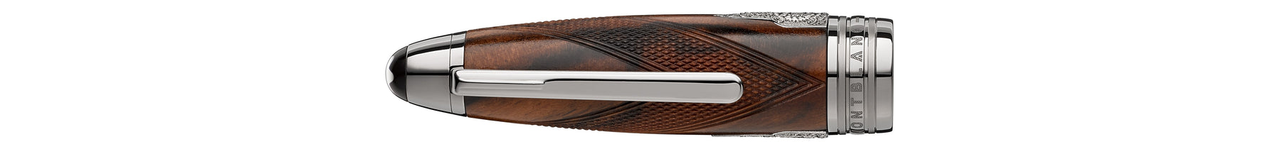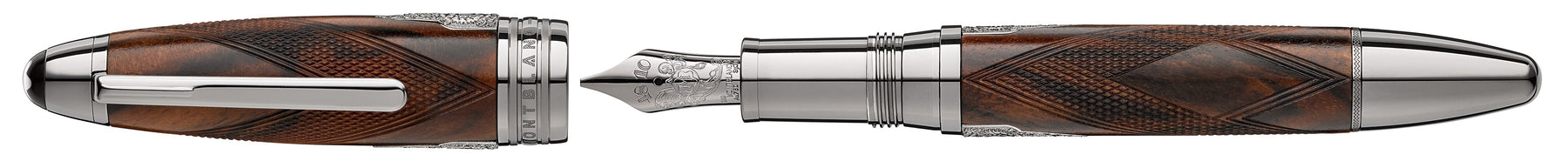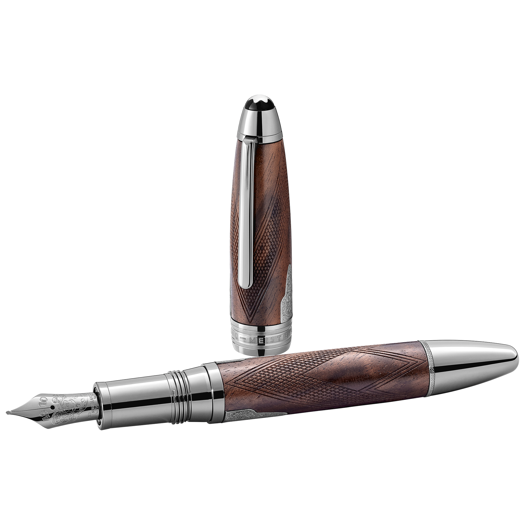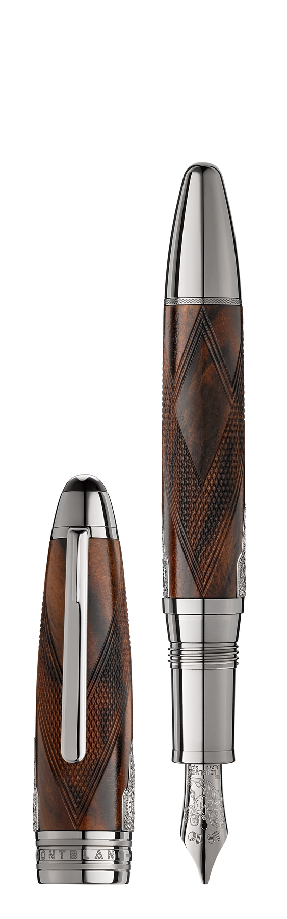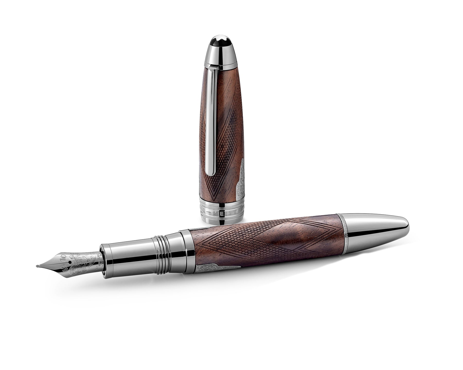 The "Meisterstück Great Masters James Purdey & Sons" unites the expertise of Montblanc – as creator of exquisite writing instruments – with the exclusive Maison, crafter of fine guns and rifles for game hunting. James Purdey & Sons have been serving the world's most demanding customers in search of perfect function, beauty, exclusivity and long-lasting quality. The wood-carving and metal-engraving crafts of the James Purdey Maison are unique, secret and extraordinary. The Meisterstück Fountain Pen is made of caucasian walnut wood with engraved Purdey checkering and casted metal inlay, and features an 18 K gold nib and ruthenium-coated fittings.