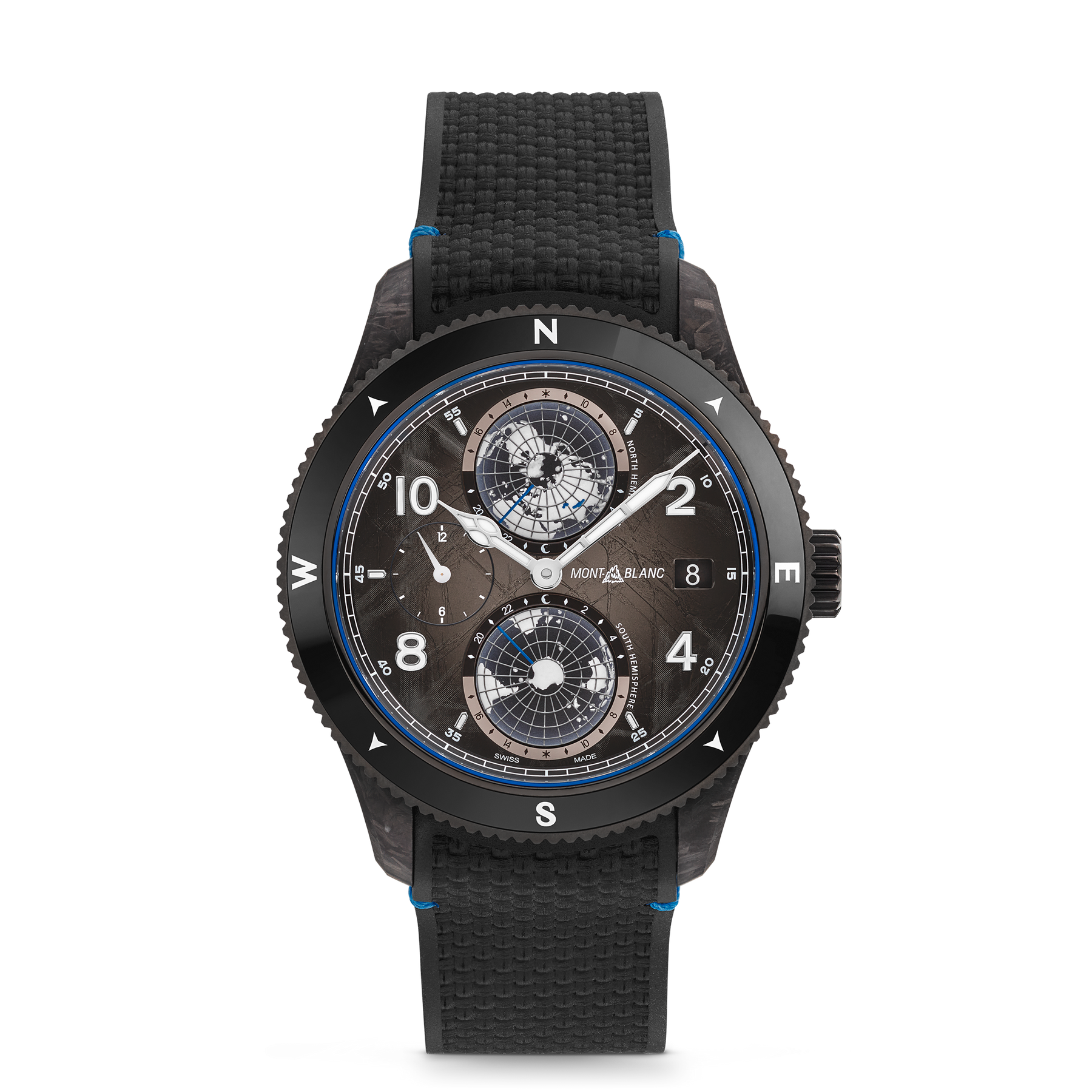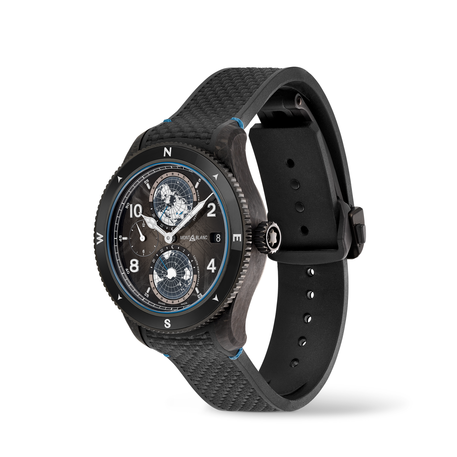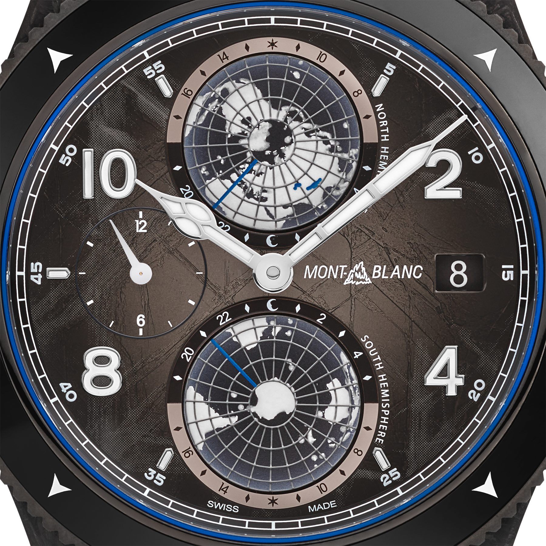 With this limited edition timepiece showcasing a design as strong as the innovation within, Montblanc pushes the concept of oxygen – the central element in any intrepid ascent – even further than before. The watch case material, the CARBO?, is created using a pioneering process development that captures CO? from biogas production and mineral wastes from recycling factories. Reinforcing the theme of adventure, the 43.5 mm case totally devoid of oxygen comes with an engraved luminous blue outline of the Mont Blanc Mountain on the side while a 3D colored laser engraving of the Mont Blanc mountain adorns the titanium case back. The timepiece is powered by the MB 29.25 automatic movement with Montblanc’s Manufacture worldtime complication, which includes rotating Northern and Southern Hemisphere globes, a 24-hour scale, Day & Night indications, dual time display, and a date. Completing the timepiece is a black interchangeable rubber strap featuring a taper and a fine adjustment system, with the pattern reminiscent of the textiles used by mountaineers.