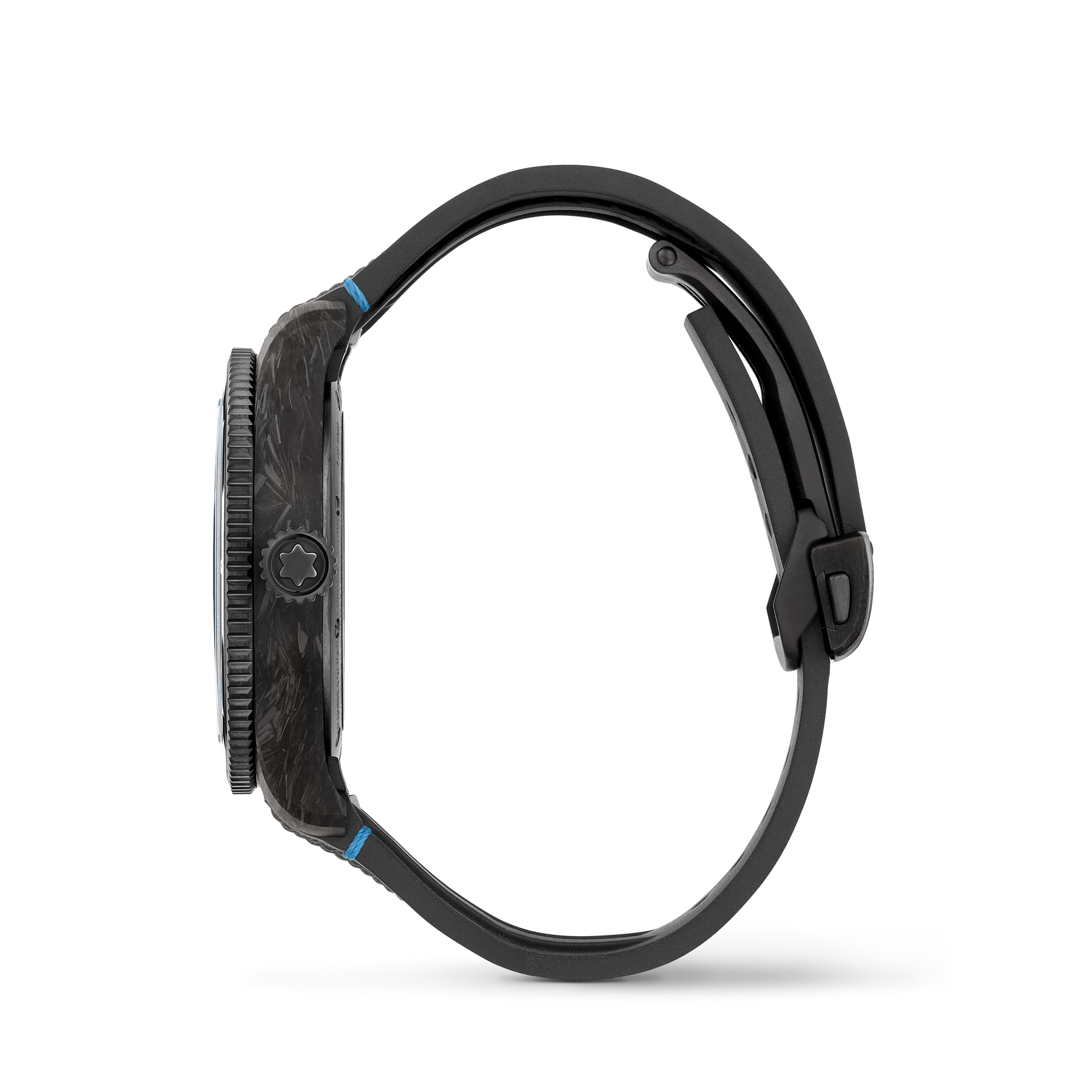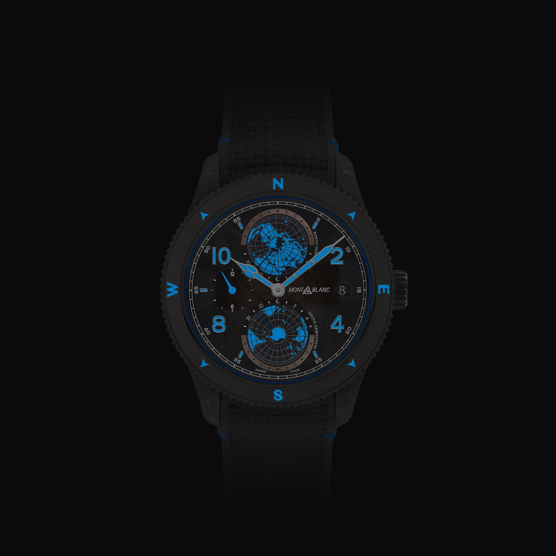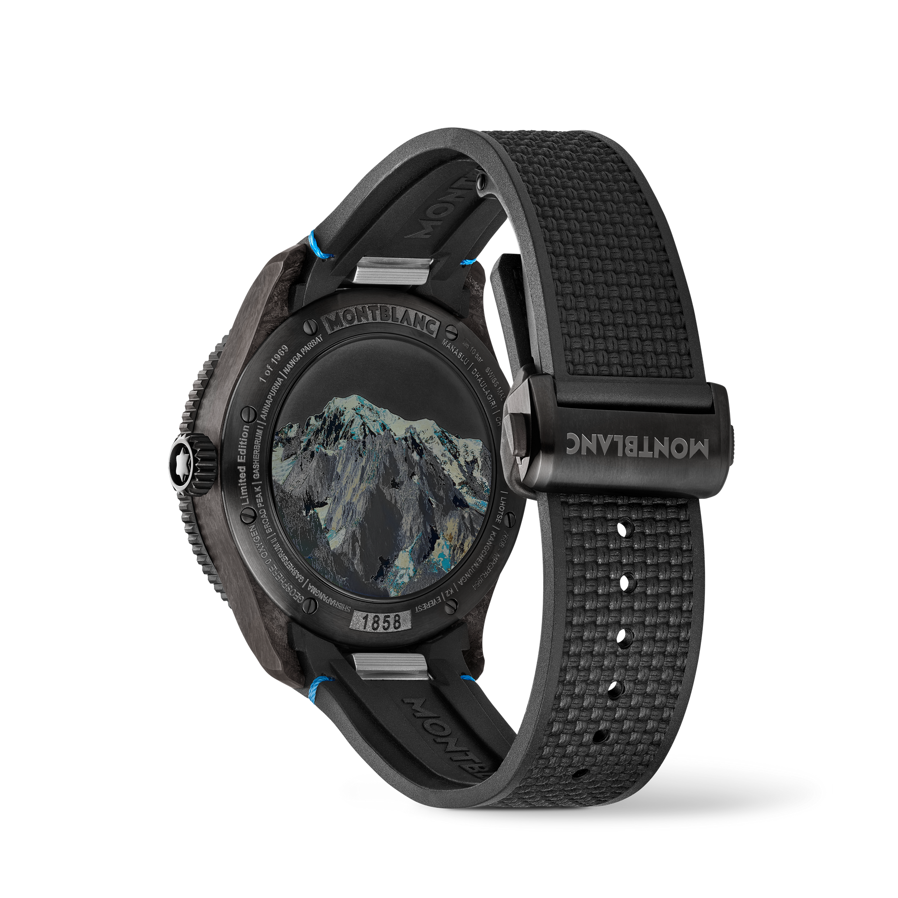 With this limited edition timepiece showcasing a design as strong as the innovation within, Montblanc pushes the concept of oxygen – the central element in any intrepid ascent – even further than before. The watch case material, the CARBO?, is created using a pioneering process development that captures CO? from biogas production and mineral wastes from recycling factories. Reinforcing the theme of adventure, the 43.5 mm case totally devoid of oxygen comes with an engraved luminous blue outline of the Mont Blanc Mountain on the side while a 3D colored laser engraving of the Mont Blanc mountain adorns the titanium case back. The timepiece is powered by the MB 29.25 automatic movement with Montblanc’s Manufacture worldtime complication, which includes rotating Northern and Southern Hemisphere globes, a 24-hour scale, Day & Night indications, dual time display, and a date. Completing the timepiece is a black interchangeable rubber strap featuring a taper and a fine adjustment system, with the pattern reminiscent of the textiles used by mountaineers.