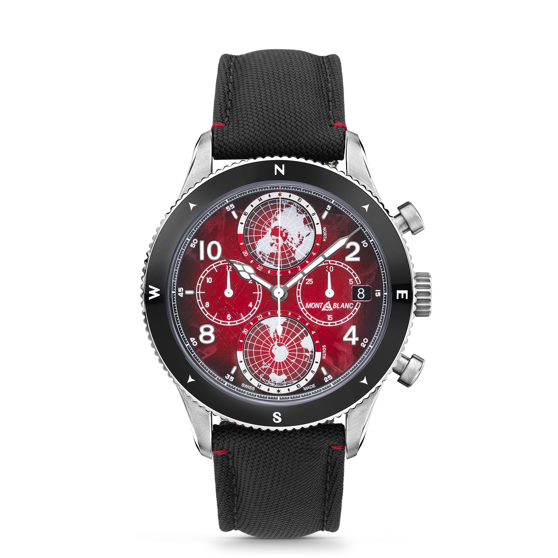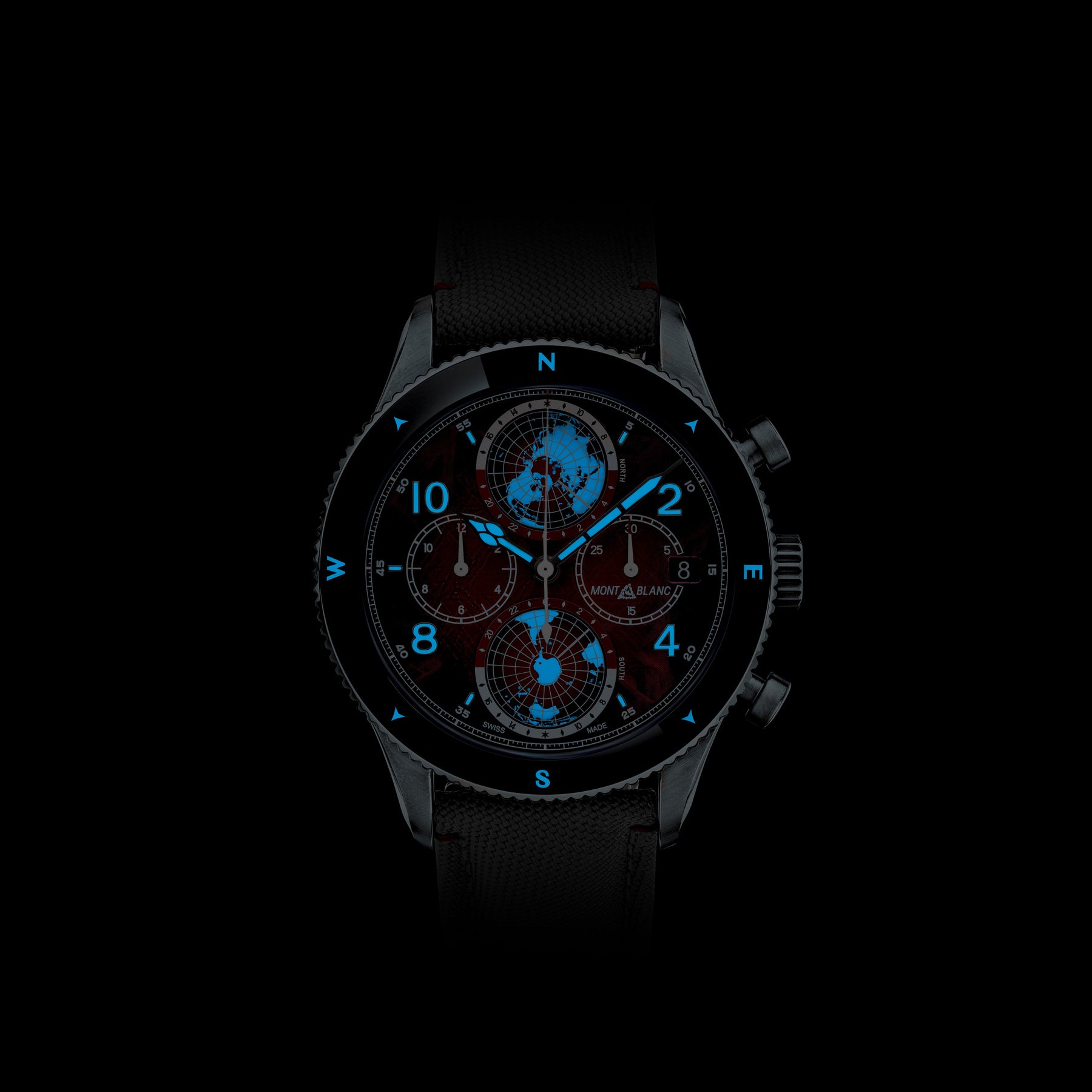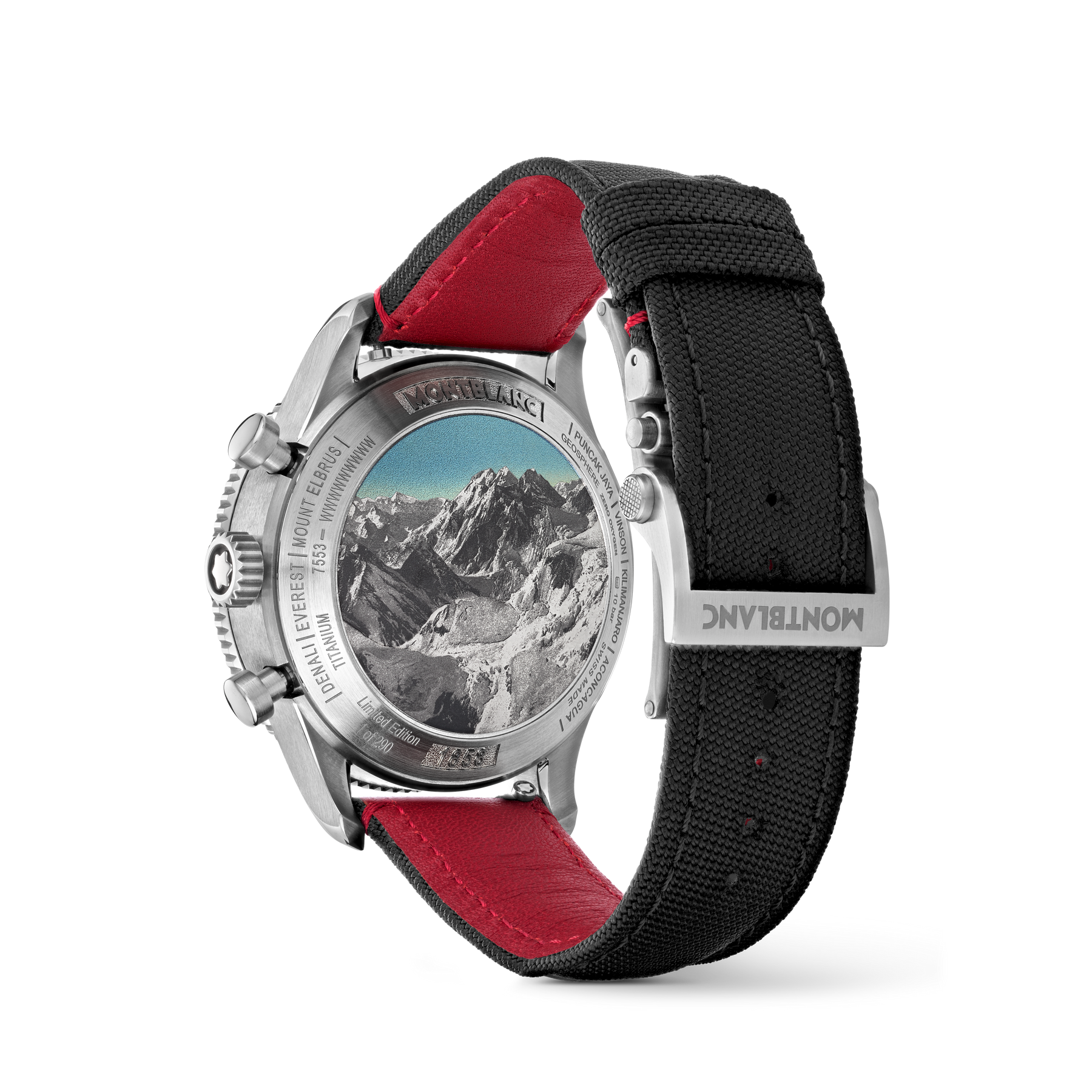Inspired by the red glaciers found in Antarctica, this limited edition celebrating the 80th birthday of Reinhold Messner, comes with a red sfumato glacier pattern dial. The 44 mm timepiece has been encased in such a way that there is no oxygen inside. This unusual operation has numerous benefits for mountaineers who need their equipment to work perfectly in the harshest climates, making it the perfect model to pay tribute to Reinhold Messner and his numerous achievements. Powered by Montblanc’s Manufacture chronograph with worldtime complication, calibre MB 29.27, this automatic movement includes a date at 3 o’clock and two 3D turning globes with the Northern Hemisphere at 12 o’clock and the Southern Hemisphere at 6 o’clock. The timepiece is fitted with a fluted bi-directional black ceramic bezel with cardinal points and an interchangeable black textile strap with a touch of red stitching that recalls the wonders of the rare red glaciers.