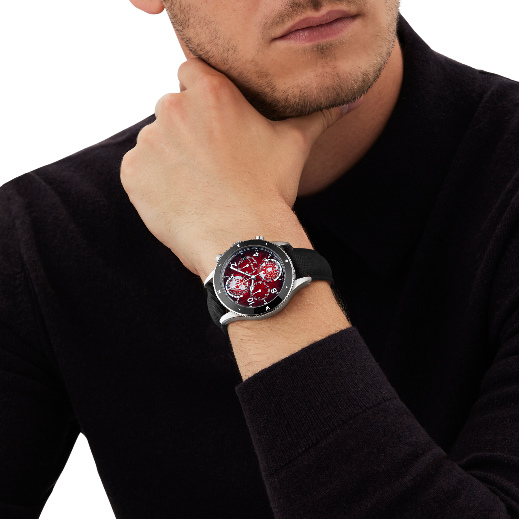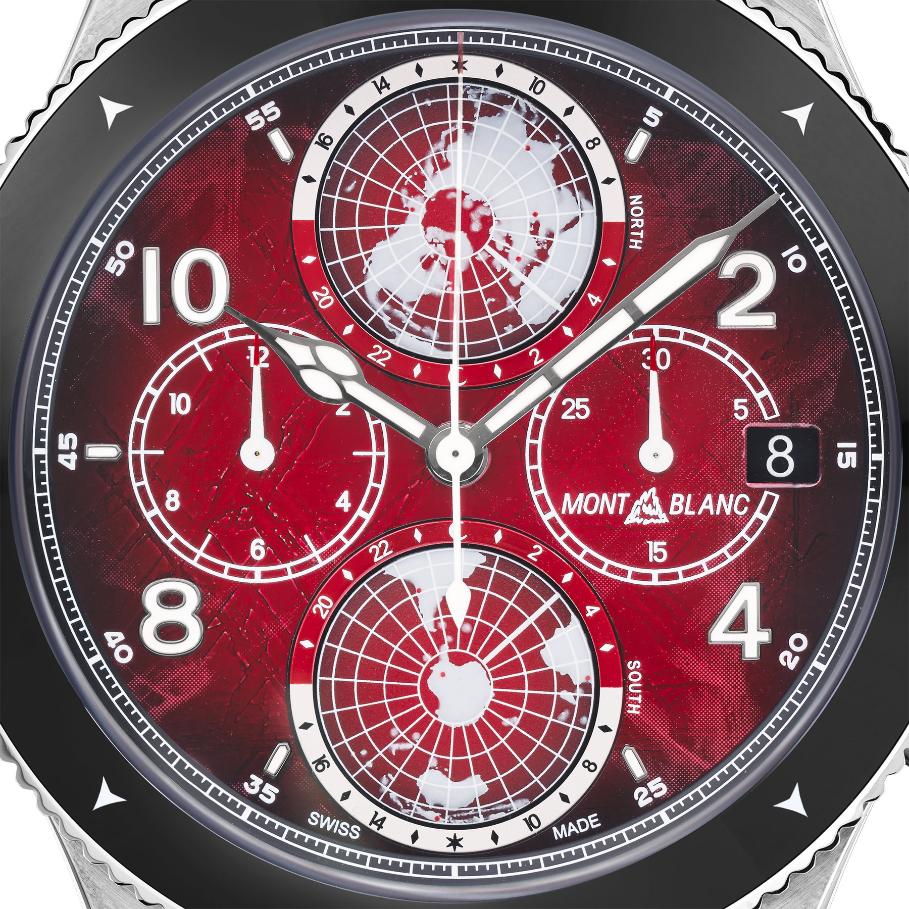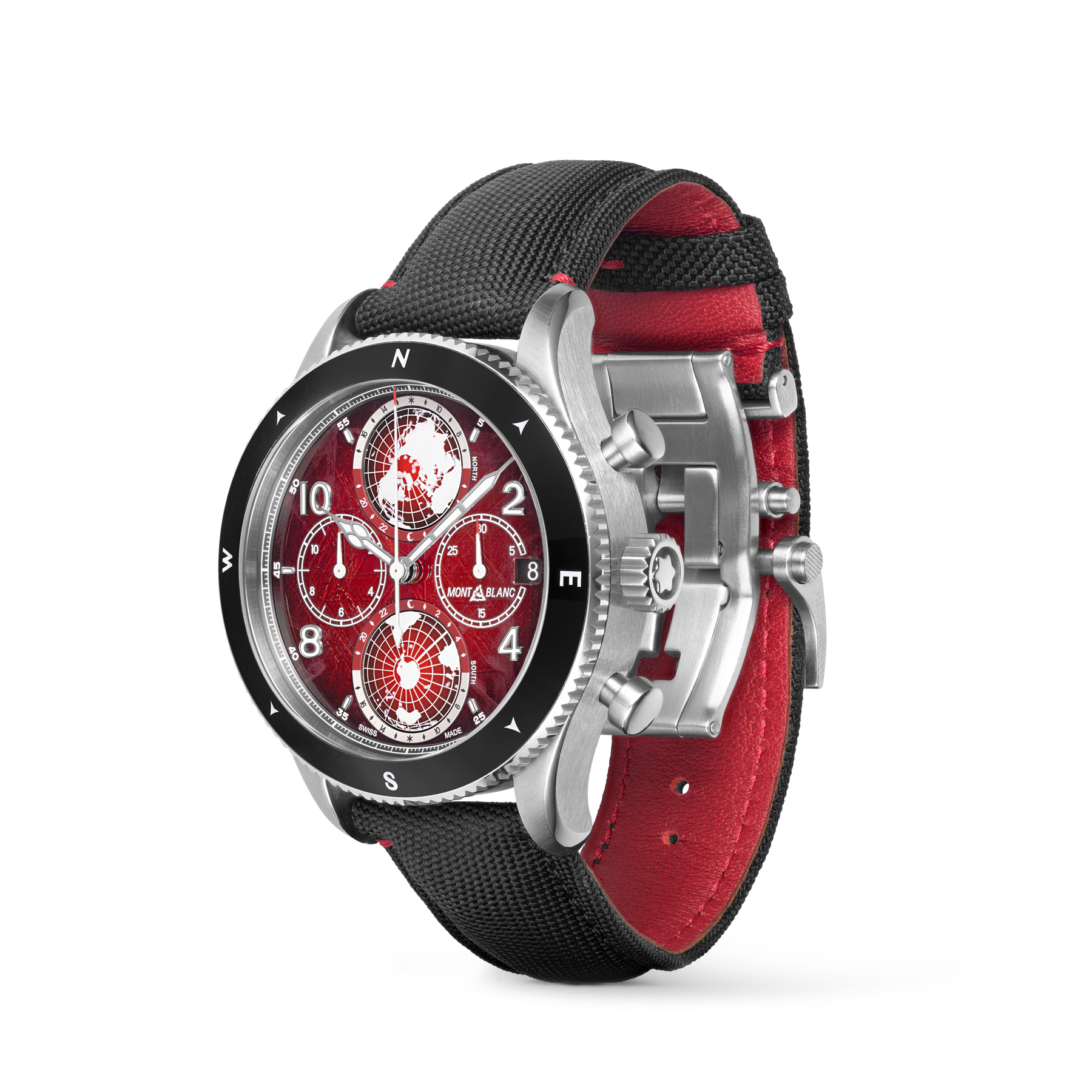 Inspired by the red glaciers found in Antarctica, this limited edition celebrating the 80th birthday of Reinhold Messner, comes with a red sfumato glacier pattern dial. The 44 mm timepiece has been encased in such a way that there is no oxygen inside. This unusual operation has numerous benefits for mountaineers who need their equipment to work perfectly in the harshest climates, making it the perfect model to pay tribute to Reinhold Messner and his numerous achievements. Powered by Montblanc’s Manufacture chronograph with worldtime complication, calibre MB 29.27, this automatic movement includes a date at 3 o’clock and two 3D turning globes with the Northern Hemisphere at 12 o’clock and the Southern Hemisphere at 6 o’clock. The timepiece is fitted with a fluted bi-directional black ceramic bezel with cardinal points and an interchangeable black textile strap with a touch of red stitching that recalls the wonders of the rare red glaciers.