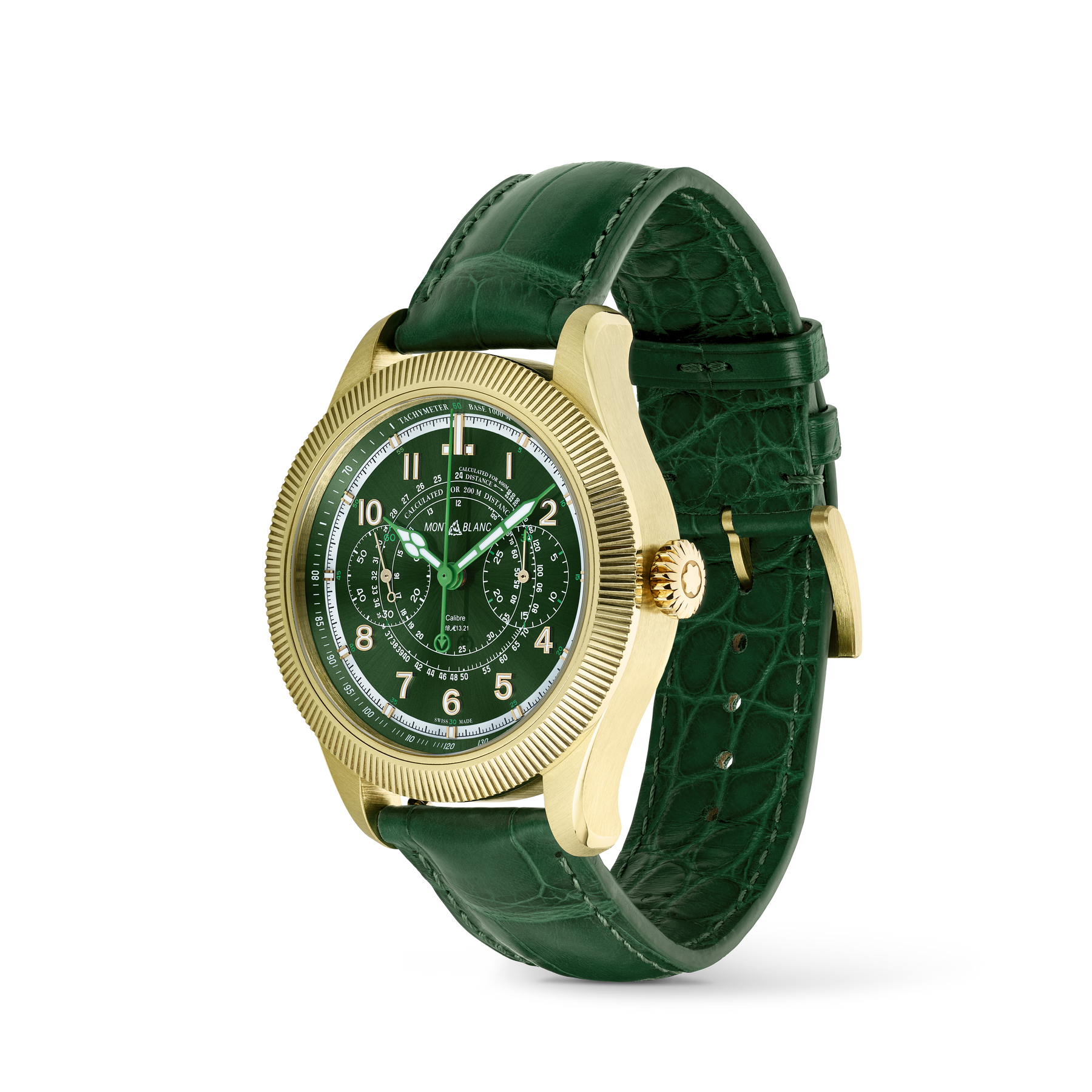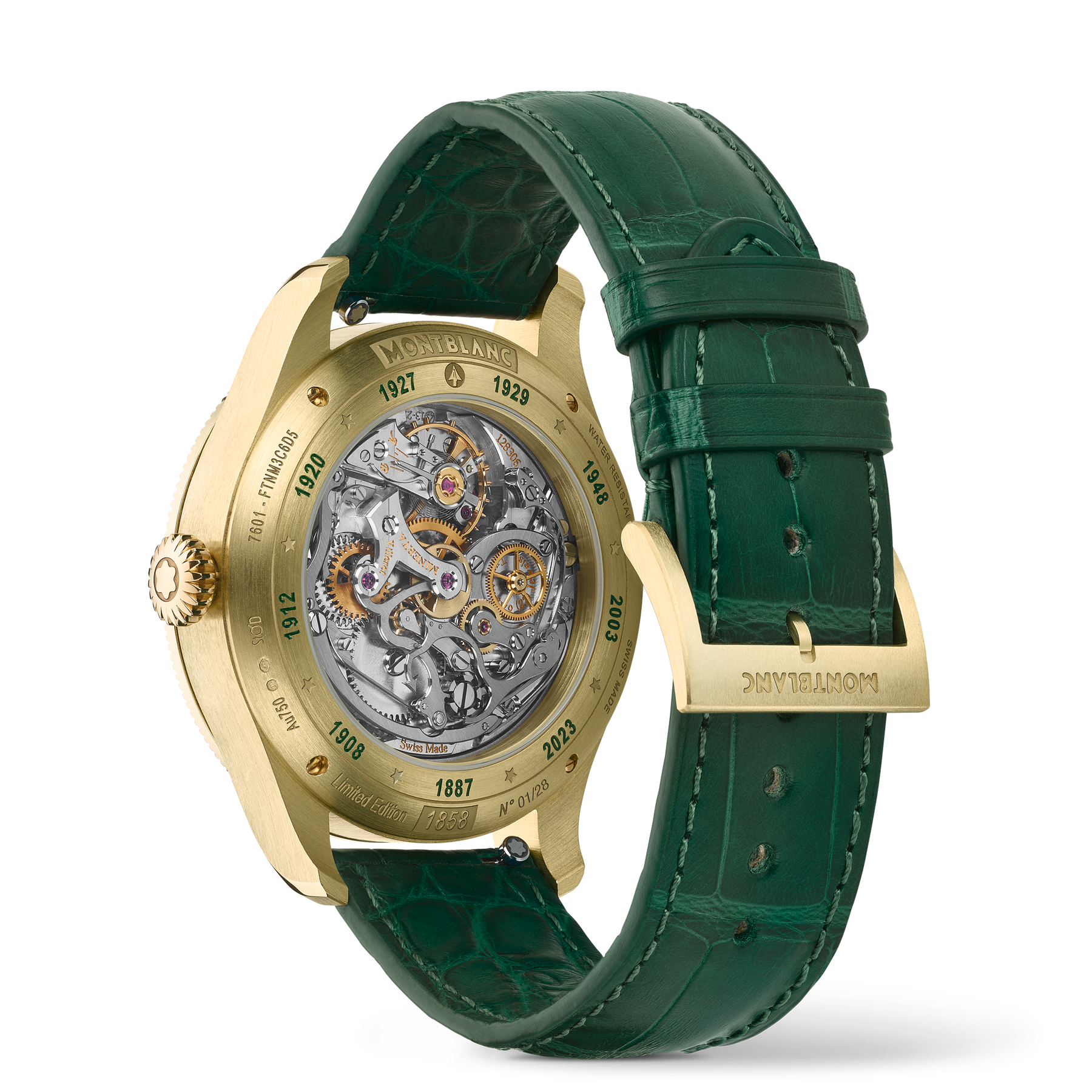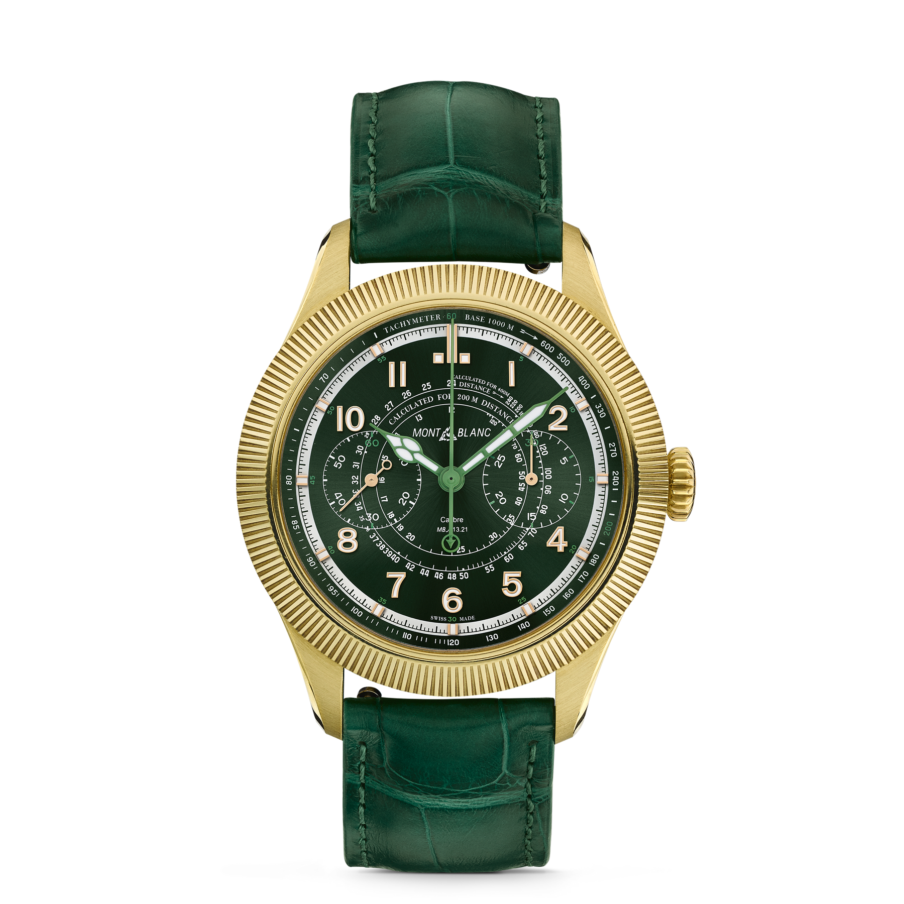 The Montblanc 1858 Unveiled Timekeeper Minerva Limited Edition introduces a brand-new chronograph function. Instead of using traditional pushers, the chronograph is activated via the fluted bezel. Just one click of the Lime Gold 750/1000 (18 karats) fluted bezel will start the chronograph. A second click will stop it, and a third click will reset it, transforming the chronograph as we know it. The timepiece comes in a 42.5 mm Lime Gold 750/1000 (18 karats) case and is fitted with a dark green dial and a green interchangeable alligator leather strap. It is powered by the hand-finished manually wound Caliber MB M13.21 and is limited to 28 pieces.