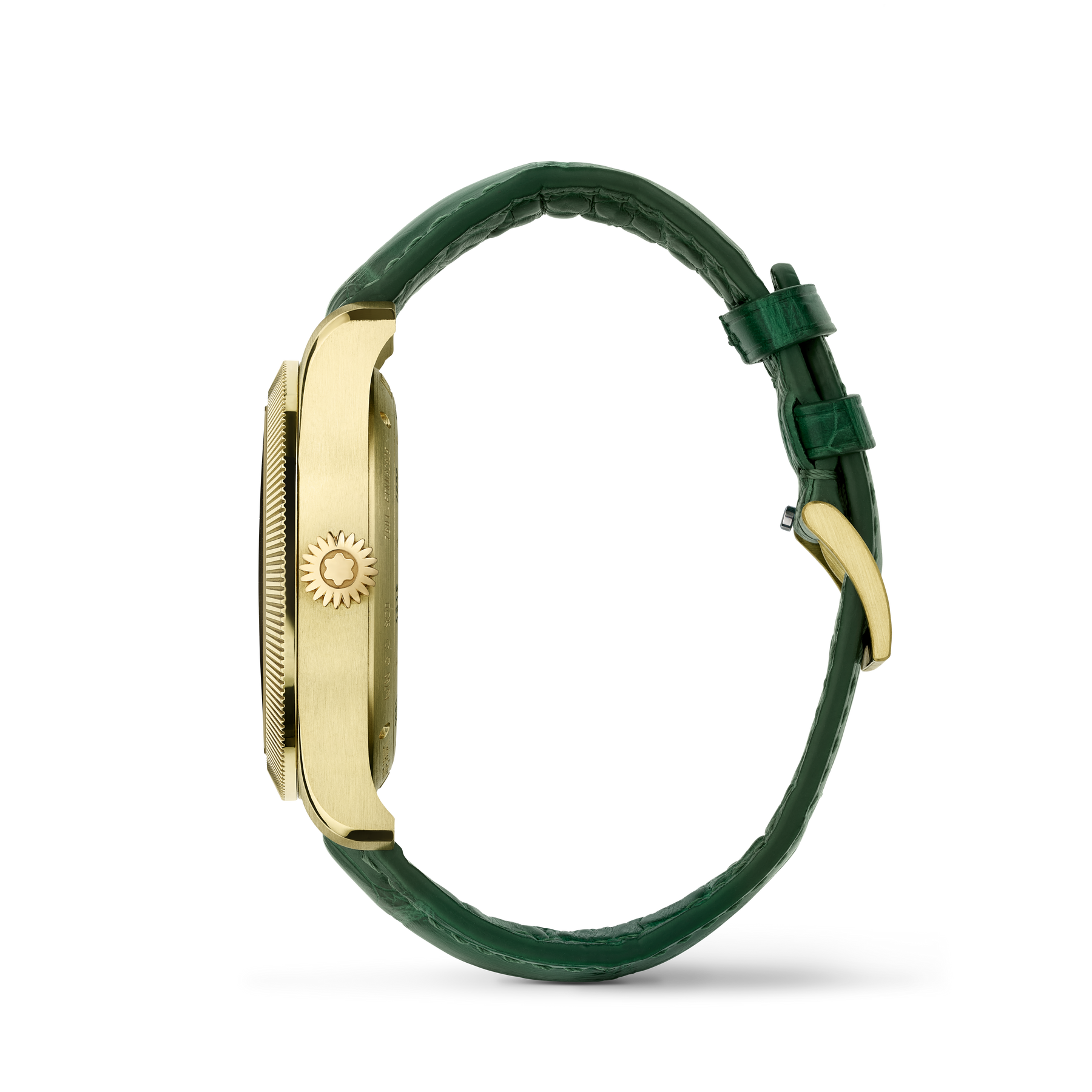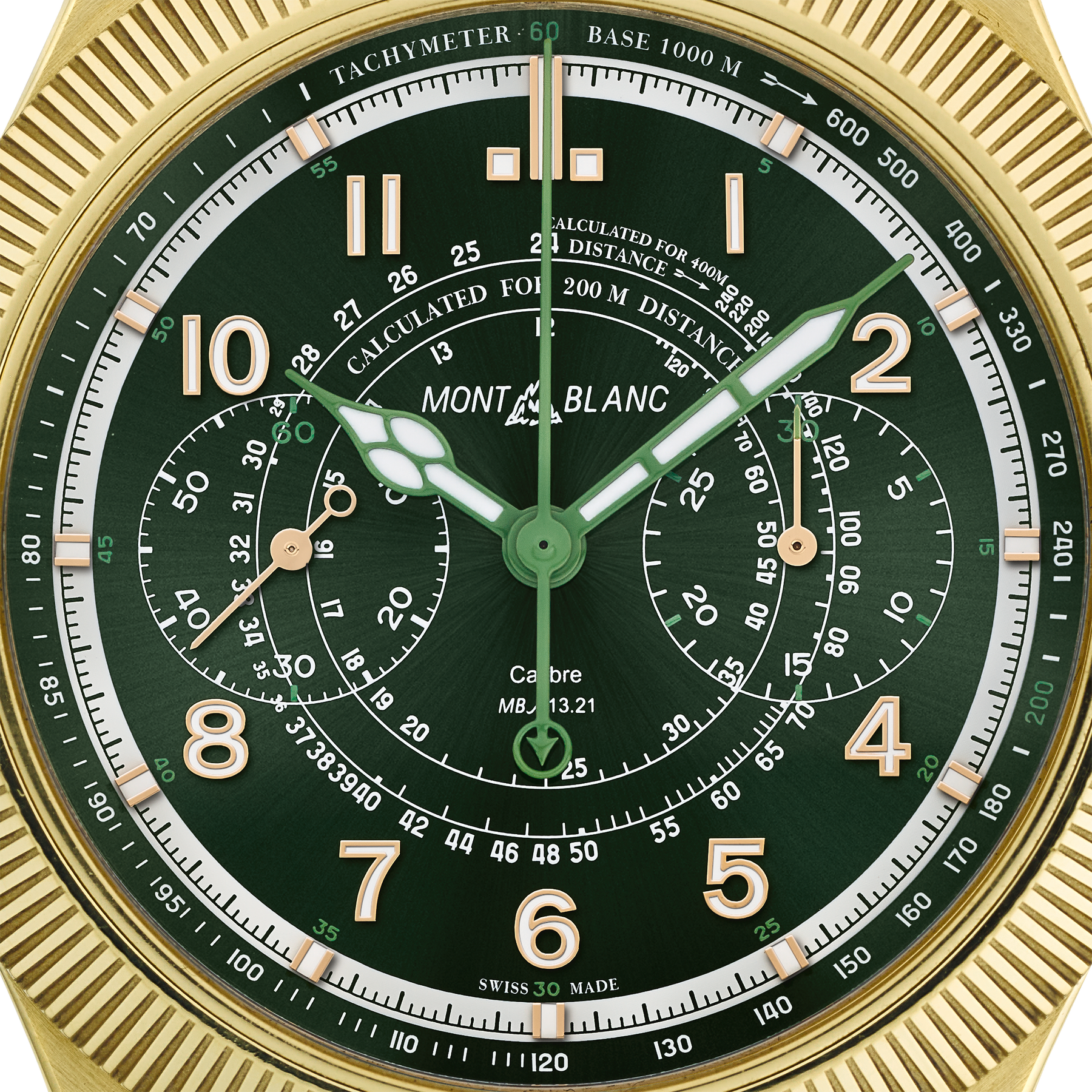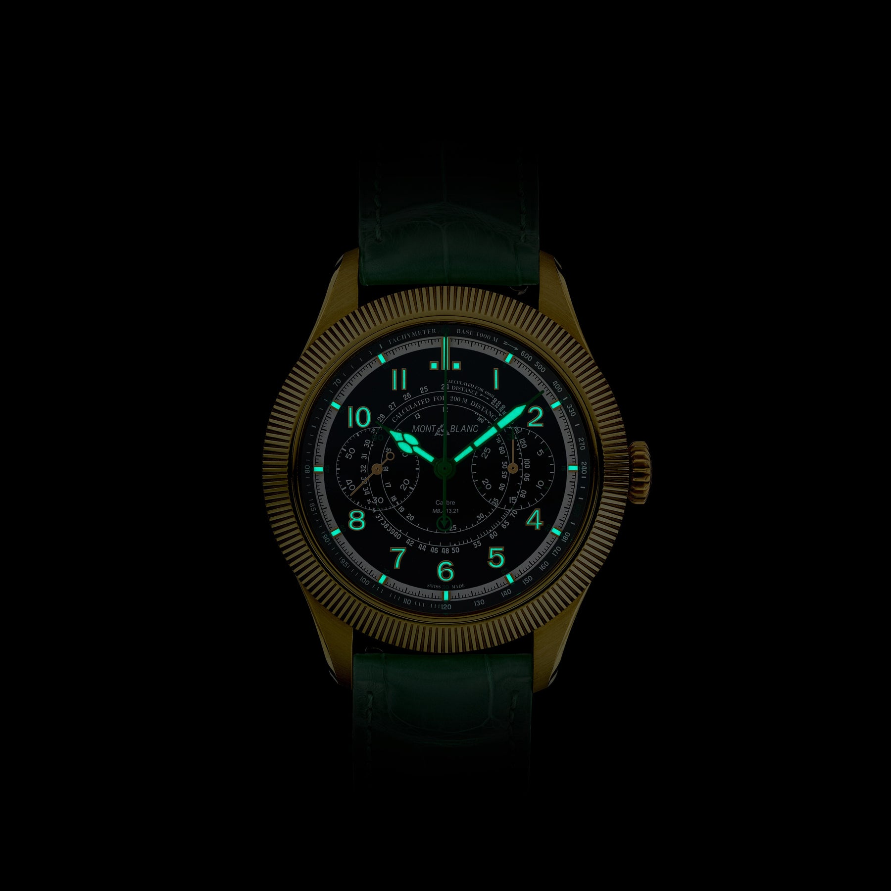 The Montblanc 1858 Unveiled Timekeeper Minerva Limited Edition introduces a brand-new chronograph function. Instead of using traditional pushers, the chronograph is activated via the fluted bezel. Just one click of the Lime Gold 750/1000 (18 karats) fluted bezel will start the chronograph. A second click will stop it, and a third click will reset it, transforming the chronograph as we know it. The timepiece comes in a 42.5 mm Lime Gold 750/1000 (18 karats) case and is fitted with a dark green dial and a green interchangeable alligator leather strap. It is powered by the hand-finished manually wound Caliber MB M13.21 and is limited to 28 pieces.