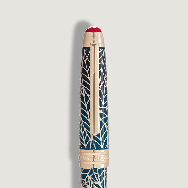 In the Romeo & Juliet Solitaire Edition, the lovers finally become one. The initials of both family names, ‘M’ and ‘C’, are engraved on the signature gold-coated cap top, while the handcrafted, solid Au 750 gold nib is embossed with the initials ‘R’ and ‘J’, the first letters of the lovers’ names. Cap and barrel are decorated with a delicate gradient lacquer running from pale to rich dark green and covered with a filigree signature gold-coated leaf pattern. Thorny branches coil around the cap top, symbolising the pain of a love that came to such a tragic end.