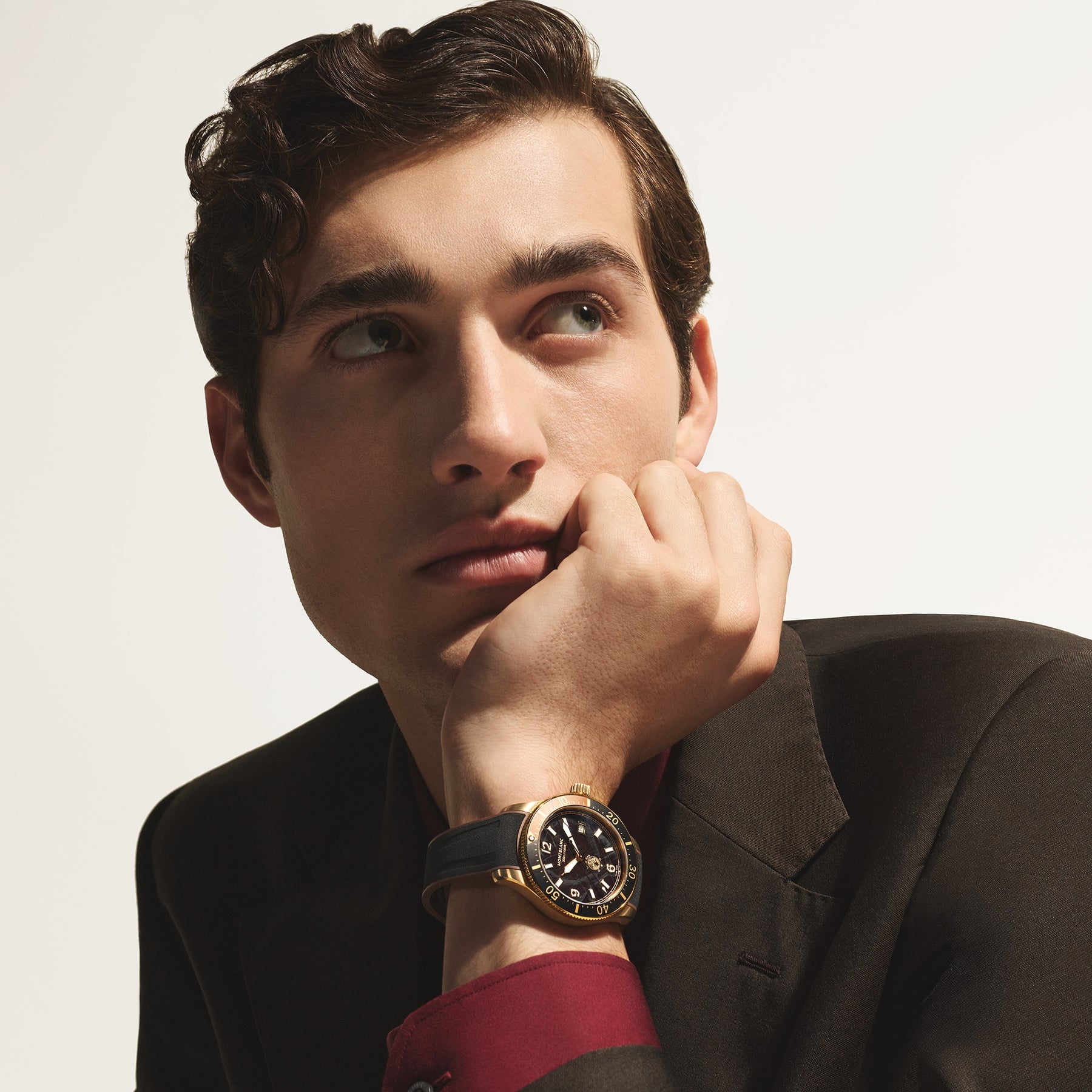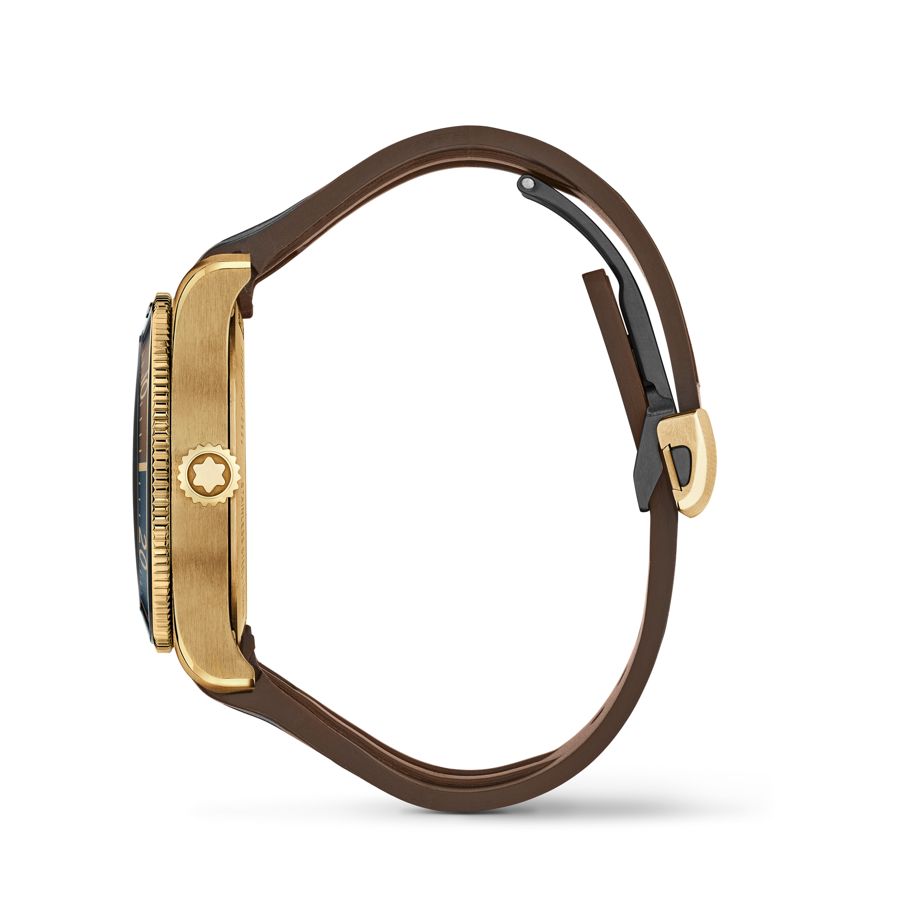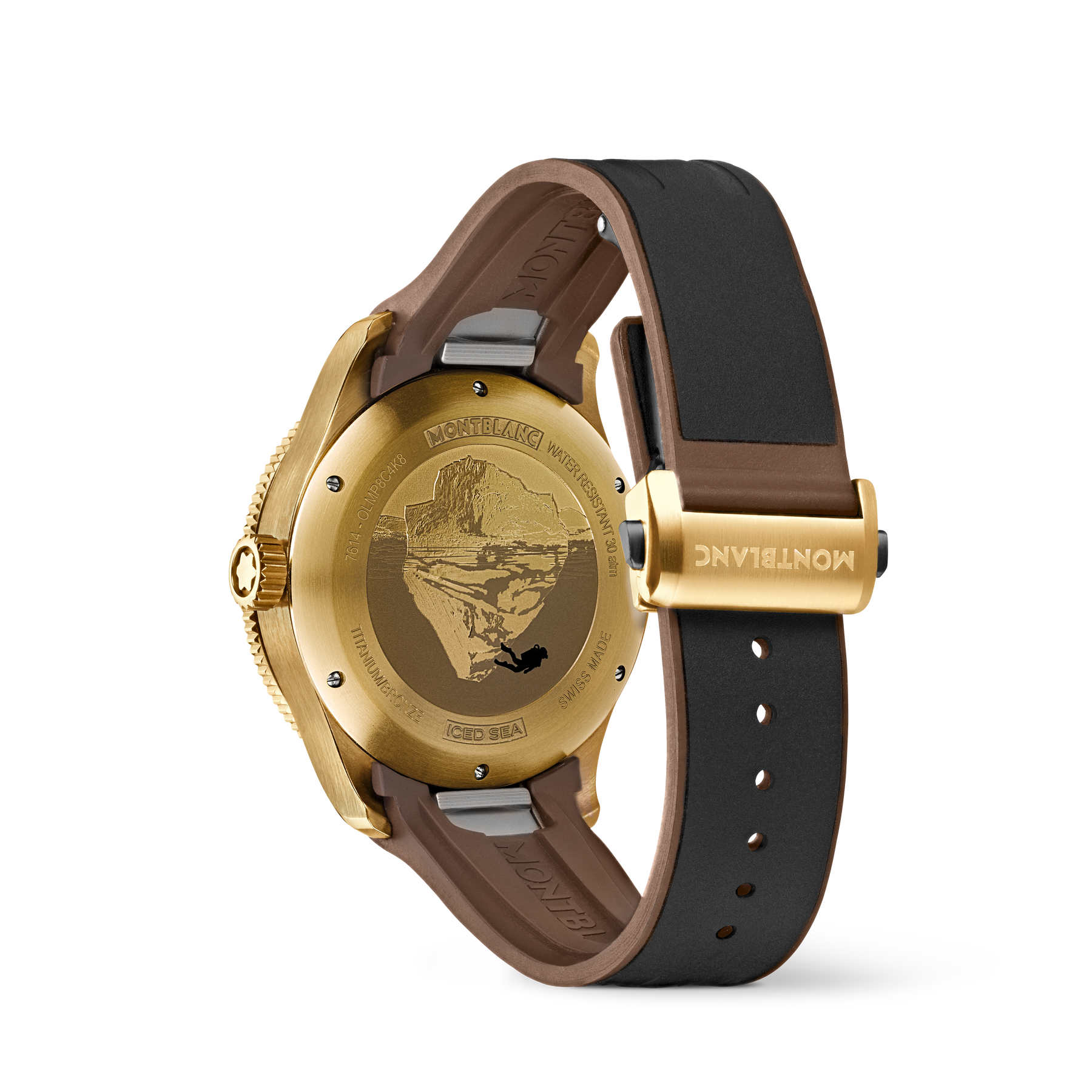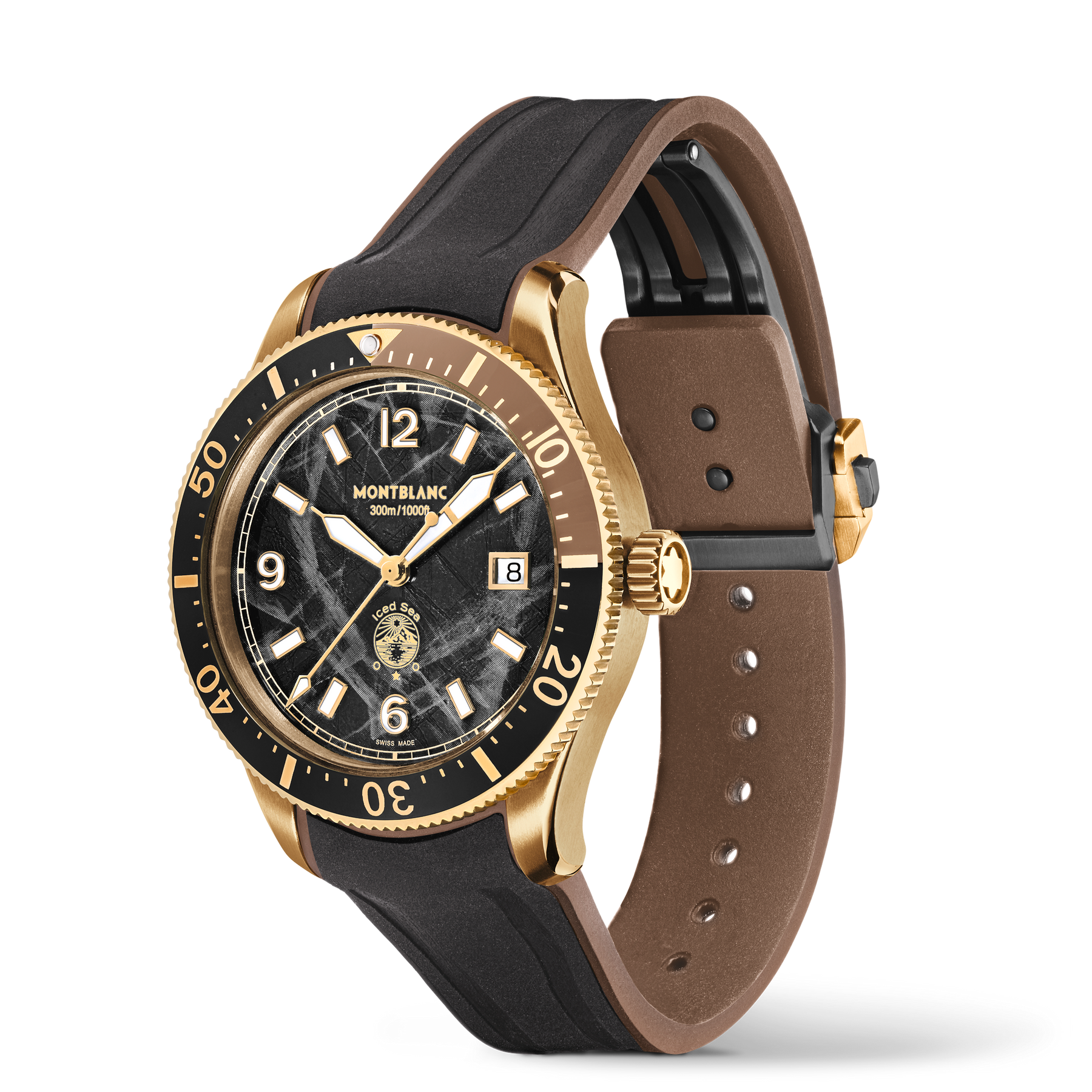 Capturing the colour of the setting sun over the glacier, this Montblanc Iced Sea Automatic Date combines a black glacier pattern dial with a warm bronze case. The glacier pattern dial is inspired by the Mer de Glace - Sea of Ice - the main glacier of the Mont-Blanc Massif. Its texture was achieved using an almost-forgotten ancestral technique called gratté-boisé. This bronze edition comes with a bi-colour unidirectional anodized aluminum bezel, a 3D engraving on the bronze-coated titanium case back, and an interchangeable black rubber strap with brown outline and fine adjustment system. It is water-resistant to 300 meters.