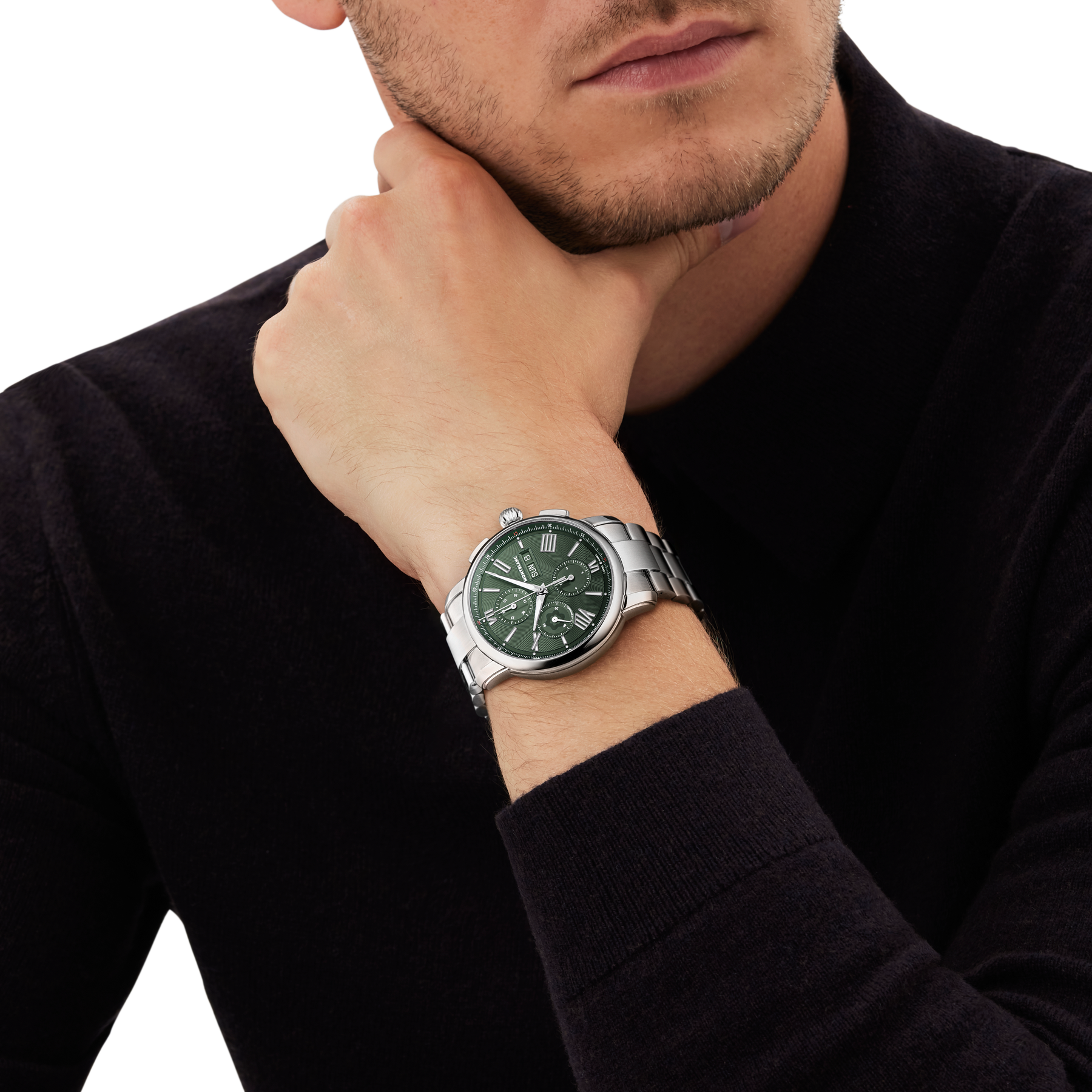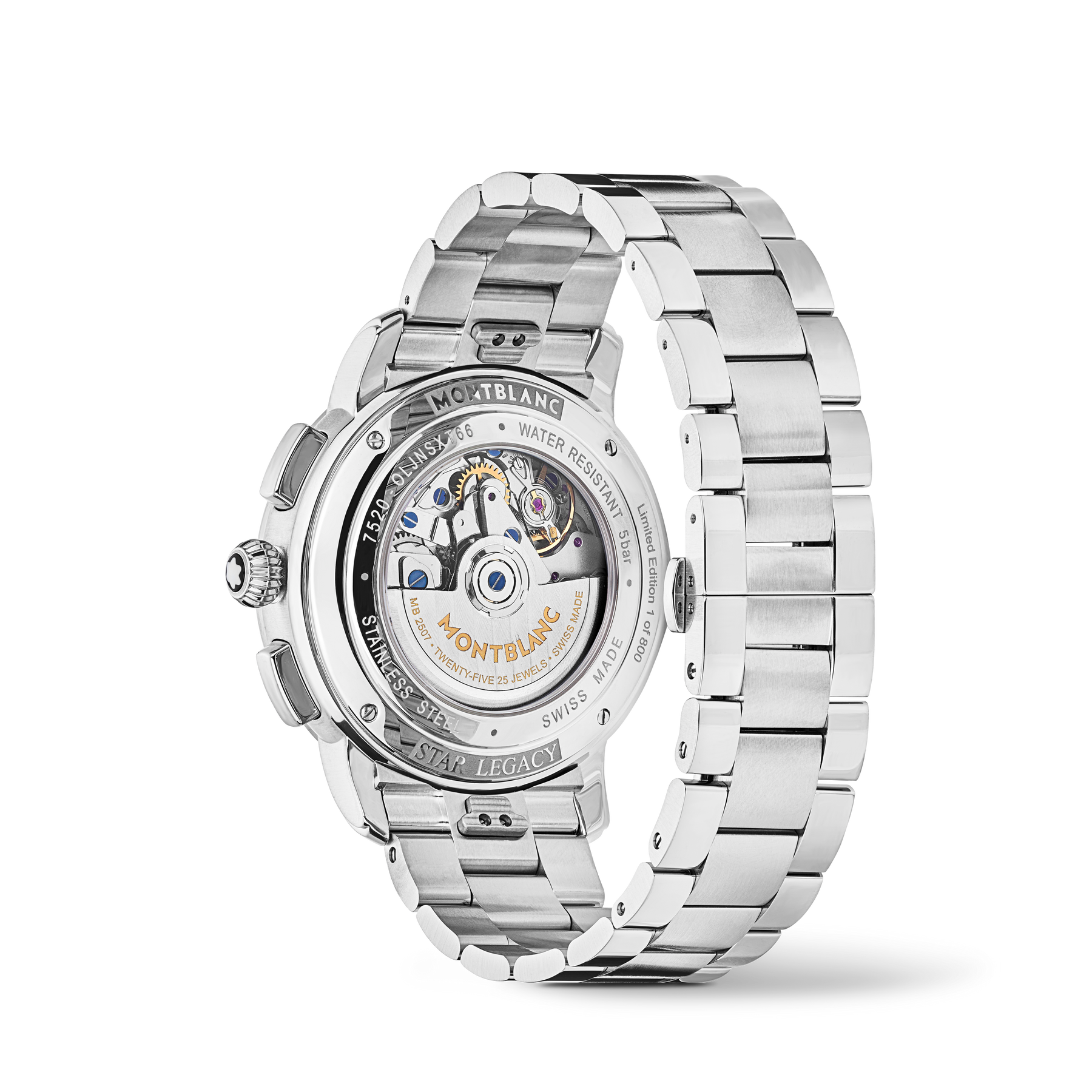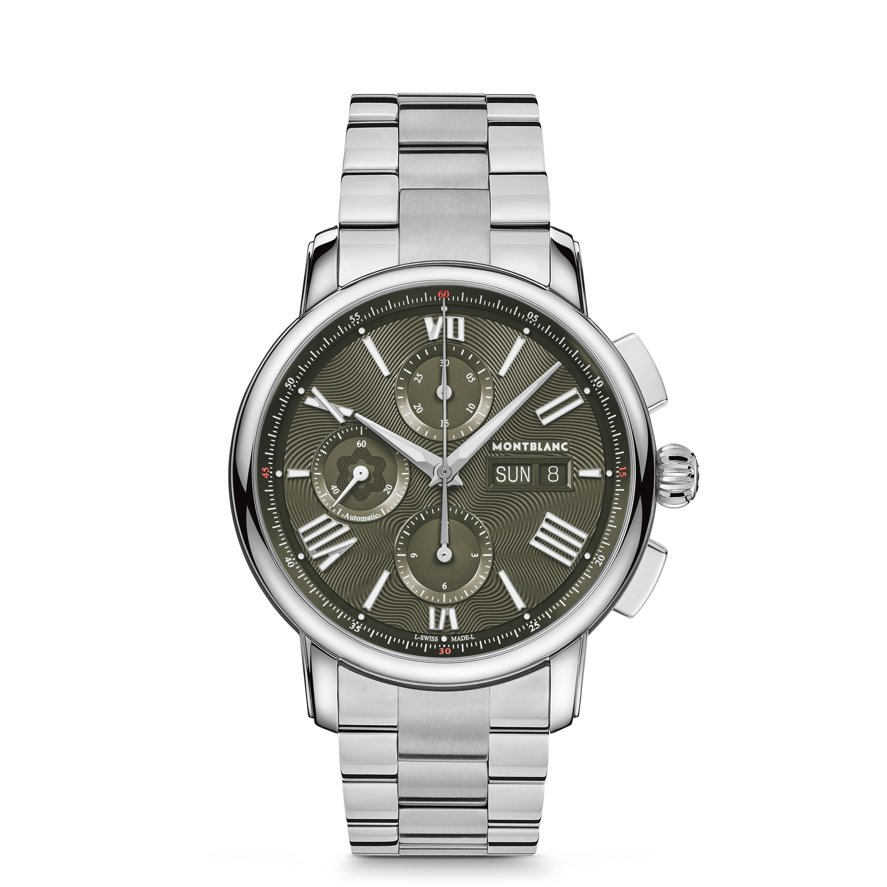 The Montblanc Star Legacy Chronograph Day & Date Limited Edition of 800 pieces takes its inspiration from Minerva pocket watches from the late 19th and early 20th century with their round, polished, pebble-shaped cases and onion-shaped crowns. Its beautiful green dial features Montblanc’s signature exploding star pattern along with rhodium-coated sword-shaped hands and numerals. It is powered by the automatic movement MB 25.07 that includes a chronograph, the day of the week, and the date. This timepiece is also fitted with an interchangeable stainless steel bracelet.
