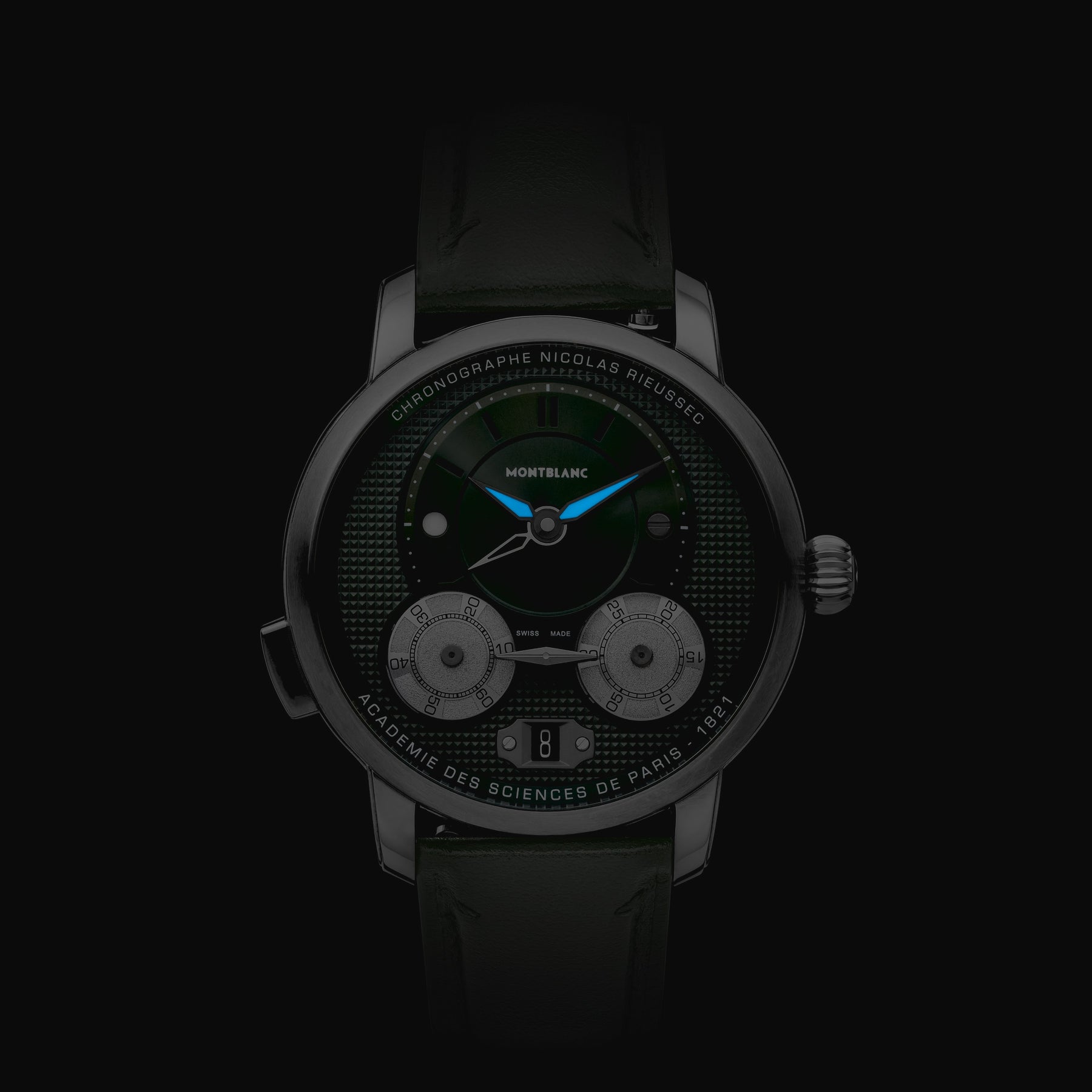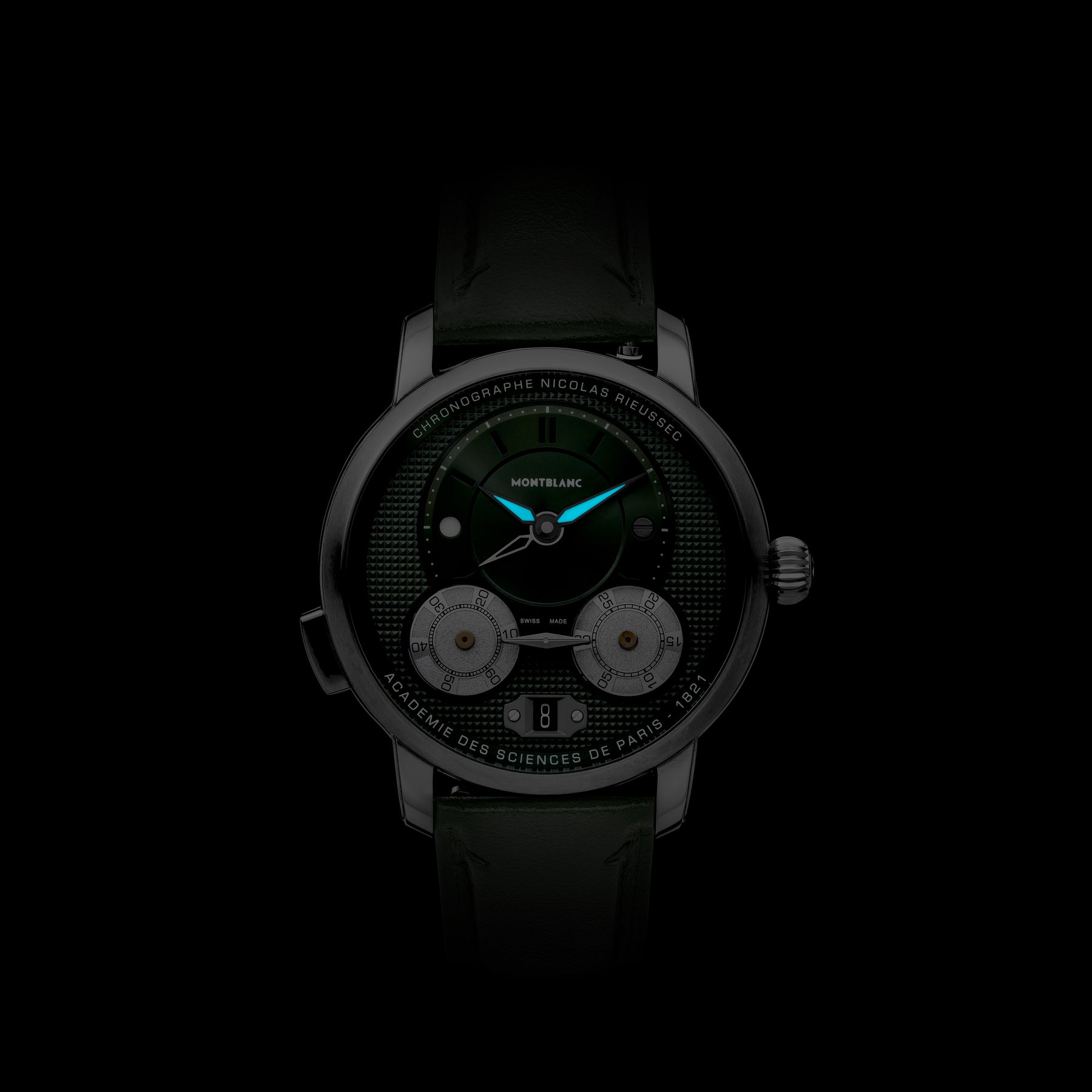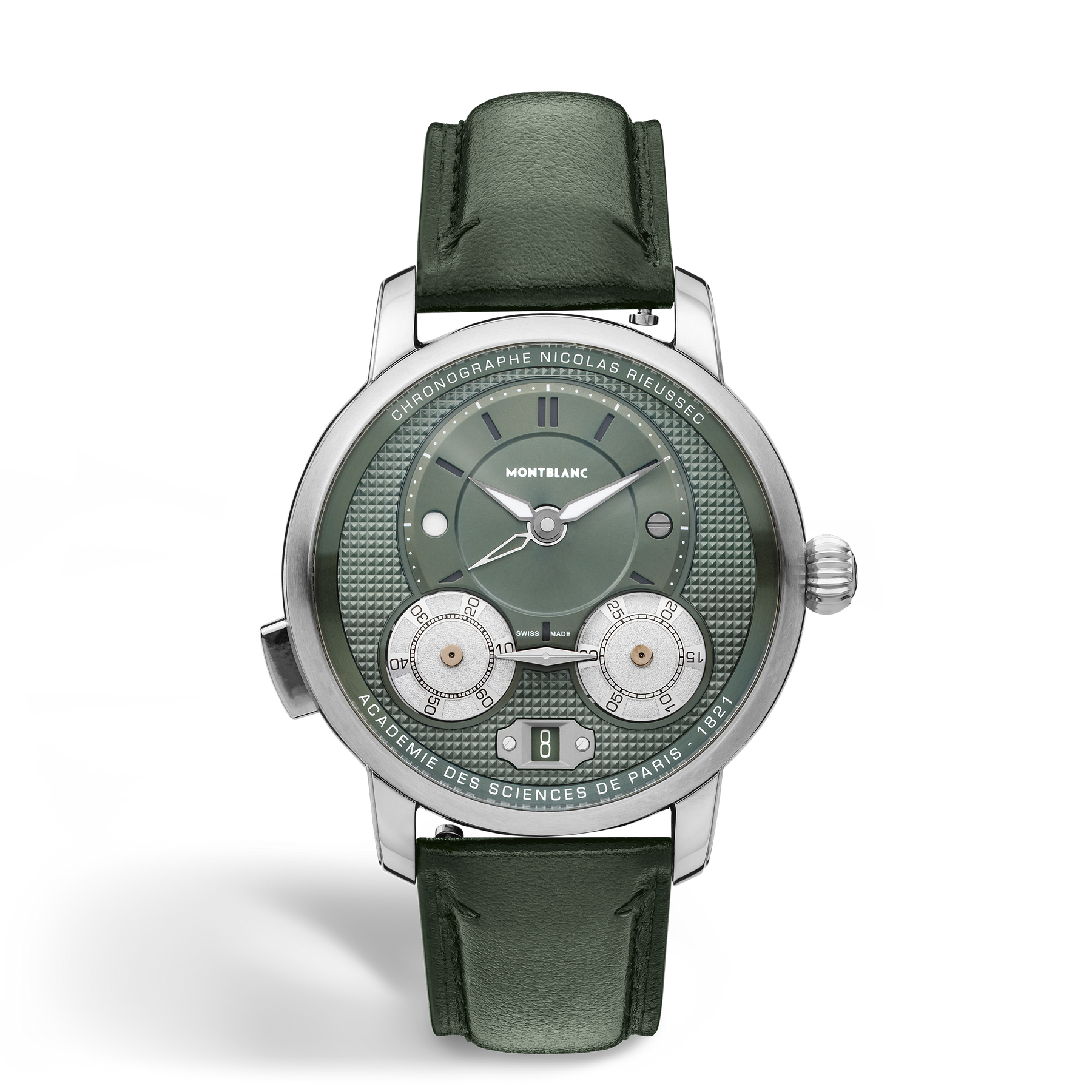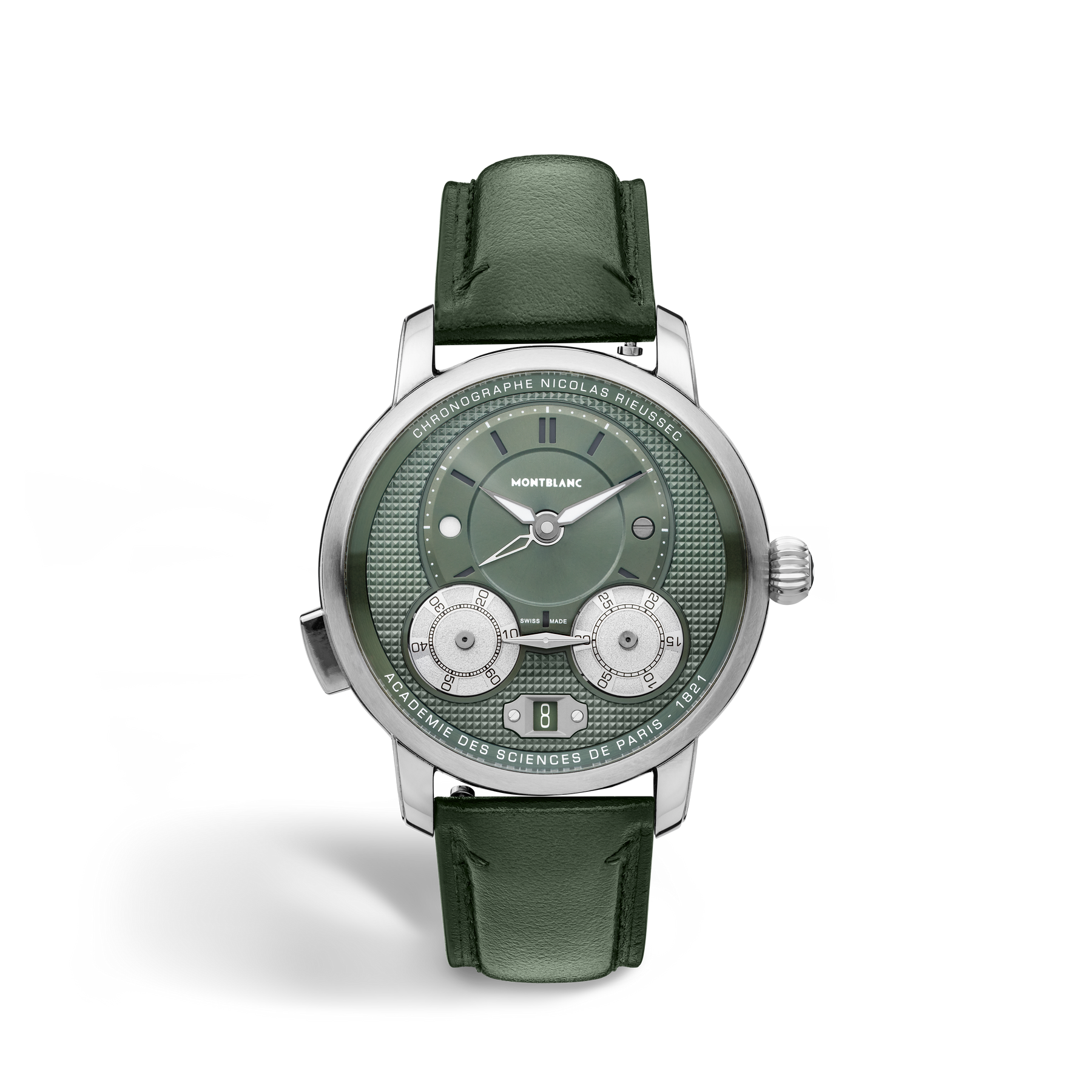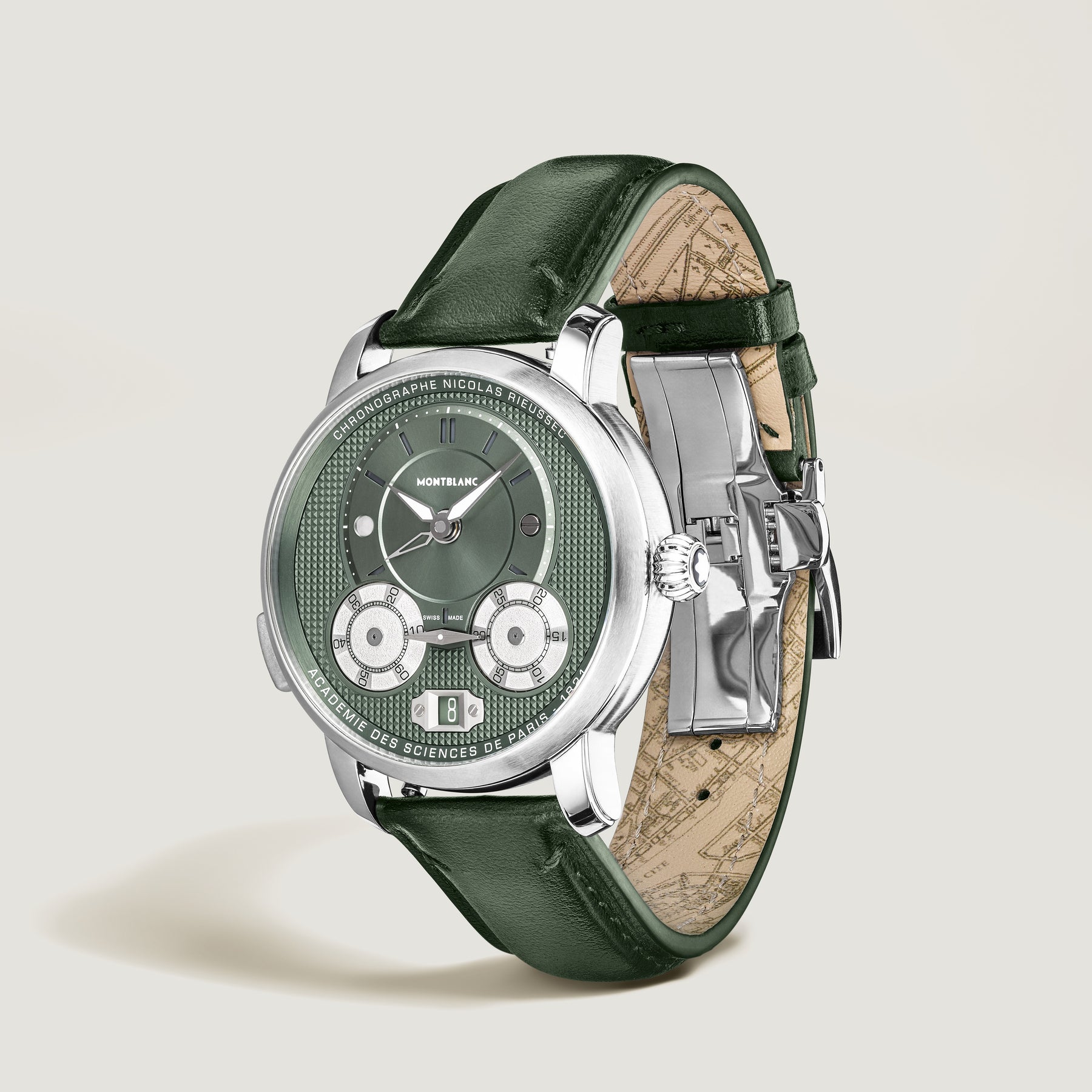 The Montblanc Star Legacy Nicolas Rieussec Chronograph reinforces the Parisian connection with many elements that celebrate the City of Light. A graphic Clous de Paris motif on the elegant green dial originates from the geomectric design of Paris's cobbled streets, and is continued onto the oscillating weight. A mention in French of the "Académie des Sciences de Paris" and "Chronographe Nicolas Rieussec" is engraved on the flange, as a reminder that the academy validated Rieussec's invention in 1821. The lining of the strap has also been enhanced with a map of Paris from 1821. The green interchangeable calf leather strap has been specially designed by Montblanc's Artistic Director Marco Tomasetta who found inspiration in the Maison's writing instrument nibs for its pointed shape. The timepiece comes in a 43 mm stainless steel case and is powered by the self-winding Manufacture monopusher chronograph movement MB R200.