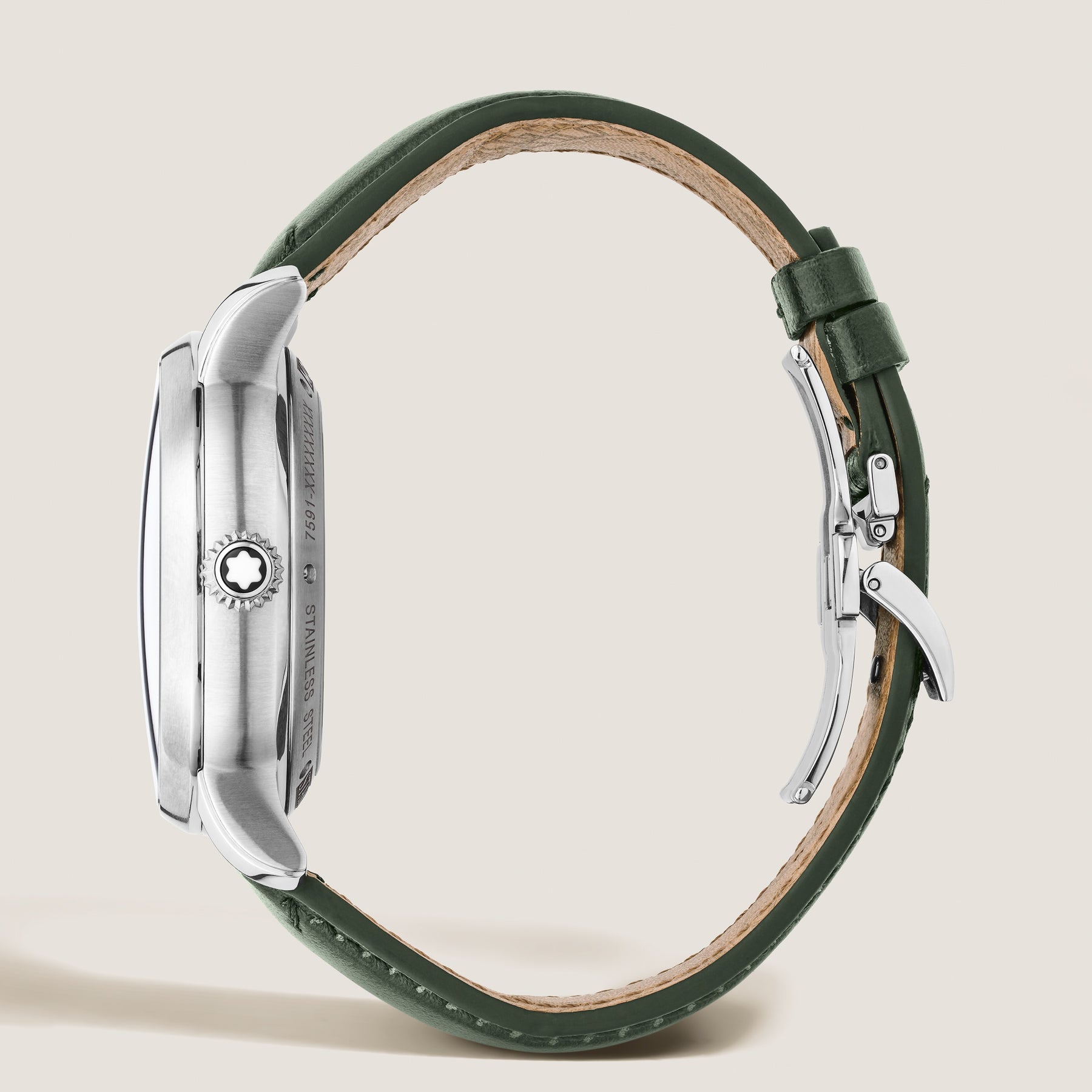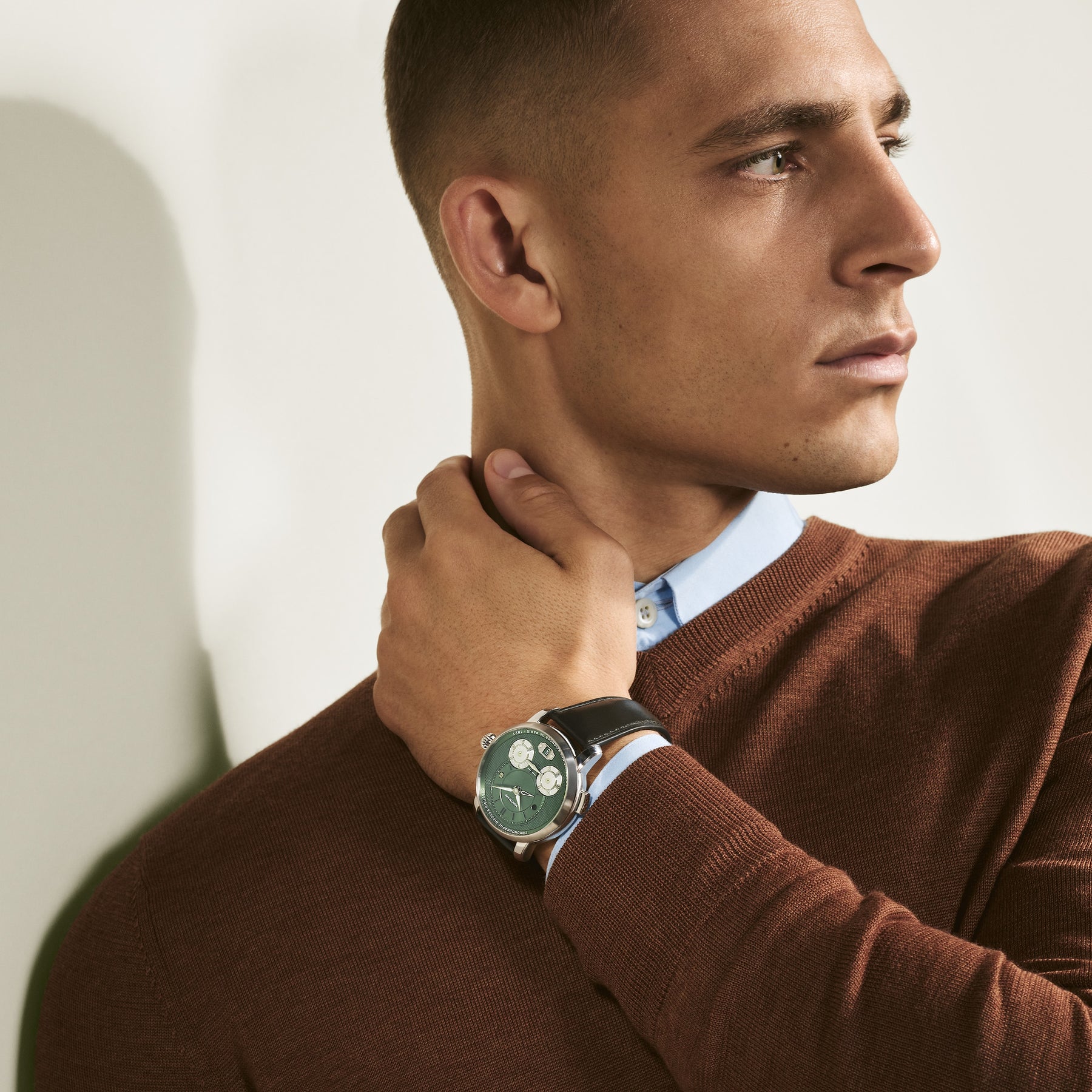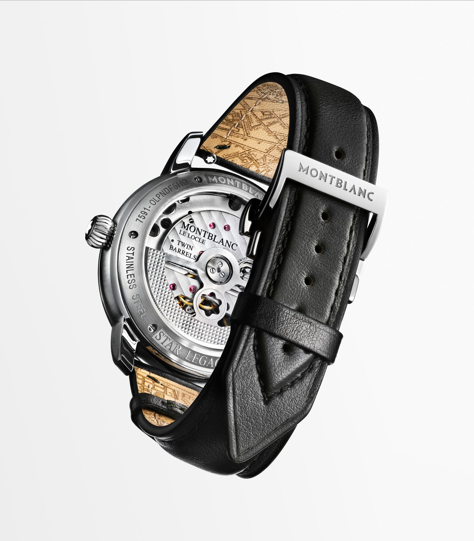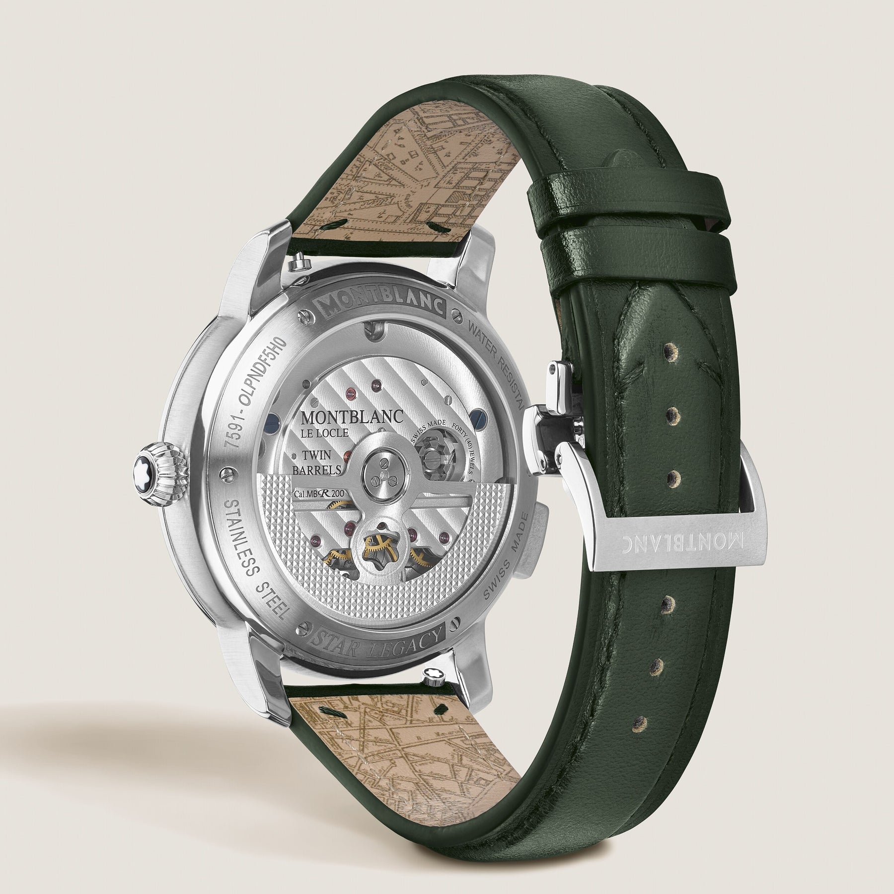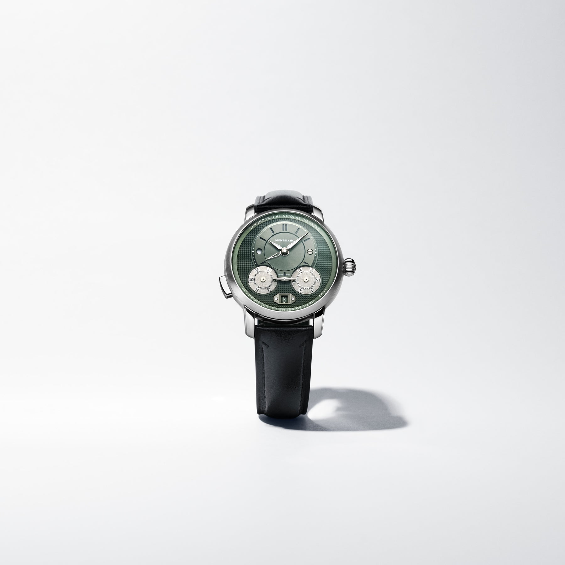 The Montblanc Star Legacy Nicolas Rieussec Chronograph reinforces the Parisian connection with many elements that celebrate the City of Light. A graphic Clous de Paris motif on the elegant green dial originates from the geomectric design of Paris's cobbled streets, and is continued onto the oscillating weight. A mention in French of the "Académie des Sciences de Paris" and "Chronographe Nicolas Rieussec" is engraved on the flange, as a reminder that the academy validated Rieussec's invention in 1821. The lining of the strap has also been enhanced with a map of Paris from 1821. The green interchangeable calf leather strap has been specially designed by Montblanc's Artistic Director Marco Tomasetta who found inspiration in the Maison's writing instrument nibs for its pointed shape. The timepiece comes in a 43 mm stainless steel case and is powered by the self-winding Manufacture monopusher chronograph movement MB R200.