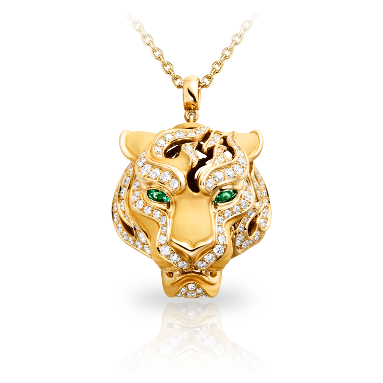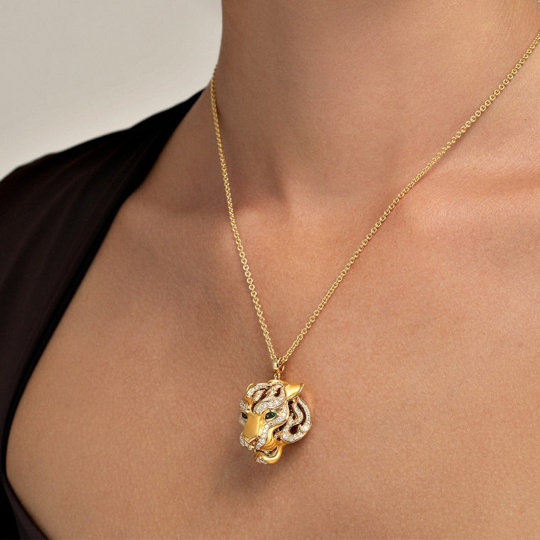 Experience the essence of nature with this exquisite pendant from the Vida collection. Crafted in 18KT yellow gold, it features 102 dazzling diamonds totaling 1.12 carats and two vibrant emeralds of 0.25 carats. With an average weight of 19.77 grams and a 45 cm chain, this piece embodies elegance, harmony, and a tribute to the wild.
