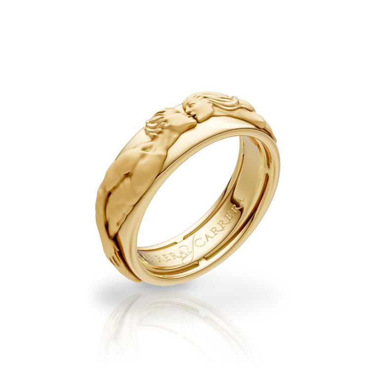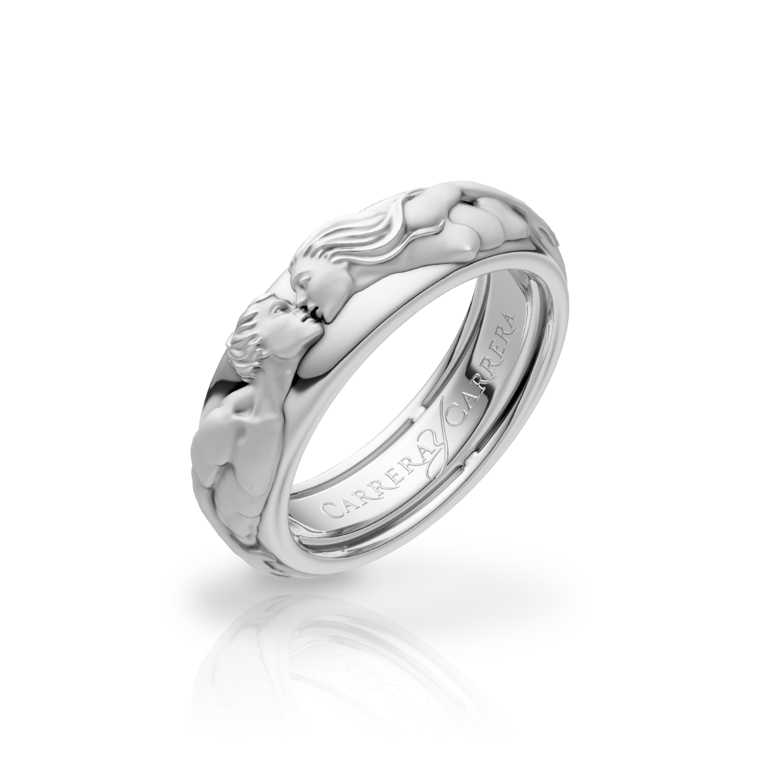 A sculptural wedding band that captures the poetry of a kiss. Its flowing curves embody the union of two souls who meet, promise, and remain forever intertwined in love.